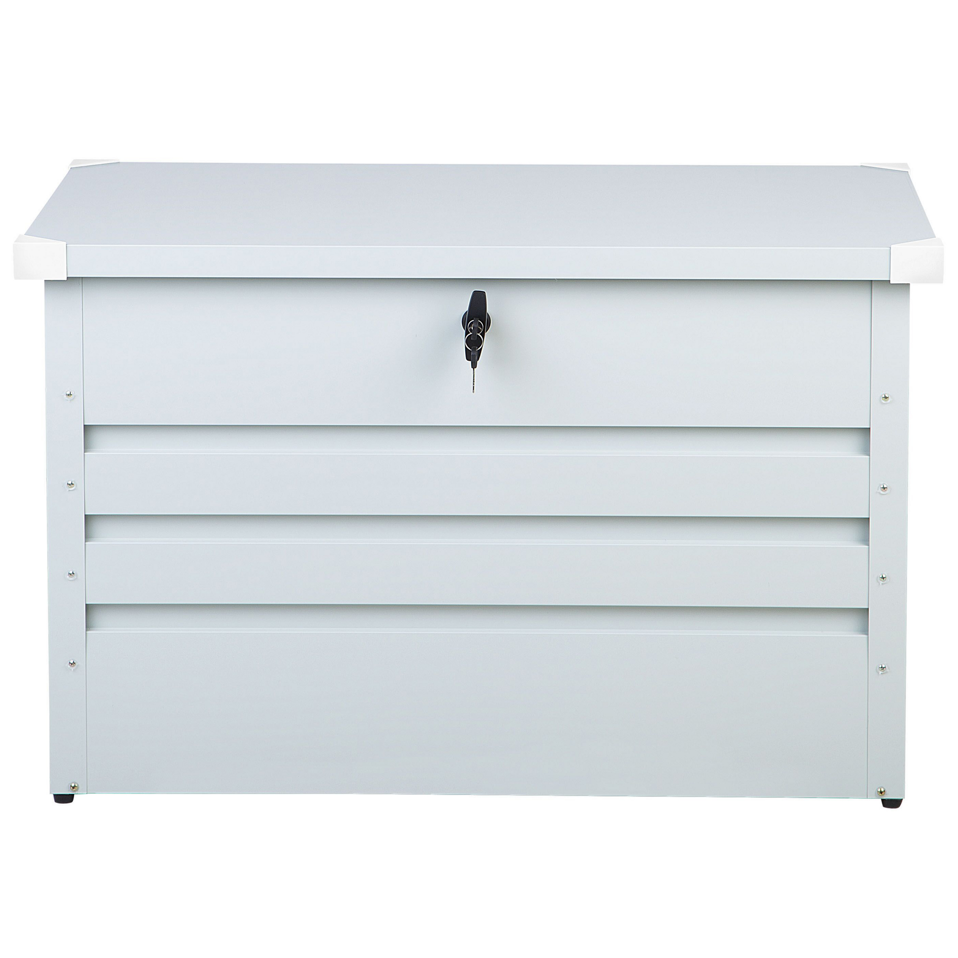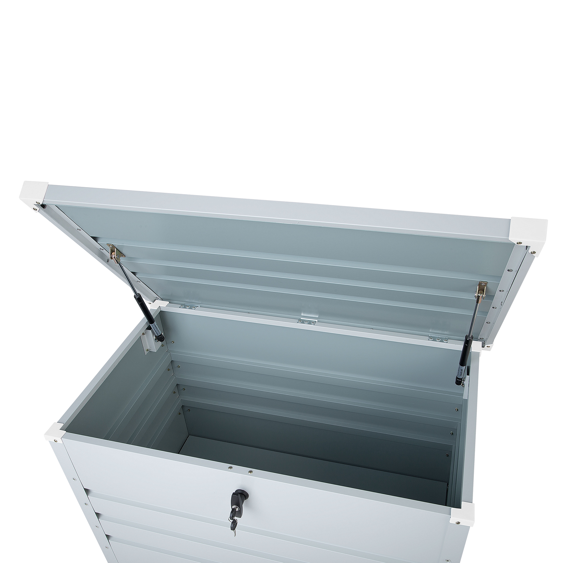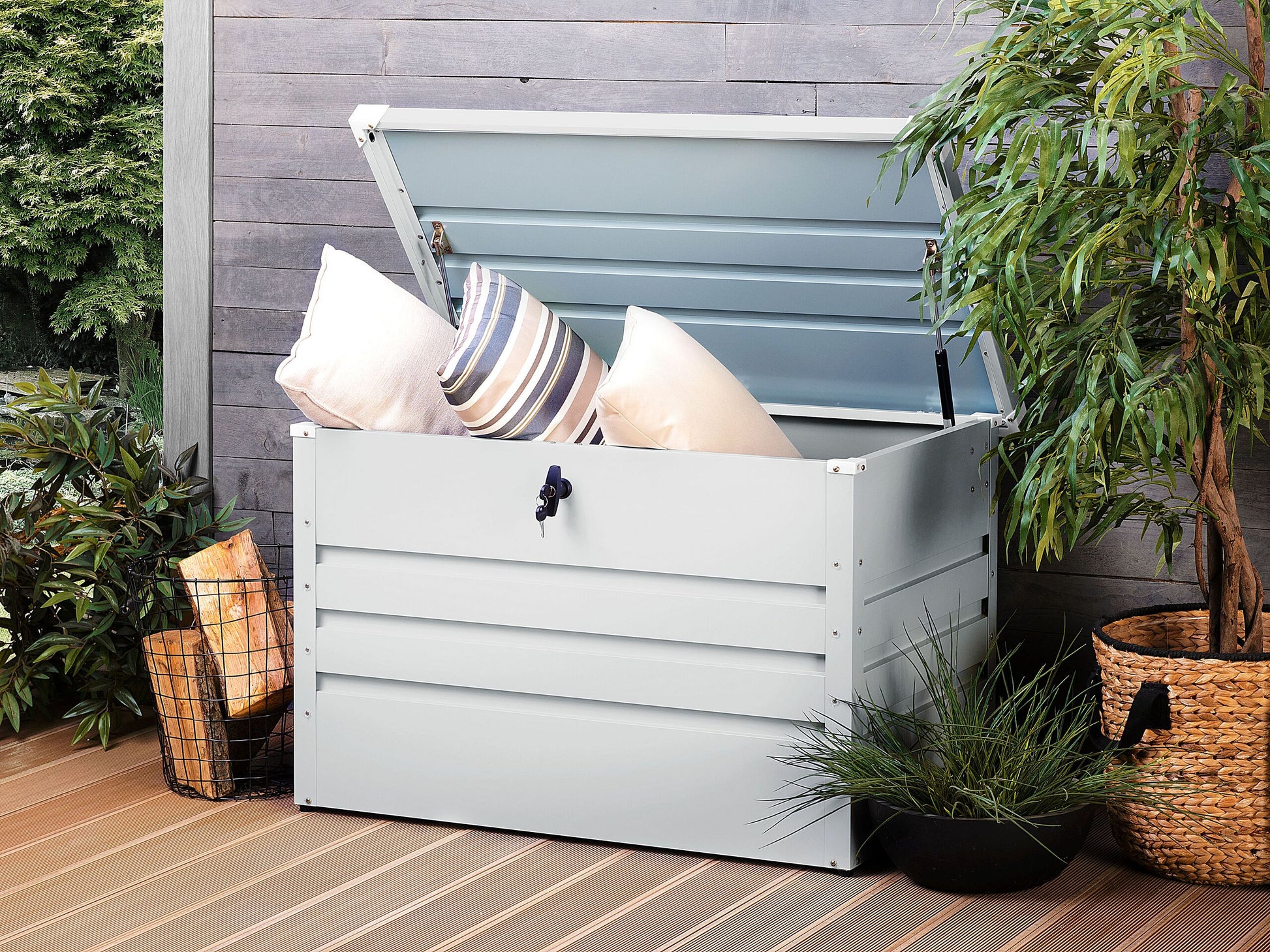In dieser hochwertigen, robusten verzinkten Stahltruhe finden Sie genügend Platz für all Ihre Garten-, Sport- oder Campingutensilien und schützen sie über das ganze Jahr vor jeglichen Wettereinflüssen. Der stabile, glatte Deckel lässt sich mit Hilfe des Drehgriff-Zylinderschlosses verschliessen und dank einer Gasdruckfeder leicht öffnen. Material: Stahl. Gewicht: 20 Montage: Nicht montiert Gewichtskapazität: 30 Das Angebot beinhaltet: 1 x Kissenbox Höhe: 64 Breite: 100 Tiefe: 62 Art: Aufbewahrungsbox Allgemeine Farbe: Grau Schatten: Hellgrau Hauptmaterial: Stahl