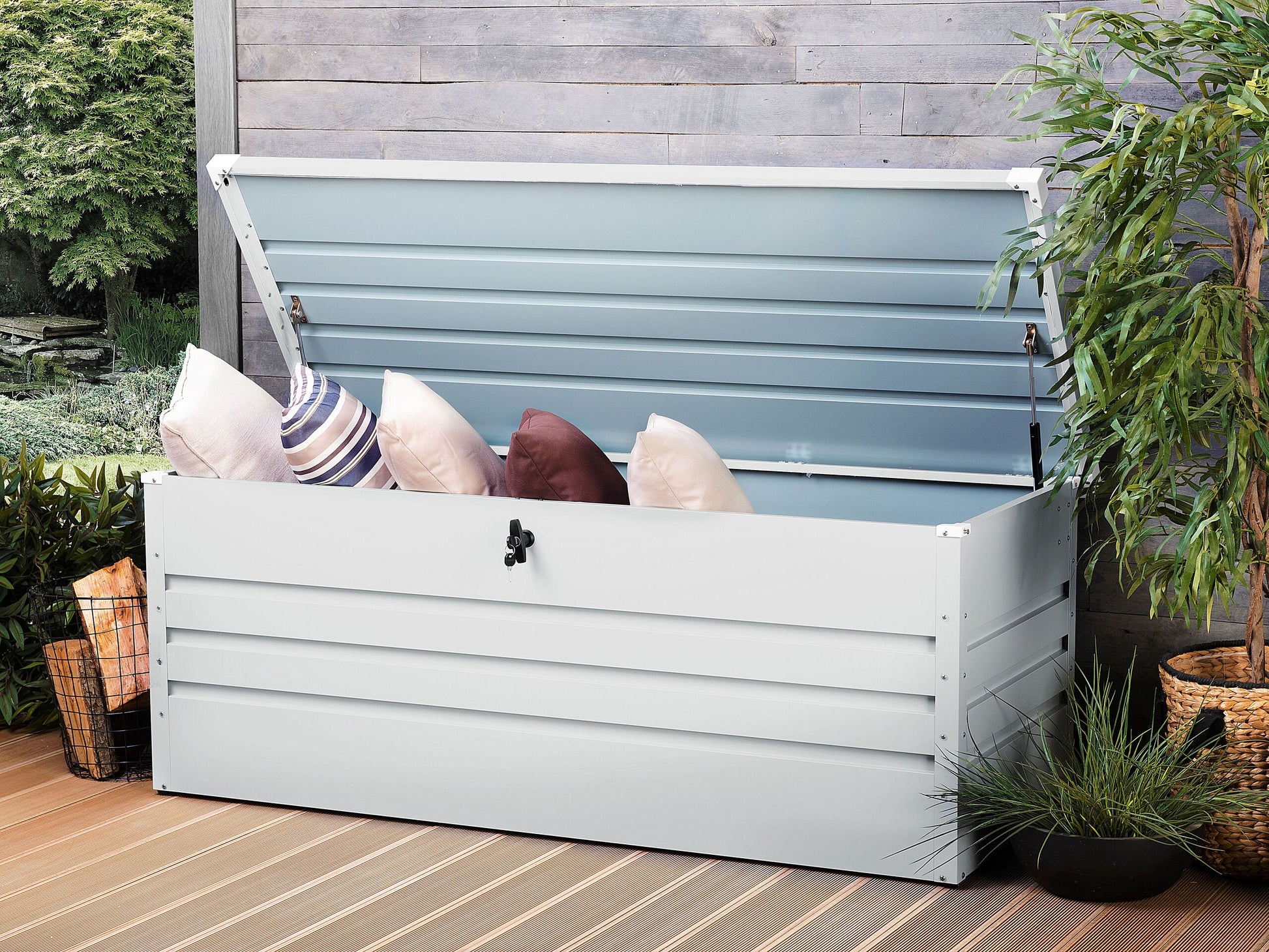 In dieser hochwertigen, robusten verzinkten Stahltruhe finden Sie genügend Platz für all Ihre Garten-, Sport- oder Campingutensilien und schützen sie über das ganze Jahr vor jeglichen Wettereinflüssen. Der stabile, glatte Deckel lässt sich mit Hilfe des Drehgriff-Zylinderschlosses verschliessen und dank einer Gasdruckfeder leicht öffnen. Material: Stahl. Gewicht: 31 Montage: Nicht montiert Gewichtskapazität: 80 Das Angebot beinhaltet: 1 x Kissenbox Höhe: 67 Breite: 165 Tiefe: 70 Art: Aufbewahrungsbox Allgemeine Farbe: Grau Schatten: Hellgrau Hauptmaterial: Stahl