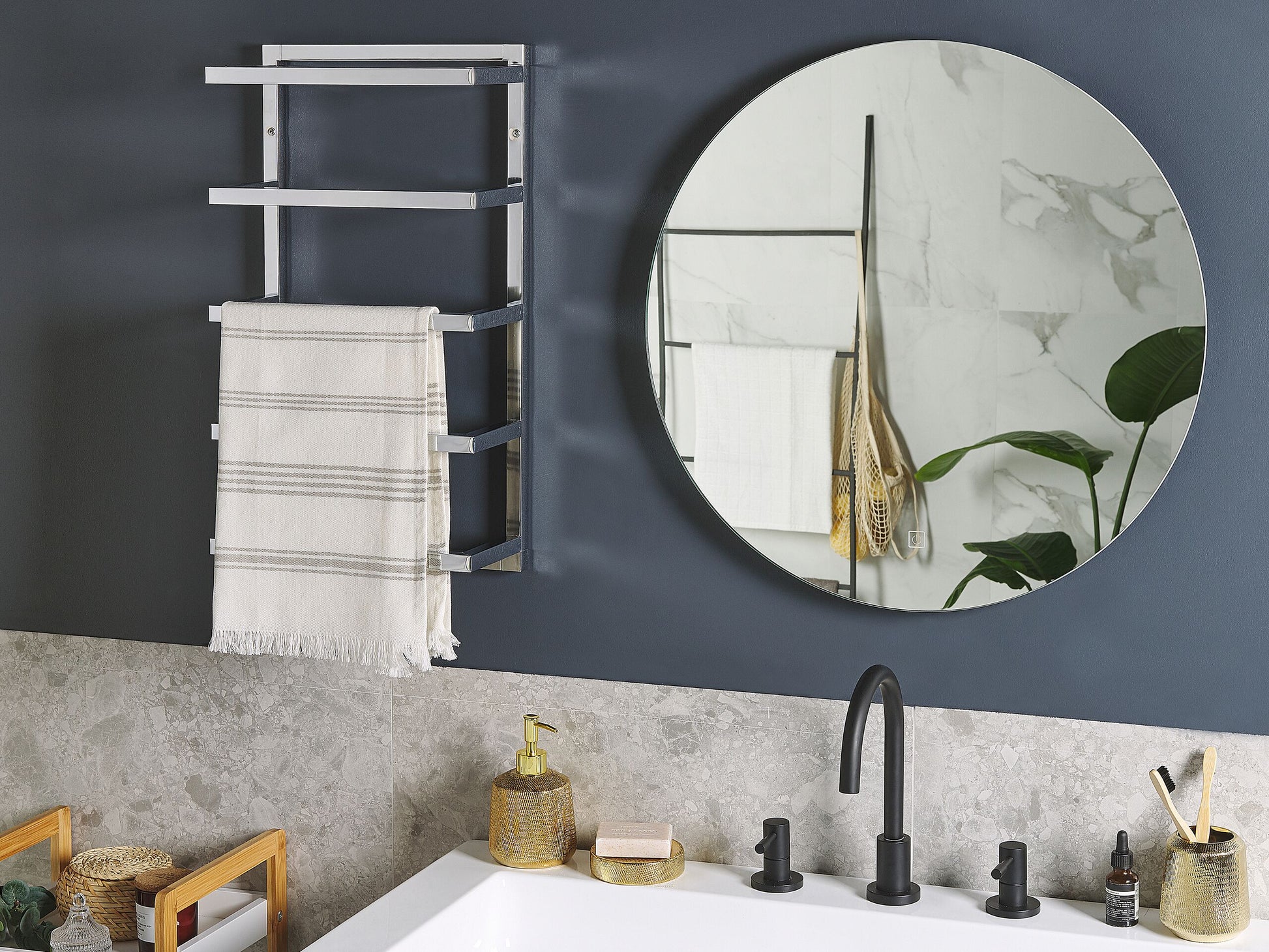 Haben Sie wenig Standplatz im Badezimmer aber benötigen einen geräumigen Handtuchhalter? Wenn ja, dann ist dieser Handtuchhalter wie für Sie geschaffen! Dieser Halter besteht aus 5 Stangen, an denen mehrere Handtücher platziert werden können. Der Handtuchhalter wurde aus pulverbeschichtetem Metall gefertigt und lässt sich problemlos an die Wand montieren, womit er gleichzeitig auch eine moderne Wanddekoration sein kann. Material: Stahl. Gewicht: 1.5 Montage: Teilweise montiert Gewichtskapazität: 2 Das Angebot beinhaltet: 1 x Handtuchhalter Höhe: 57 Breite: 31 Tiefe: 13 Art: Handtuchhalter Stil: Modern Allgemeine Farbe: Silber Hauptmaterial: Stahl