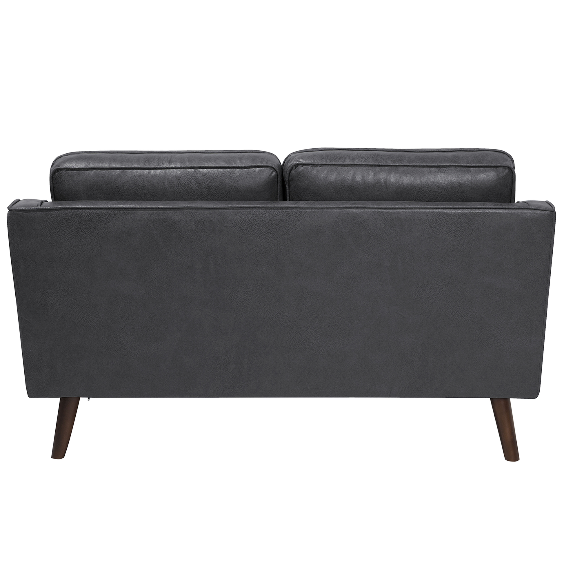 Schönes Design trifft auf optimalen Komfort - mit angenehm weichen Sitz-, Seiten- und Rückenkissen wird gemütliches Zusammensitzen zum puren Sitzvergnügen. Der 2-Sitzer hat einen grauen Rundumbezug aus hochwertigem Material, das die Struktur von Echtleder imitiert. Die schrägen Beine aus robustem Eichenholz verleihen dem Sofa zugleich einen behaglichen Retro Touch. Des bequeme Sofa ist der ideale, zentrale Treffpunkt in jedem modernen, klassischen und individualistischen Wohnstil.  Material: Kunstleder. Zusätzliches Material: Eichenholz, Eukalyptus.  Material Zusammensetzung: 100% Polyester Gewicht: 40 Kapazität: 2 Personen Montage: Nicht montiert Holzart: Quercus mongolica Holzursprung: China Kissen Abmessungen: 63x46 Beine Höhe: 18 Polsterstärke: 11 Sitzhöhe: 39 Das Angebot beinhaltet: 1 x Zweisitzer Sitzfläche: 104x58 Höhe: 85 zusätzliche Information: Die Beine befinden sich in einer praktischen Tasche unter dem Sitz. Breite: 150 Tiefe: 83 Art: 2 Sitzer Sofa Stil: Retro Allgemeine Farbe: Grau Schatten: Dunkelgrau Muster: Ohne Muster Hauptmaterial: Kunstleder Füllmaterial: Schaumstoff Arm Stil: Gerade