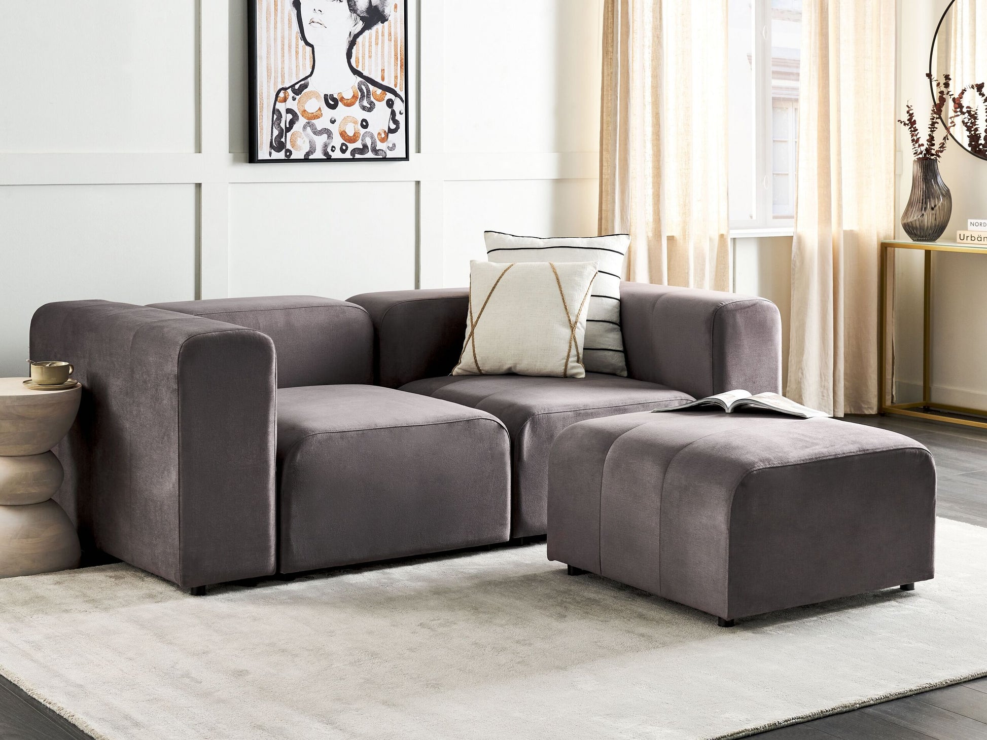 Auf diesem gemütlichen Polstersofa ist Ihnen ein 5-Sterne-Komfort immer gewiss. Es kombiniert, die Vorteile von einer tiefen Sitzfläche, breiten Armlehnen, einer niedrigen Rückenlehne und einer dicken Schaumstoff-Füllung perfekt miteinander. Zudem ist das gesamte Sofa mit einem geschmeidigen Samtbezug umhüllt und kann daher frei im Raum platziert werden. Die edle Ausstrahlung des Bezugs und die klare Linienführung der Couch sorgen für einen luxuriösen Look, der sich in jeder modernen Einrichtung zurechtfindet. Das Sofa besteht aus Modulteilen, die sich schnell mithilfe der Konnektoren zusammensetzen oder um weitere Modulelemente erweitern lassen. Den mitgelieferten Puf kann man als Abstellfläche für Zeitschriften oder Kaffeetassen, zusätzlichen Sitzplatz oder Fusshocker nutzen. Material: Samtstoff. Zusätzliches Material: Eukalyptus, Sperrholz, Kunststoff. Material Zusammensetzung: 100% Polyester Gewicht: 78 Kapazität: 2 Personen Montage: Nicht montiert Holzart: Eucalyptus grandis Holzursprung: China Beine Höhe: 4 Polsterstärke: 40 Osmanische Dimensionen: 75x74x44 Sitzhöhe: 44 Das Angebot beinhaltet: 1 x Zweisitzer, 1 x Ottomane Sitzfläche: 148x74 Höhe: 70 zusätzliche Information: Die Beine befinden sich in einer praktischen Tasche unter dem Sitz., Bitte beachten Sie, dass Samtstoff unter verschiedenen Lichtverhältnissen eine andere Optik haben kann – das Material schimmert bei Tageslicht stärker und wirkt bei künstlicher Beleuchtung in Innenräumen eher gedämpft. Aufgrund der glatten, hochdichten Struktur des Gewebes kann sein Farbton auch variieren, wenn man mit der Hand in verschiedene Richtungen und Winkel über den Stoff fährt. Um den Farbton auszugleichen und Druckstellen zu vermeiden, sollte der Webstoff sanft mit einer offenen Handfläche in eine Richtung gestrichen, mit einem feuchten Tuch abgewischt oder einem Dampfbügeleisen gebügelt werden. Breite: 204 Tiefe: 105 Art: 2-Sitzer Sofa mit Ottomane Stil: Modern Allgemeine Farbe: Grau Schatten: Dunkelgrau Muster: Ohne Muster Hauptmaterial: Samtstoff Füllmaterial: Schaumstoff Arm Stil: Gerade