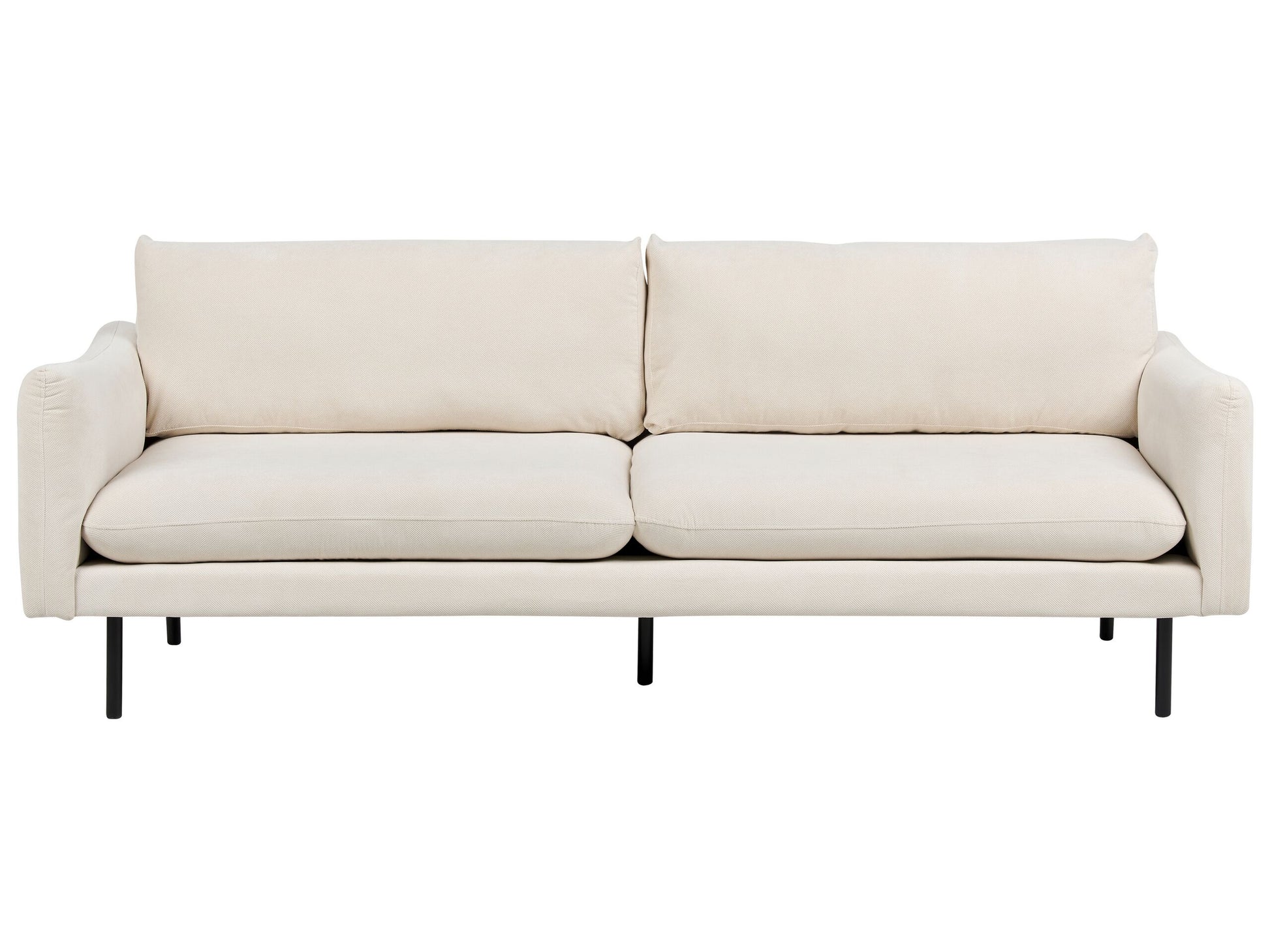 Dieses schlichte 3-Sitzer Wohnzimmersofa ist der Inbegriff von modernem Design. Es verfügt über eine robuste Holzkonstruktion, die für Stabilität sorgt, während der strapazierfähige Stoffbezug besondere Eleganz und eine angenehme Haptik verspricht. Dank der dicken, losen Sitz- und Rückenkissen sowie den schmalen, hohen Armlehnen können Sie mit einem optimalen Sitzkomfort rechnen. Dabei bietet das Samtsofa genügend Platz, um die Beine auszustrecken und ein Buch zu geniessen. Zudem sind die Kissenhüllen abnehmbar, so ist die Pflege des Dreisitzers ein Kinderspiel. Seine schmalen, schwarzen Metallbeine geben dem Sofa eine besondere Leichtigkeit – perfekt für eine stilvolle Einrichtung.  Material: Polyester. Zusätzliches Material: Kiefernholz, Sperrholz, Aluminium.  Material Zusammensetzung: 100% Polyester Gewicht: 53 Kapazität: 3 Personen Montage: Beine / Füsse nicht montiert Holzart: Pinus massoniana Holzursprung: Kanada Beine Höhe: 20 Polsterstärke: 15 Sitzhöhe: 44 Das Angebot beinhaltet: 1 x Dreisitzer Sitzfläche: 195x60 Höhe: 86 zusätzliche Information: Die Beine befinden sich in einer praktischen Tasche unter dem Sitz. Breite: 220 Tiefe: 84 Art: 3 Sitzer Sofa Stil: Minimalistisch Allgemeine Farbe: Beige Schatten: Hellbeige Muster: Ohne Muster Hauptmaterial: Polyester Füllmaterial: Schaumstoff Arm Stil: Gerade