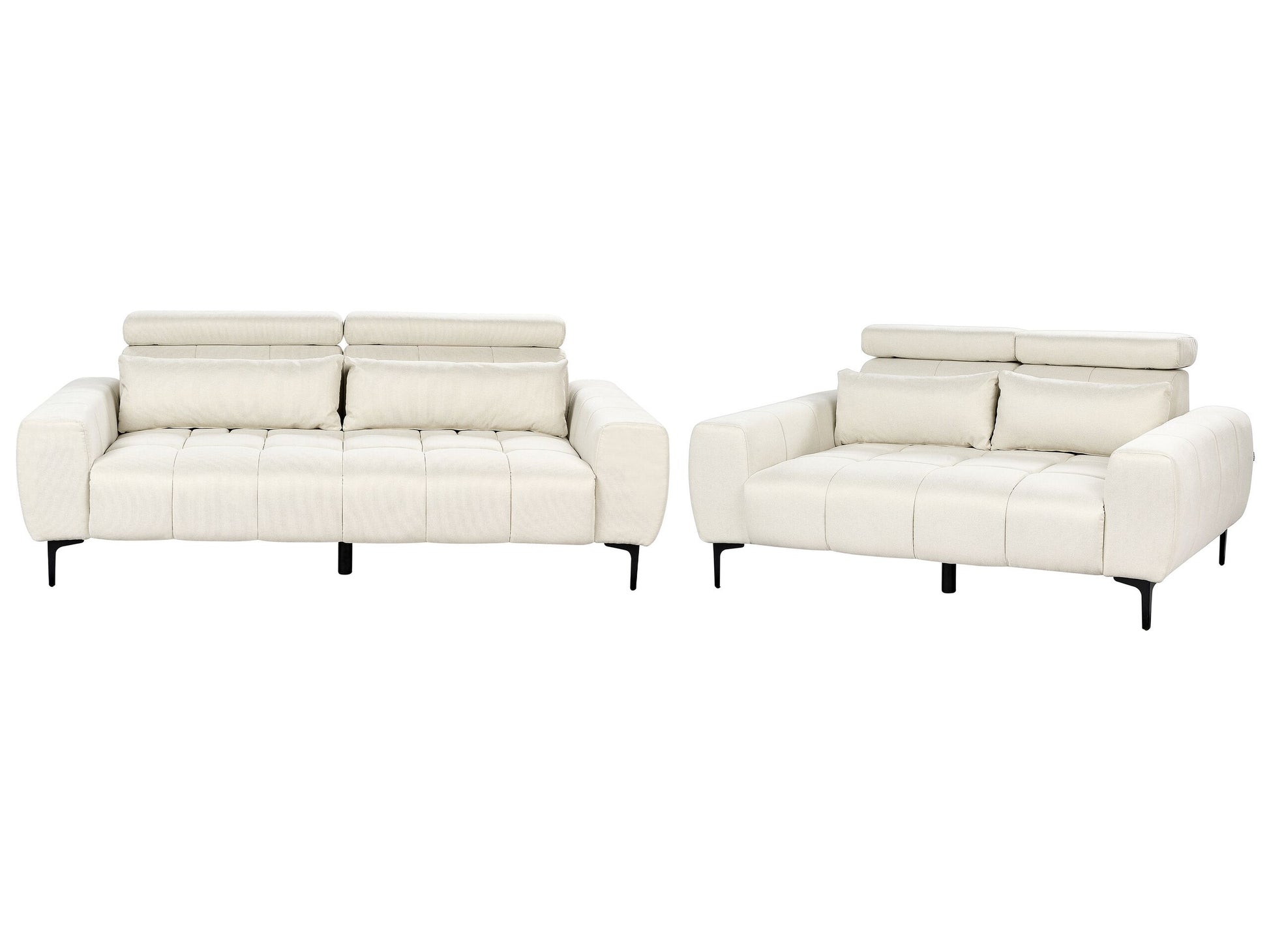 Beschreibung: Dank der Funktionsvielfalt und dicken Polsterung sitzen Sie auf dieser Sofagarnitur regelrecht wie auf einer Wolke. Die Tiefe der Sitzflächen lässt sich bequem mithilfe der individuell verschiebbaren Rückenlehnen regulieren. Für noch mehr Komfort sorgen die hochklappbaren Kopfstützen sowie die zusätzlichen Dekokissen und breiten Armlehnen. So kann jeder Sitzende jederzeit nach seinen eigenen Wünschen entspannen. Schlanke, schwarze Metallbeine sorgen für eine komfortable Sitzhöhe. Ergänzt werden die Wolkensofas mit gesteppten Stoffbezügen, die sich durch ihre angenehme Oberfläche, Strapazierfähigkeit und Pflegeleichtigkeit auszeichnen. Material: Polyester. Zusätzliches Material: Stahl, Eukalyptus. Material Zusammensetzung: 100% Polyester Gewicht: 132 Kapazität: 5 Personen Montage: Teilweise montiert Holzart: Eucalyptus grandis Holzursprung: China Gesamtabmessungen: 218x85x97 Kissen Abmessungen: 64/84x17/19x30 Beine Höhe: 17 Polsterstärke: 17 3 Sitzer Sofa Abmessungen: 218x110x97 2 Sitzer Sofa Abmessungen: 176x110x97 Sitzhöhe: 46 Das Angebot beinhaltet: 1 x Dreisitzer, 1 x Zweisitzer, 4 x Zierkissen Art: Wohnzimmer Set Stil: Modern Allgemeine Farbe: Weiss Schatten: Creme Hauptmaterial: Polyester Füllmaterial: Schaumstoff Arm Stil: Gerade