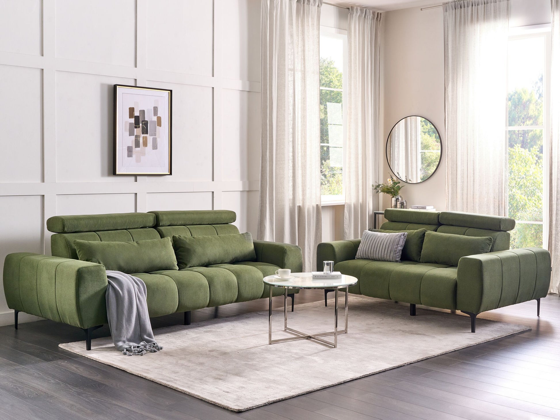 Dank der Funktionsvielfalt und dicken Polsterung sitzen Sie auf dieser Sofagarnitur regelrecht wie auf einer Wolke. Die Tiefe der Sitzflächen lässt sich bequem mithilfe der individuell verschiebbaren Rückenlehnen regulieren. Für noch mehr Komfort sorgen die hochklappbaren Kopfstützen sowie die zusätzlichen Dekokissen und breiten Armlehnen. So kann jeder Sitzende jederzeit nach seinen eigenen Wünschen entspannen. Schlanke, schwarze Metallbeine sorgen für eine komfortable Sitzhöhe. Ergänzt werden die Wolkensofas mit gesteppten Stoffbezügen, die sich durch ihre angenehme Oberfläche, Strapazierfähigkeit und Pflegeleichtigkeit auszeichnen. Material: Polyester. Zusätzliches Material: Stahl, Eukalyptus. Material Zusammensetzung: 100% Polyester Gewicht: 132 Kapazität: 5 Personen Montage: Teilweise montiert Holzart: Eucalyptus grandis Holzursprung: China Gesamtabmessungen: 218x85x97 Kissen Abmessungen: 64/84x17/19x30 Beine Höhe: 17 Polsterstärke: 17 3 Sitzer Sofa Abmessungen: 218x110x97 2 Sitzer Sofa Abmessungen: 176x110x97 Sitzhöhe: 46 Das Angebot beinhaltet: 1 x Dreisitzer, 1 x Zweisitzer, 4 x Zierkissen Art: Wohnzimmer Set Stil: Modern Allgemeine Farbe: Grün Hauptmaterial: Polyester Füllmaterial: Schaumstoff Arm Stil: Gerade Stoff gepolstert zurück: Ja