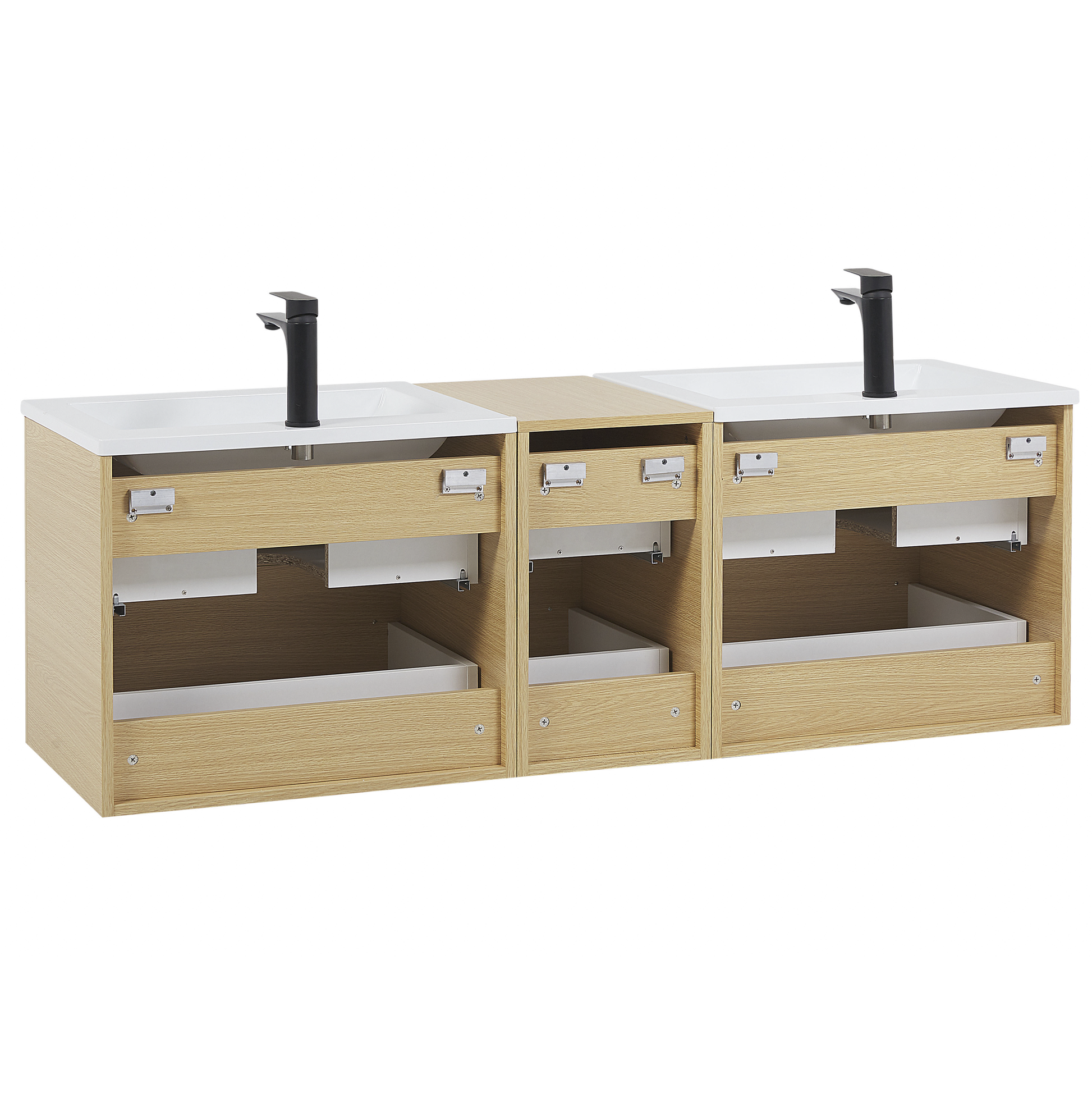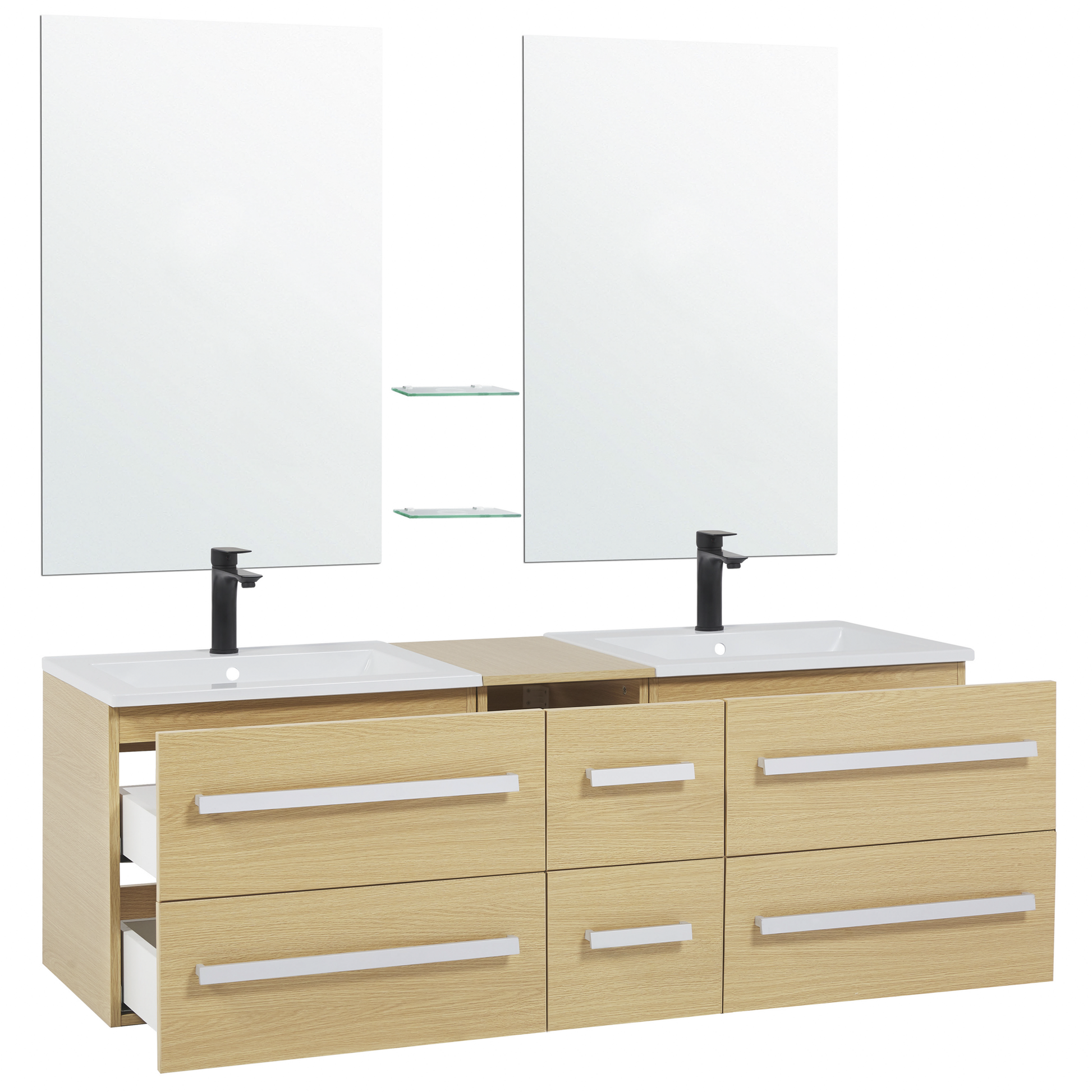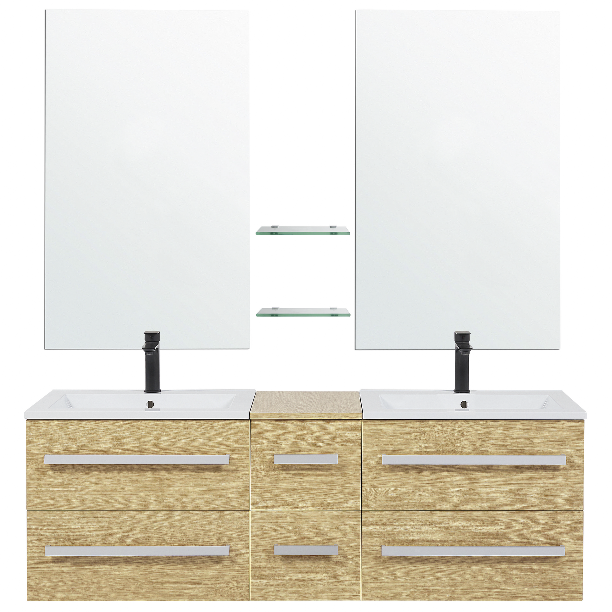Das moderne und stilvolle Badmöbelset stattet Ihr Badezimmer mit enorm viel Stauraum und Abstellfläche aus. Sie erhalten zwei Hängeschränke und einen schmalen, mittleren Schrank, mit insgesamt 6 praktischen Schubladen, die über ein Soft-Close-System verfügen. Die Schränke sind aus robustem MDF und Spanplatte gefertigt, mit einer hochwertigen Melaminbeschichtung in hellem Holzlook. Dank des hochwertigen SMC-Kunststoffes profitieren Sie von der Langlebigkeit des Waschbeckens. Siphon und Abflussrohre gehören nicht zum Lieferumfang. Material: MDF-Platte. Zusätzliches Material: SMC-Kunststoff, Spanplatte. Gewicht: 90 Montage: Erfordert Installation und Montage Gewichtskapazität: 15 Das Angebot beinhaltet: 1 x Hängeschrank, 2 x Spiegel, 2 x Waschbecken, 2 x Glasregale, Nicht im Lieferumfang enthalten: Armatur Höhe: 48 Breite: 150 Tiefe: 45 Art: Badezimmerschrank mit Spiegel Stil: Klassisch Allgemeine Farbe: Heller Holzfarbton Hauptmaterial: MDF-Platte