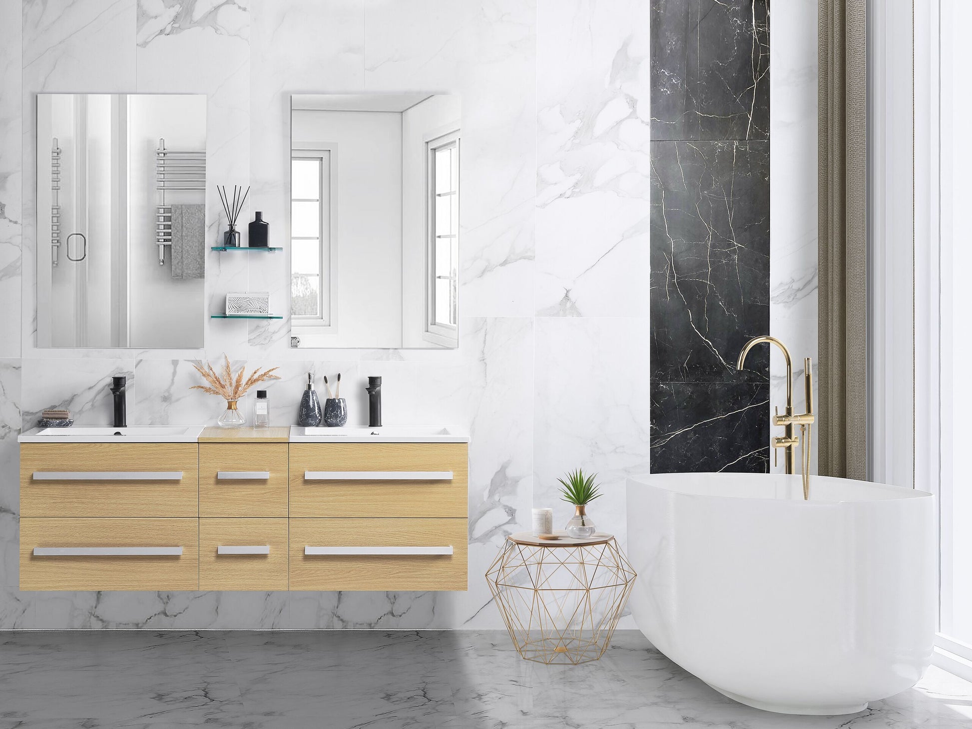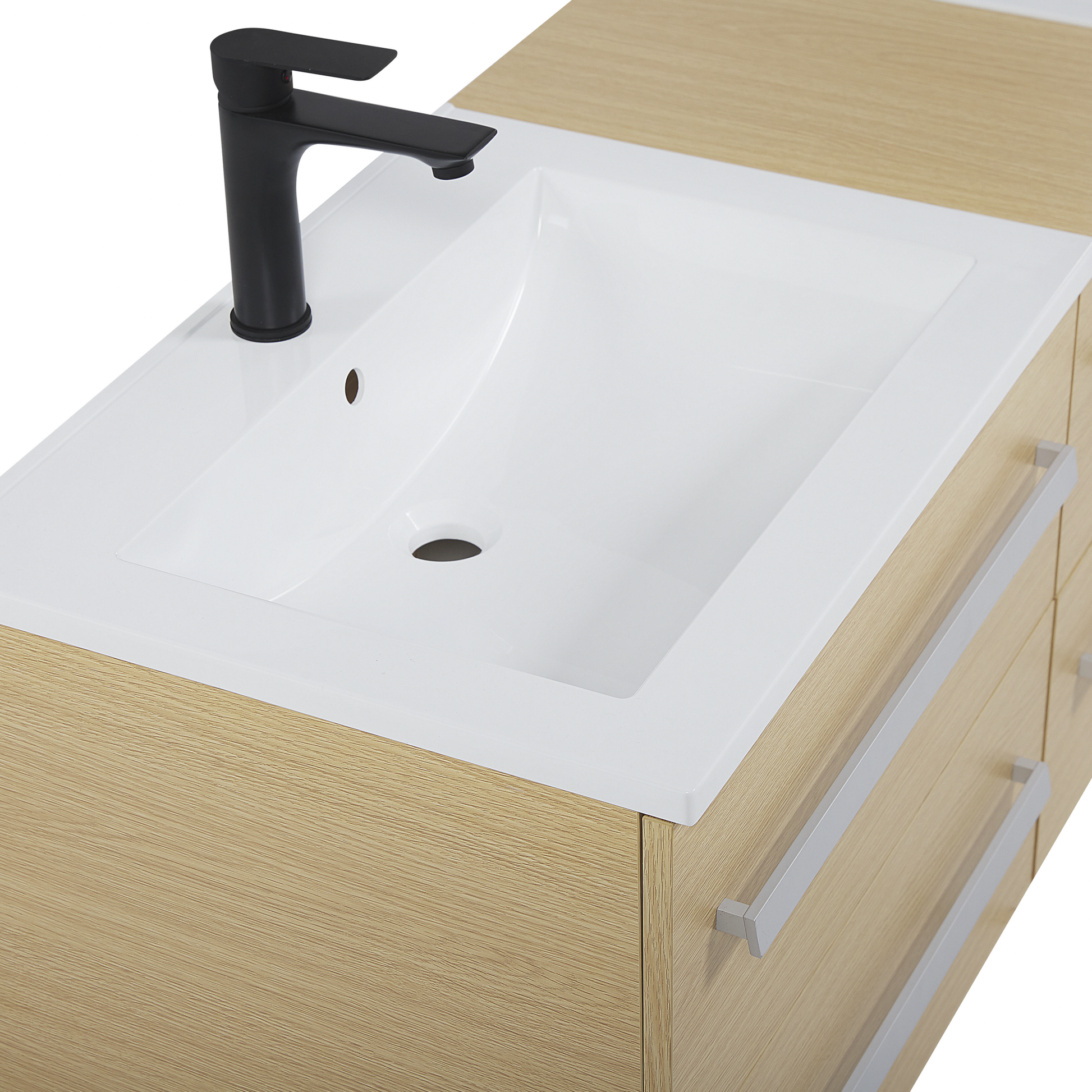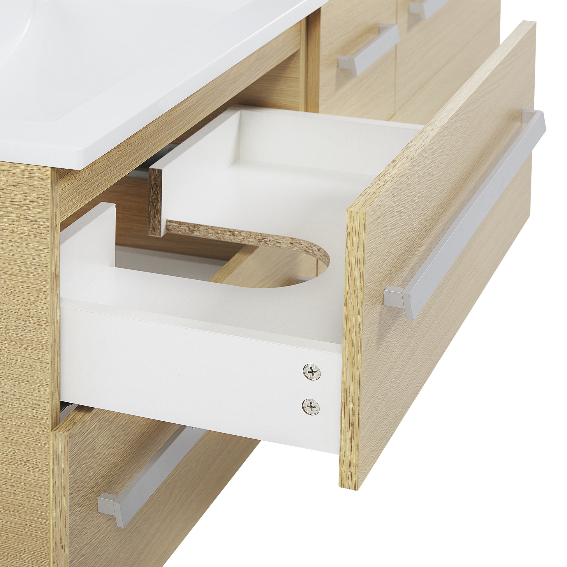 Das moderne und stilvolle Badmöbelset stattet Ihr Badezimmer mit enorm viel Stauraum und Abstellfläche aus. Sie erhalten zwei Hängeschränke und einen schmalen, mittleren Schrank, mit insgesamt 6 praktischen Schubladen, die über ein Soft-Close-System verfügen. Die Schränke sind aus robustem MDF und Spanplatte gefertigt, mit einer hochwertigen Melaminbeschichtung in hellem Holzlook. Dank des hochwertigen SMC-Kunststoffes profitieren Sie von der Langlebigkeit des Waschbeckens. Siphon und Abflussrohre gehören nicht zum Lieferumfang. Material: MDF-Platte. Zusätzliches Material: SMC-Kunststoff, Spanplatte. Gewicht: 90 Montage: Erfordert Installation und Montage Gewichtskapazität: 15 Das Angebot beinhaltet: 1 x Hängeschrank, 2 x Spiegel, 2 x Waschbecken, 2 x Glasregale, Nicht im Lieferumfang enthalten: Armatur Höhe: 48 Breite: 150 Tiefe: 45 Art: Badezimmerschrank mit Spiegel Stil: Klassisch Allgemeine Farbe: Heller Holzfarbton Hauptmaterial: MDF-Platte