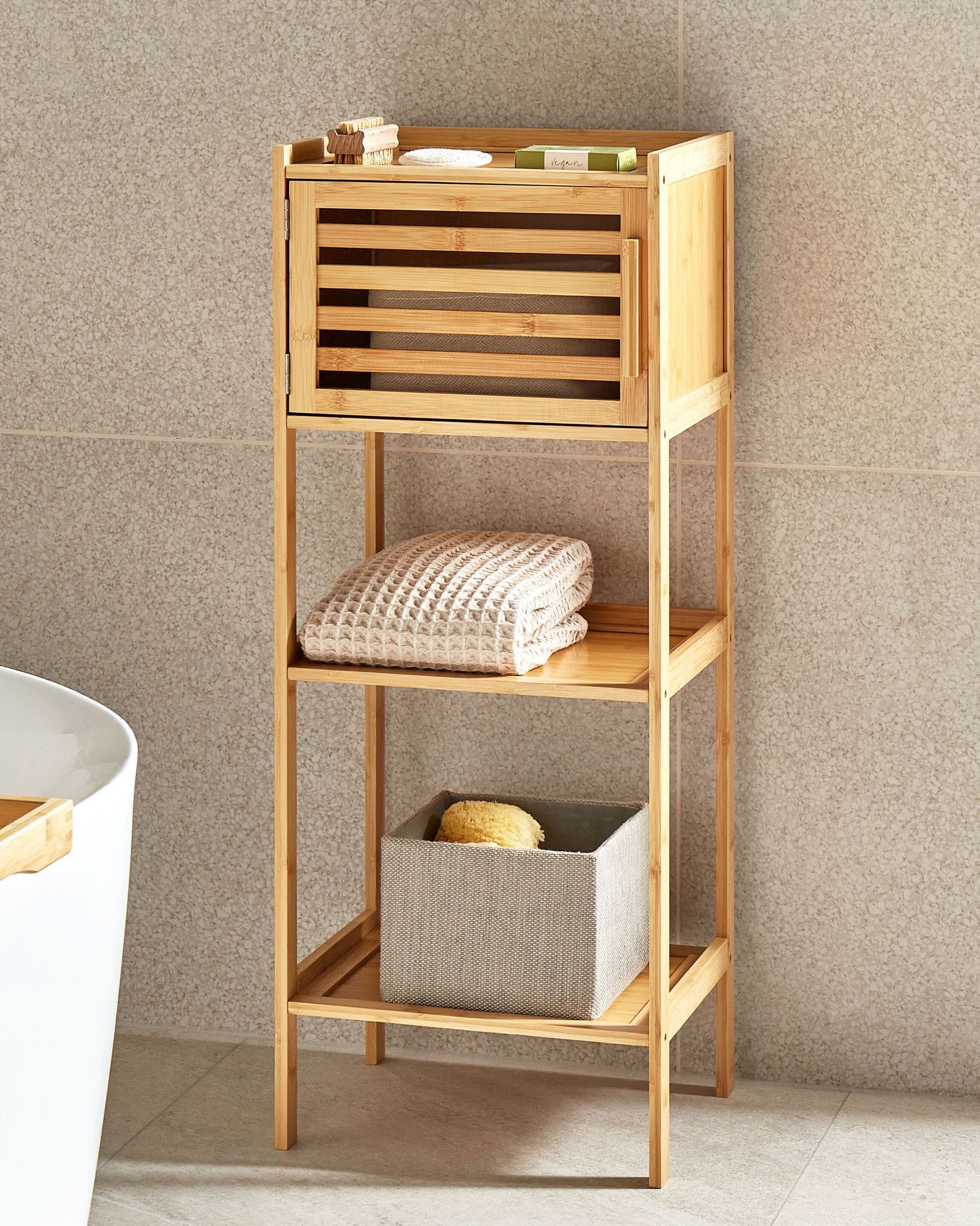 Dieses kompakte Bambusregal ist eine stilvolle und nachhaltige Aufbewahrungslösung für Ihre Wohnräume. Es verfügt über 3 Regalböden, die reichlich Platz für Ihre Toilettenartikel, Handtücher oder andere wichtige Dinge bieten. Hinter der Lamellen-Schranktür können Sie alles unterbringen, was Sie lieber ausser Sichtweite halten möchten. Die Holzkonstruktion verleiht Ihrem Badezimmer nicht nur einen warmen Look, sondern ist auch langlebig und widerstandsfähig gegen Feuchtigkeit. Dieses Regal beweist sich besonders in kleineren Räumen und verbindet Funktionalität mit umweltfreundlichem Design. Material: Bambusholz. Gewicht: 4 Montage: Teilweise montiert Holzart: Bambusa vulgaris Holzursprung: China Beine Höhe: 12 Das Angebot beinhaltet: 1 x Regal Höhe: 91 zusätzliche Information: Holz ist ein Naturprodukt. Farb- und Strukturunterschiede, Narben, Falten und sonstige Naturmerkmale sind Echtheitsbeweise und keine zur Reklamation berechtigende Fehler. Breite: 36 Tiefe: 30 Art: Regal Stil: Boho Allgemeine Farbe: Heller Holzfarbton Hauptmaterial: Bambusholz