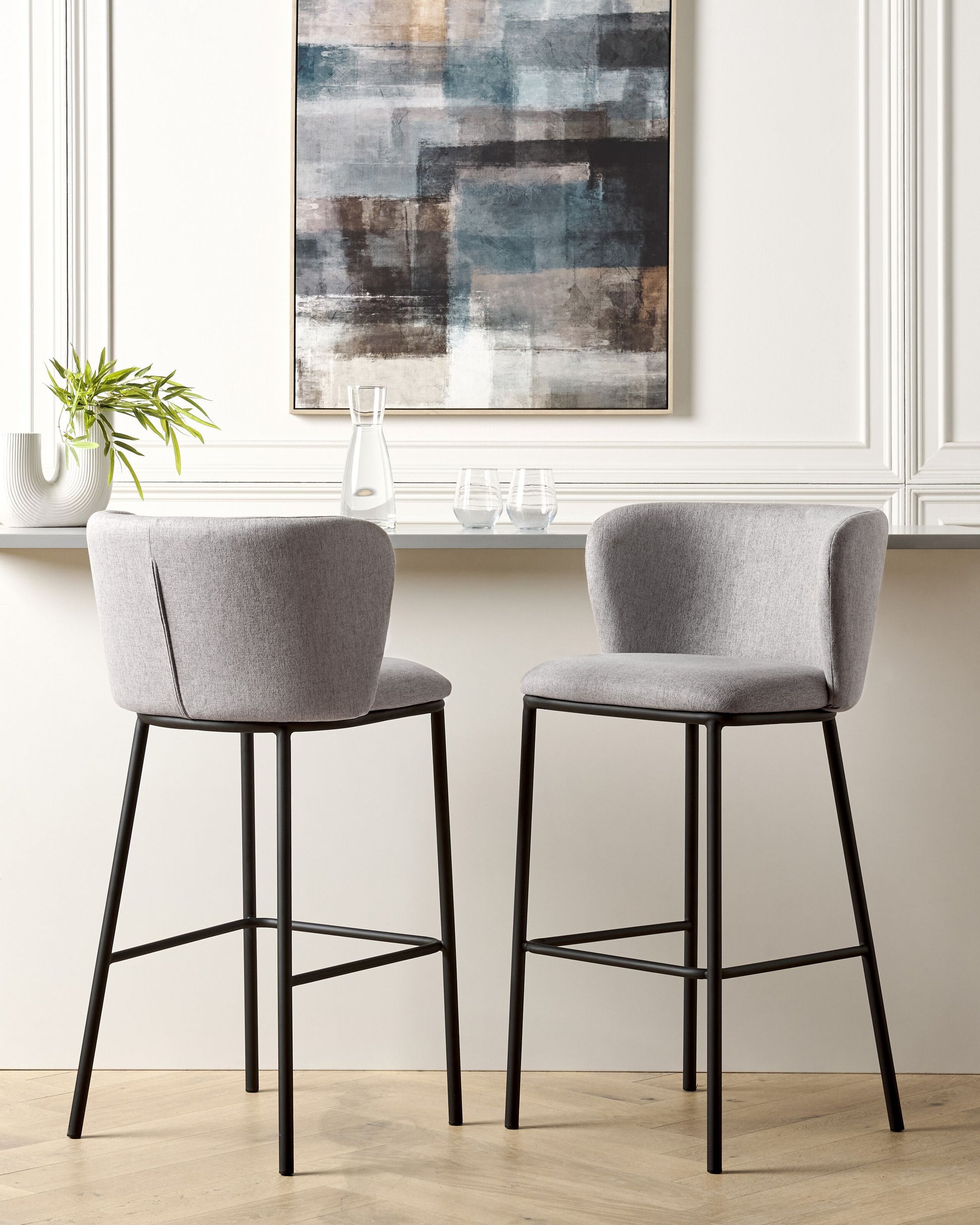 Geben Sie Ihrem Esszimmer mit diesen stilvollen Polsterstühlen den letzten Schliff. Die Stühle sind aus strapazierfähigem, grauem Stoff und schwarzen, pulverbeschichteten Metallbeinen gefertigt. Dank diesen hochwertigen Materialien werden sie viele Jahre halten und Ihre Einrichtung auf eine völlig neue Ebene bringen. Beide Stühle haben leicht geschwungene, niedrige Rückenlehnen und bieten dank ihres Designs einen hohen Sitzkomfort. Sie können sogar platzsparend unter den Tresen geschoben werden, wenn sie nicht gebraucht werden. Material: Polyester. Zusätzliches Material: Eisen, Sperrholz. Material Zusammensetzung: 100% Polyester Gewicht: 7 Montage: Beine / Füsse nicht montiert Gewichtskapazität: 150 Polsterstärke: 6 Sitzhöhe: 73 Das Angebot beinhaltet: 2 x Barstuhl Sitzfläche: 47x42 Höhe: 98 zusätzliche Information: Um sicherzustellen, dass die Konstruktion stabil und die Nutzungssicherheit gewährleistet ist, sollte man 2 Wochen nach dem Zusammenbau überprüfen, ob die Ware auch korrekt montiert wurde. Ausserdem ist alle 3 Monate zu prüfen, ob die Schrauben richtig festgezogen sind. Breite: 52 Tiefe: 46 Art: Set mit 2 Barstühlen Stil: Modern Allgemeine Farbe: Grau Hauptmaterial: Polyester