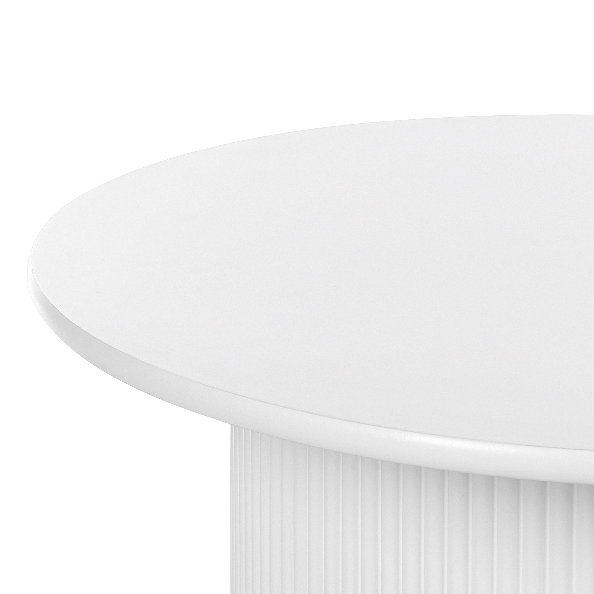 Dieser niedrige Salontisch wird schnell zu einem wichtigen Bestandteil Ihres Wohnzimmers. Sowohl sein runder Standfuss als auch seine passende Tischplatte bestehen aus robusten, weiss bemalten MDF-Platten. Dank der zusätzlichen Lackierung und der hochwertigen Materialwahl zeichnet sich der Tisch durch seine Langlebigkeit und Pflegeleichtigkeit aus, sodass Sie auch ohne täglichen Pflegeaufwand jahrelang Freude an seinem trendigen Look haben werden. Seine breite, runde Tischfläche liefert genügend Freiraum für Dekoartikel oder Ihre Lieblingsblumen und eignet sich perfekt, um Getränke oder Snacks abzustellen. Der grosse Sockel garantiert nicht nur Stabilität, er punktet auch mit seiner angesagten Lamellen-Optik. Material: MDF-Platte. Zusätzliches Material: MDF-Platte. Gewicht: 7 Montage: Benötigt keine Montage Gewichtskapazität: 10 Das Angebot beinhaltet: 1 x Couchtisch Höhe: 31 Gestalten: Rund Breite: 60 Länge: 60 Art: Couchtisch Stil: Modern Allgemeine Farbe: Weiss Hauptmaterial: MDF-Platte