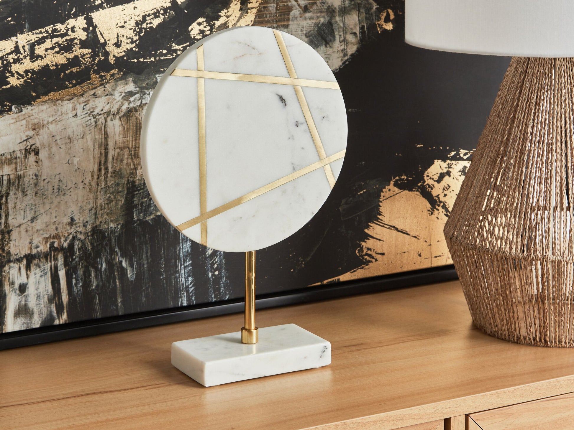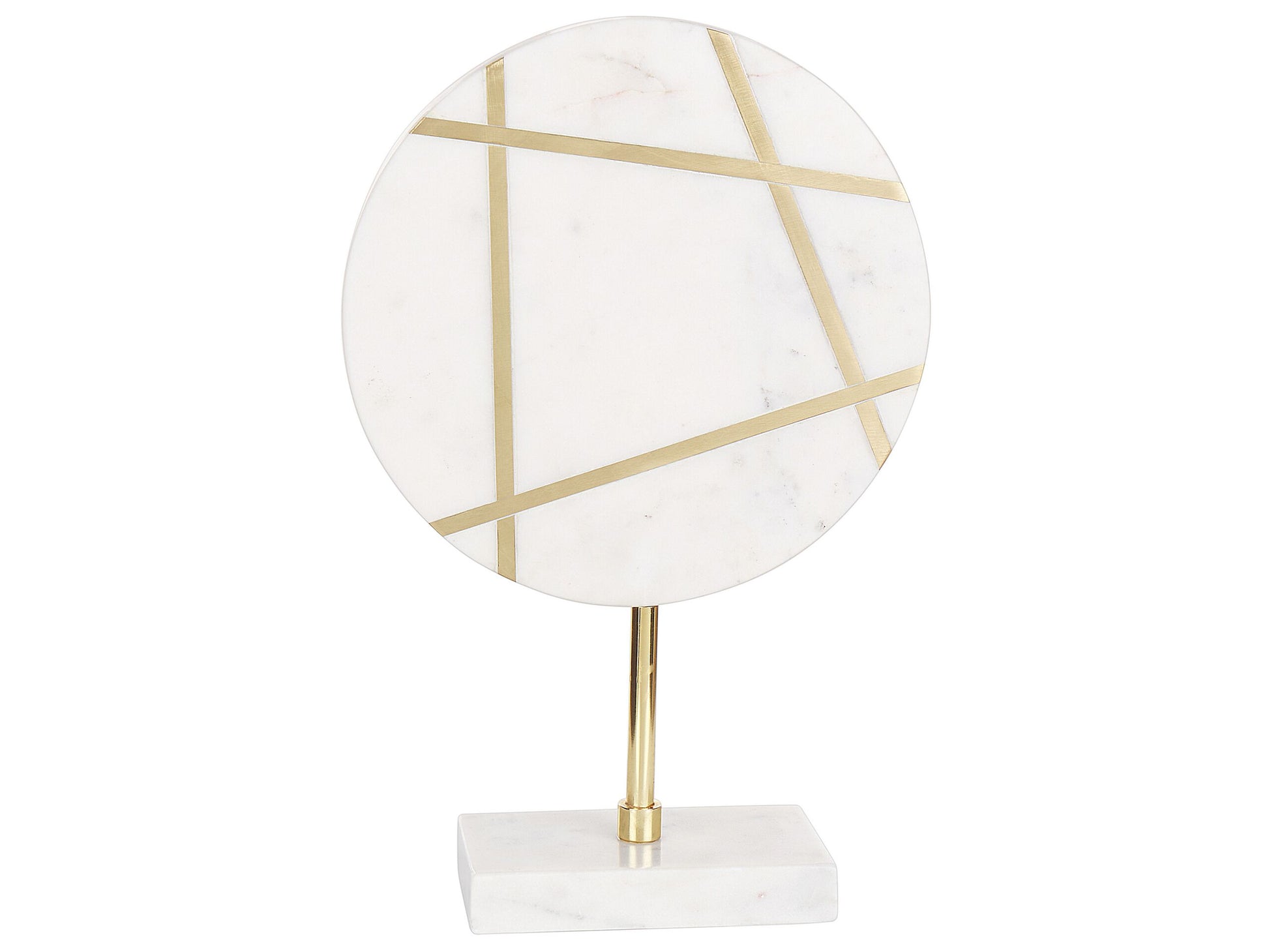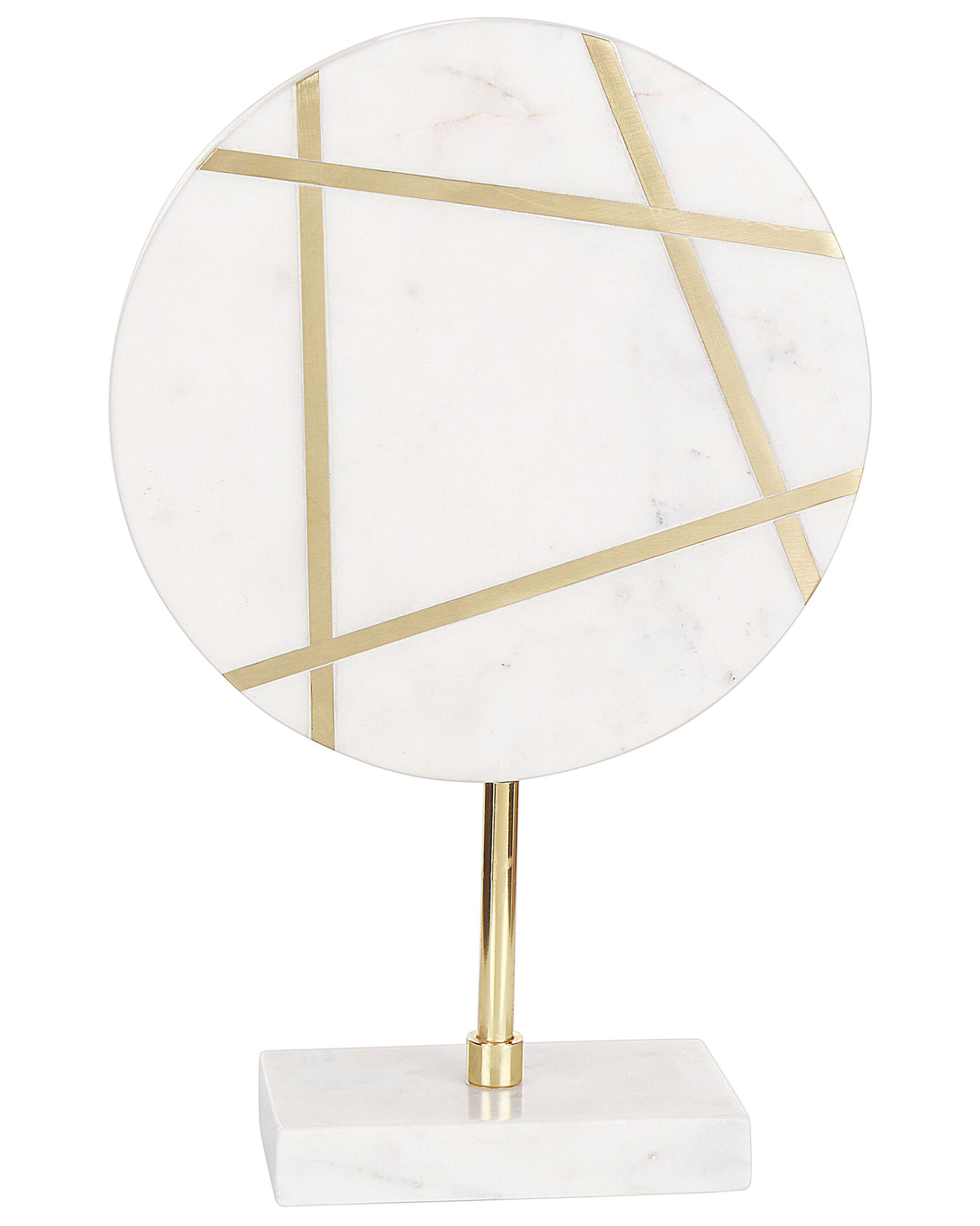 Ob im Büro, im Wohnzimmer oder im Eingangsbereich - dieser beeindruckende Marmor ist in jedem Raum ein Blickfang und verleiht jedem Raum einen Hauch von Raffinesse und Modernität. Die auf einem stabilen Sockel platzierte Scheibe, die von feinen Messinglinien durchzogen wird, bildet ein faszinierendes geometrisches Muster, das Luxus und Raffinesse ausstrahlt. Handgefertigt aus langlebigen und pflegeleichten Materialien, ist dieses Stück eine wunderbare, zeitlose Dekoration, die zweifellos Aufmerksamkeit erwecken wird. Material: Marmor. Zusätzliches Material: Messing. Gewicht: 2 Montage: Benötigt keine Montage Das Angebot beinhaltet: 1 x Dekoration Höhe: 31 zusätzliche Information: Da jedes Produkt handgefertigt wird, kann es zu kleineren Abweichungen in der Farbe und der äusseren Struktur kommen. Diese Abweichungen stellen keinen Qualitätsmangel dar, sondern sind eine warentypische Eigenschaft. Breite: 20 Tiefe: 7 Art: Dekofigur Stil: Glamourös Allgemeine Farbe: Weiss Hauptmaterial: Marmor