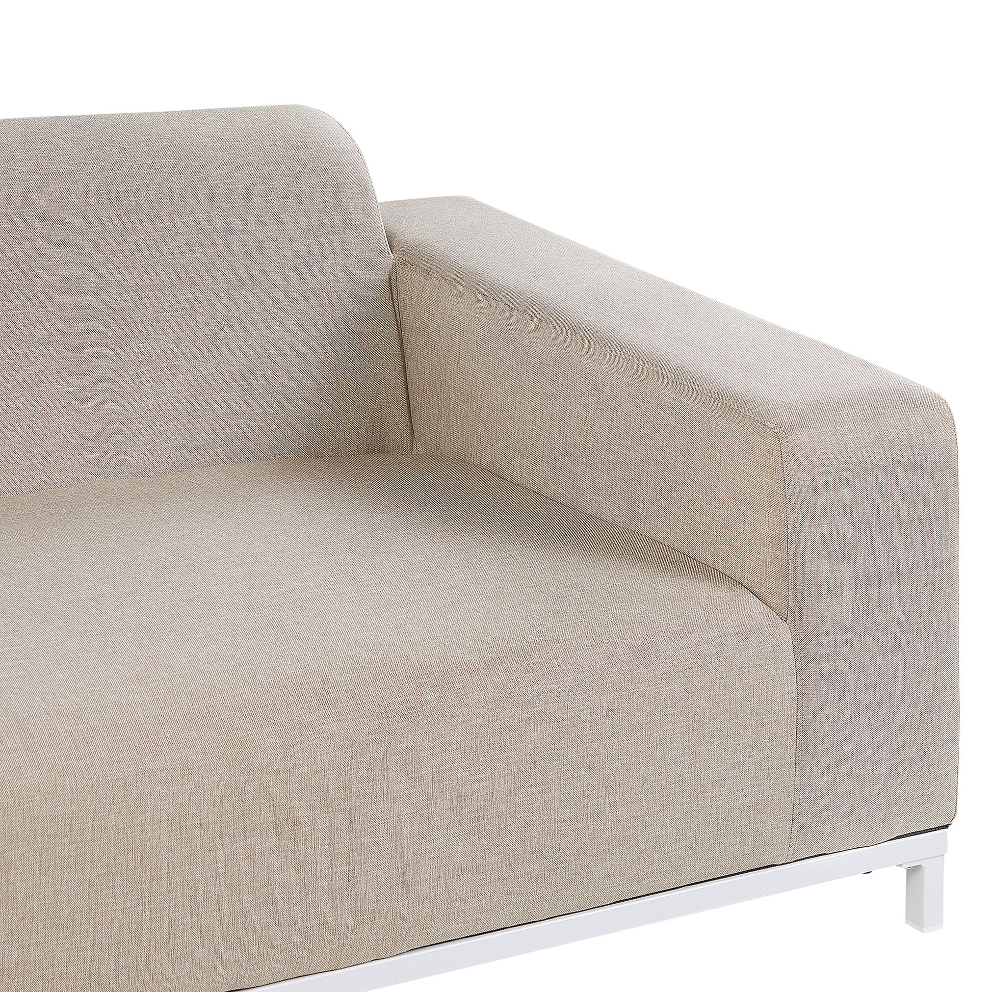 Dieses Sofa ist perfekt für eine ganzjährige Nutzung im Innen- und Aussenbereich geeignet. Der edle, beige Bezugsstoff ist aus Polyester gefertigt. Das Möbel ist im Inneren mit einem schnell trocknenden Schaumstoff gepolstert, welcher Wasser dank seiner speziellen Struktur wesentlich schneller durchlaufen lässt als hochelastische Schaumstoffe. Die Anwendung von atmungsaktiven Materialien sorgt für eine ausgezeichnete Luftzirkulation und befördert schnelles Trocknen, auch nach starkem Regen. Material: Polyester. Zusätzliches Material: Aluminium, Quick Dry-Schaum . Material Zusammensetzung: 100% Polyester Gewicht: 27.5 Kapazität: 3 Personen Montage: Beine / Füsse nicht montiert Beine Höhe: 11 Polsterstärke: 27 Sitzhöhe: 38 Das Angebot beinhaltet: 1 x Dreisitzer Sitzfläche: 142x58 Höhe: 68 zusätzliche Information: Längerer Kontakt mit Wasser kann zu Verfärbungen und Verformungen führen., Es ist nicht empfehlenswert, die Möbel bei schlechterem Wetter nur unter einer Abdeckung draussen stehen zu lassen. In der Nebensaison empfehlen wir, die Möbel drinnen an einem trockenen und kühlen Ort aufzubewahren. Breite: 186 Tiefe: 84 Art: 3 Sitzer Sofa Stil: Modern Allgemeine Farbe: Beige Schatten: Sandbeige Hauptmaterial: Polyester