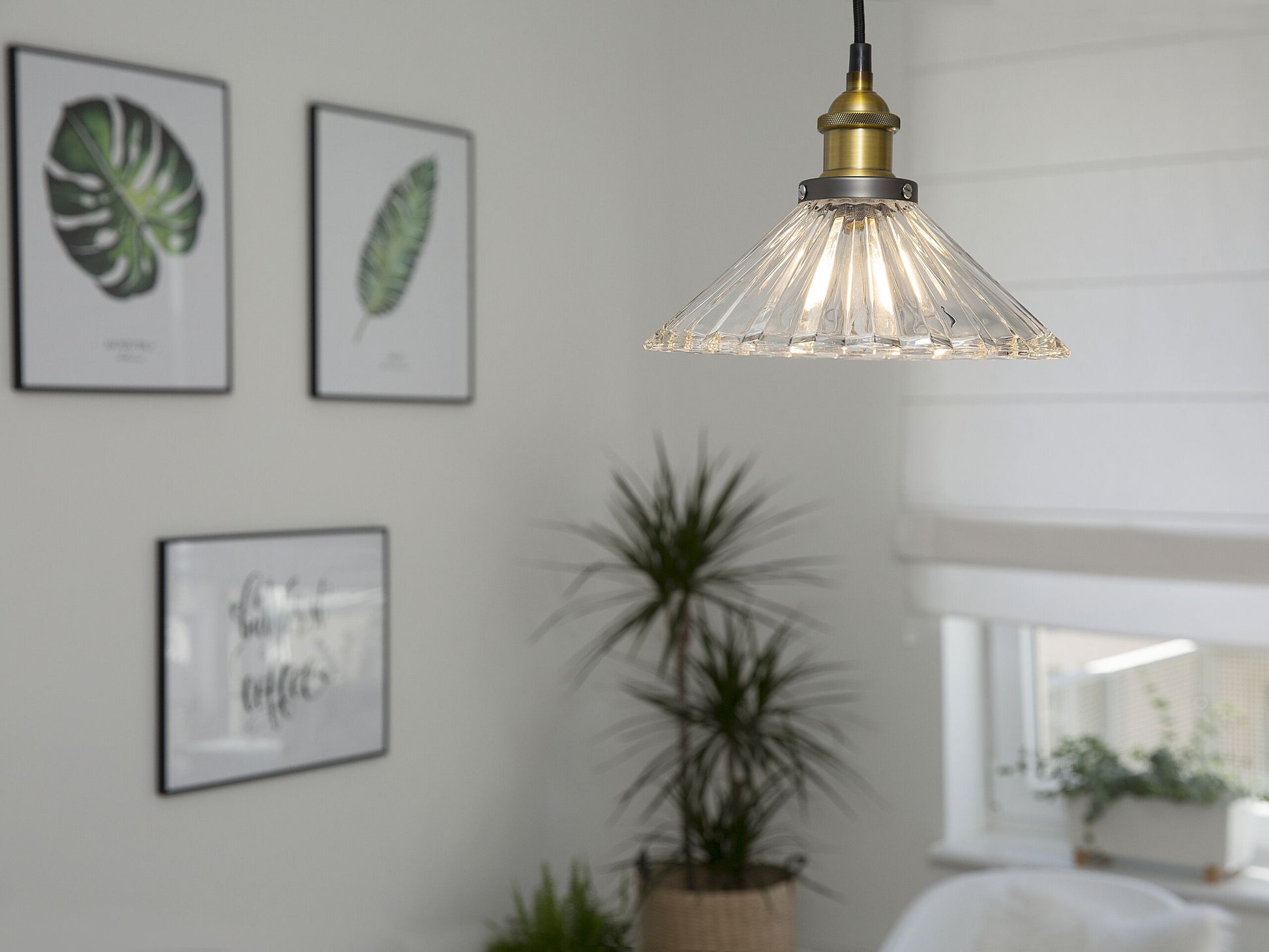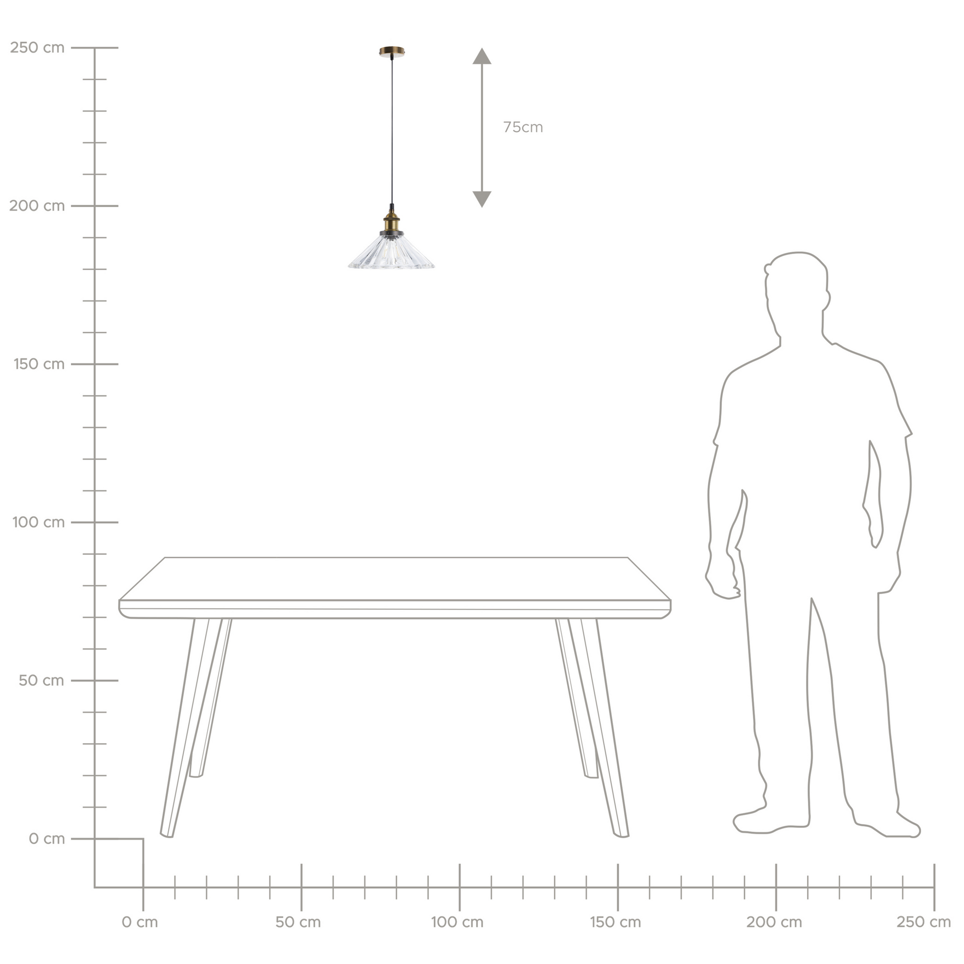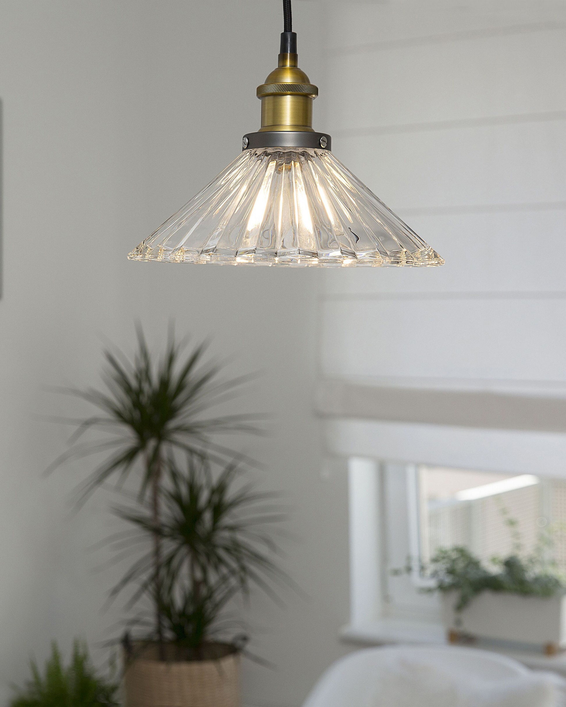 Die klassische Formgebung des konisch geformten Lampenschirms und der gelungene Materialmix verleihen dieser Hängeleuchte ihre nostalgische Ausstrahlung. Der runde Lampenschirm aus Glas hat eine gewellte Struktur und sorgt für helles, strahlendes Licht mit schönen Lichteffekten. Das messingfarbene Verbindungsstück aus Metall gibt der Leuchte zugleich eine charakterische Note. Die Hängelampe ist mit einem schwarzen Textilkabel ausgestattet. Material: Glas. Zusätzliches Material: Textil, Metall. Gewicht: 1 Montage: Erfordert Installation und Montage Das Angebot beinhaltet: 1 x Hängeleuchte, Nicht im Lieferumfang enthalten: Leuchtmittel Höhe: 96 zusätzliche Information: Diese Leuchte ist geeignet für Leuchtmittel der Energieklassen A bis G auf einer Skala von A (sehr effizient) bis G (weniger effizient). Geeignet für: LED Leuchtmittel, Eco-Halogen Leuchtmittel, Energiesparleuchtmittel., Die Stromkabel dürfen nur von einem qualifizierten Elektriker angepasst werden. Breite: 25 Tiefe: 25 Art: Hängelampe Stil: Retro Allgemeine Farbe: Transparent Hauptmaterial: Glas Fassung: Max. 40 W IP Protection Code: IP 20