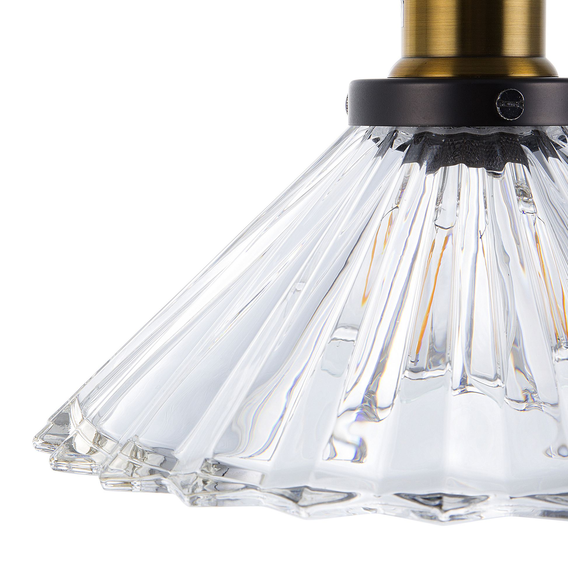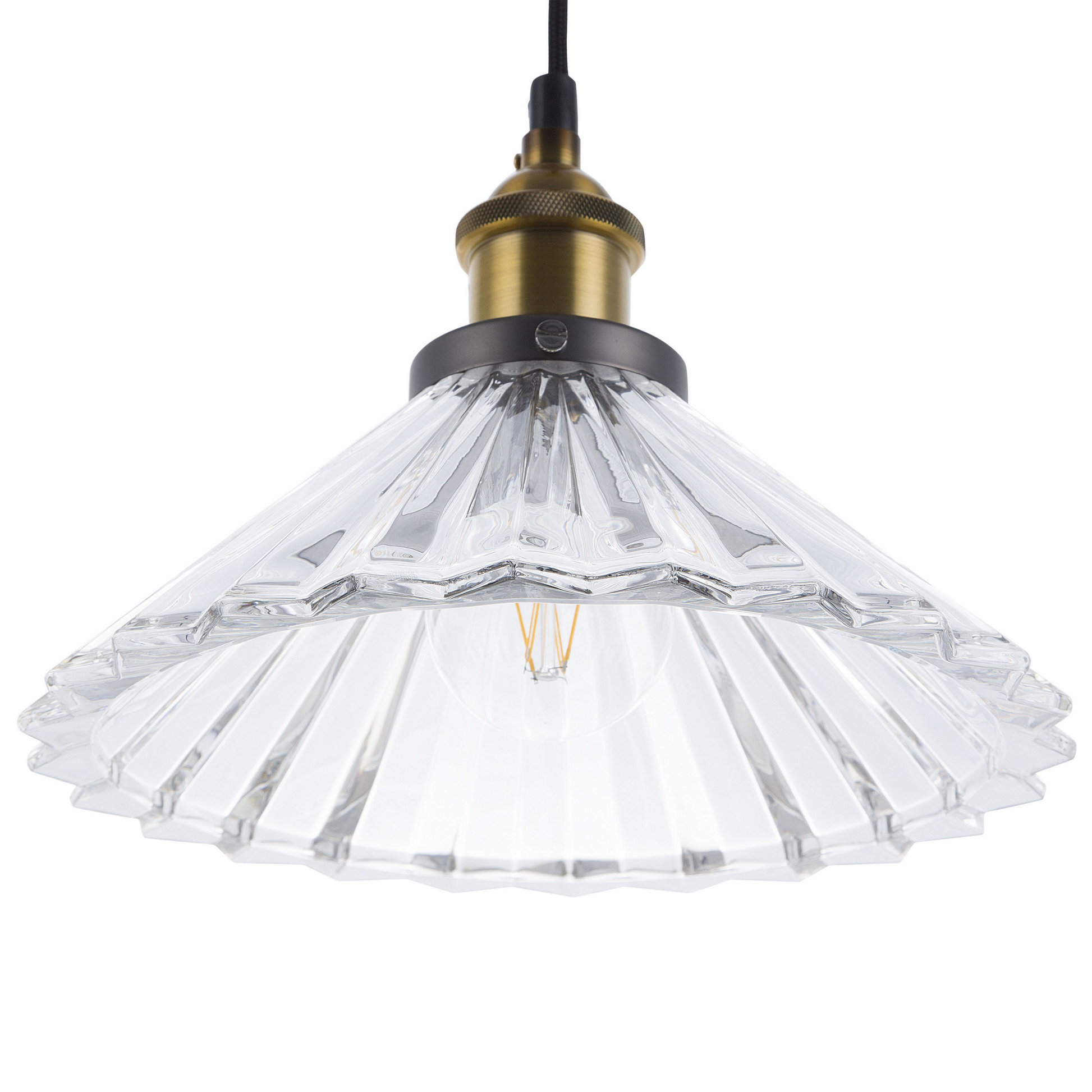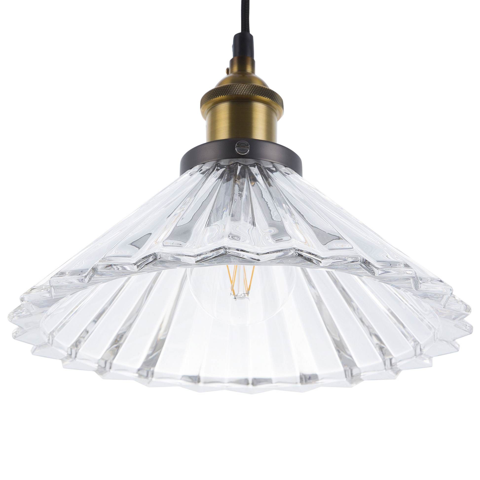 Die klassische Formgebung des konisch geformten Lampenschirms und der gelungene Materialmix verleihen dieser Hängeleuchte ihre nostalgische Ausstrahlung. Der runde Lampenschirm aus Glas hat eine gewellte Struktur und sorgt für helles, strahlendes Licht mit schönen Lichteffekten. Das messingfarbene Verbindungsstück aus Metall gibt der Leuchte zugleich eine charakterische Note. Die Hängelampe ist mit einem schwarzen Textilkabel ausgestattet. Material: Glas. Zusätzliches Material: Textil, Metall. Gewicht: 1 Montage: Erfordert Installation und Montage Das Angebot beinhaltet: 1 x Hängeleuchte, Nicht im Lieferumfang enthalten: Leuchtmittel Höhe: 96 zusätzliche Information: Diese Leuchte ist geeignet für Leuchtmittel der Energieklassen A bis G auf einer Skala von A (sehr effizient) bis G (weniger effizient). Geeignet für: LED Leuchtmittel, Eco-Halogen Leuchtmittel, Energiesparleuchtmittel., Die Stromkabel dürfen nur von einem qualifizierten Elektriker angepasst werden. Breite: 25 Tiefe: 25 Art: Hängelampe Stil: Retro Allgemeine Farbe: Transparent Hauptmaterial: Glas Fassung: Max. 40 W IP Protection Code: IP 20