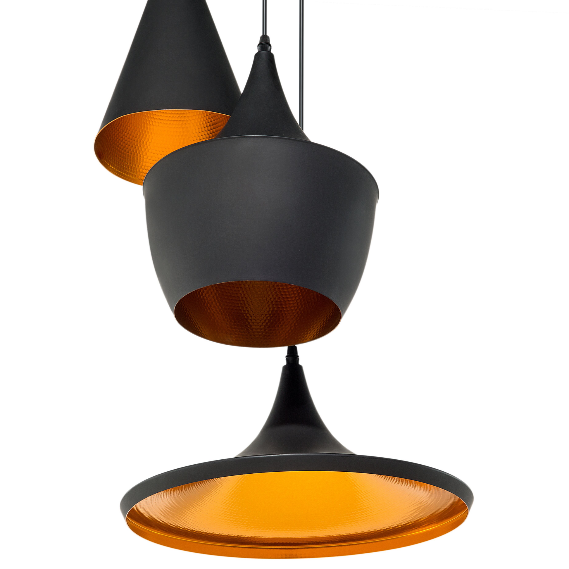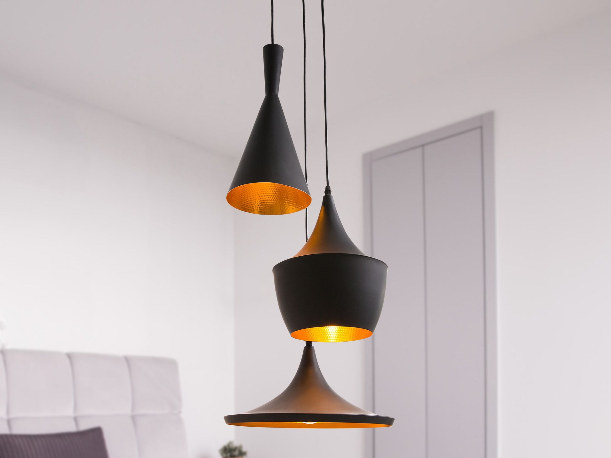 Beschreibung: Sie können sich nicht entscheiden, welche Hängelampe Ihnen am besten gefällt? Kein Problem – mit dieser Hängeleuchte können Sie sich an drei unterschiedlichen, trendy Leuchten gleichzeitig erfreuen. Raffinierte Formgebung und modernes Design treffen auf edles, mattes Schwarz kombiniert mit einem warmen Goldfarbton. Die höhenversetzte Aufhängung verleiht der Lampe einen spielerischen Effekt. Der matte Schwarzton passt zu jedem Einrichtungsstil und dank der goldfarbenen Innenseite spenden die runden Lampenschirme ein warmes und angenehmes Licht. Material: Aluminium. Gewicht: 2 Montage: Erfordert Installation und Montage Das Angebot beinhaltet: 1 x Hängeleuchte, Nicht im Lieferumfang enthalten: Leuchtmittel Höhe: 160 zusätzliche Information: Diese Leuchte ist geeignet für Leuchtmittel der Energieklassen A bis G auf einer Skala von A (sehr effizient) bis G (weniger effizient). Geeignet für: LED Leuchtmittel, Eco-Halogen Leuchtmittel, Energiesparleuchtmittel., Die Stromkabel dürfen nur von einem qualifizierten Elektriker angepasst werden. Breite: 18/25/35 Tiefe: 18/25/35 Art: Hängeleuchte Stil: Modern Allgemeine Farbe: Schwarz Hauptmaterial: Aluminium Fassung: Max. 40 W IP Protection Code: IP 20