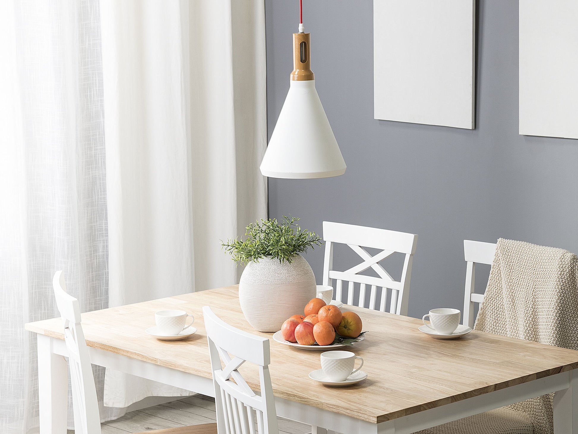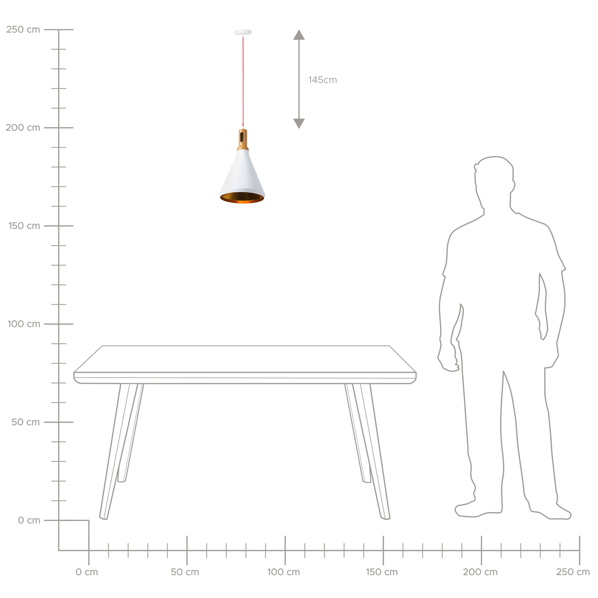 Ob über dem Ess- oder Küchentisch, im Wohn- oder Schlafzimmer, Im Eingangsbereich oder in Büroräumen, ob einzeln oder auch mit mehreren Leuchten als Gruppe - die vielseitige Leuchte passt ausgezeichnet zu einem modernen Einrichtungsstil. Der runde, konisch geformte Lampenschirm in mattem Weiss verfügt über eine kleine Spitze aus hellem Kunstoff in Holz-Optik, und die Innenseite sorgt mit einem edlen Finish aus glänzendem Gold für einen wunderschönen, warmen Lichtschein. Die Lampe ist mit einem roten Kabel versehen. Material: Aluminium. Zusätzliches Material: Kunststoff. Gewicht: 0.8 Montage: Erfordert Installation und Montage Das Angebot beinhaltet: 1 x Hängeleuchte, Nicht im Lieferumfang enthalten: Leuchtmittel Höhe: 189 zusätzliche Information: Diese Leuchte ist geeignet für Leuchtmittel der Energieklassen A bis G auf einer Skala von A (sehr effizient) bis G (weniger effizient). Geeignet für: LED Leuchtmittel, Eco-Halogen Leuchtmittel, Energiesparleuchtmittel., Die Stromkabel dürfen nur von einem qualifizierten Elektriker angepasst werden. Breite: 24 Tiefe: 24 Art: Hängelampe Stil: Modern Allgemeine Farbe: Weiss Hauptmaterial: Aluminium Fassung: Max. 60 W IP Protection Code: IP 20