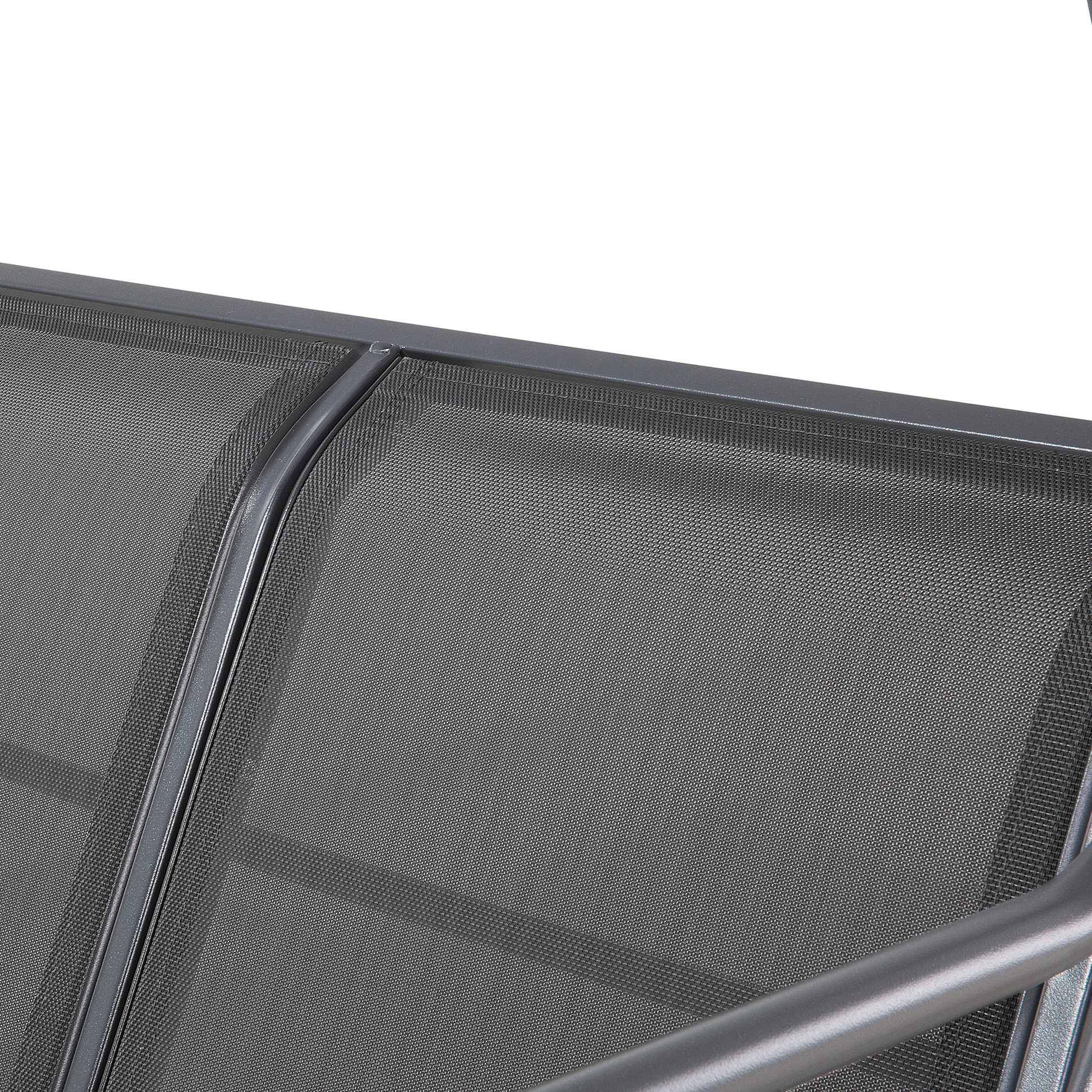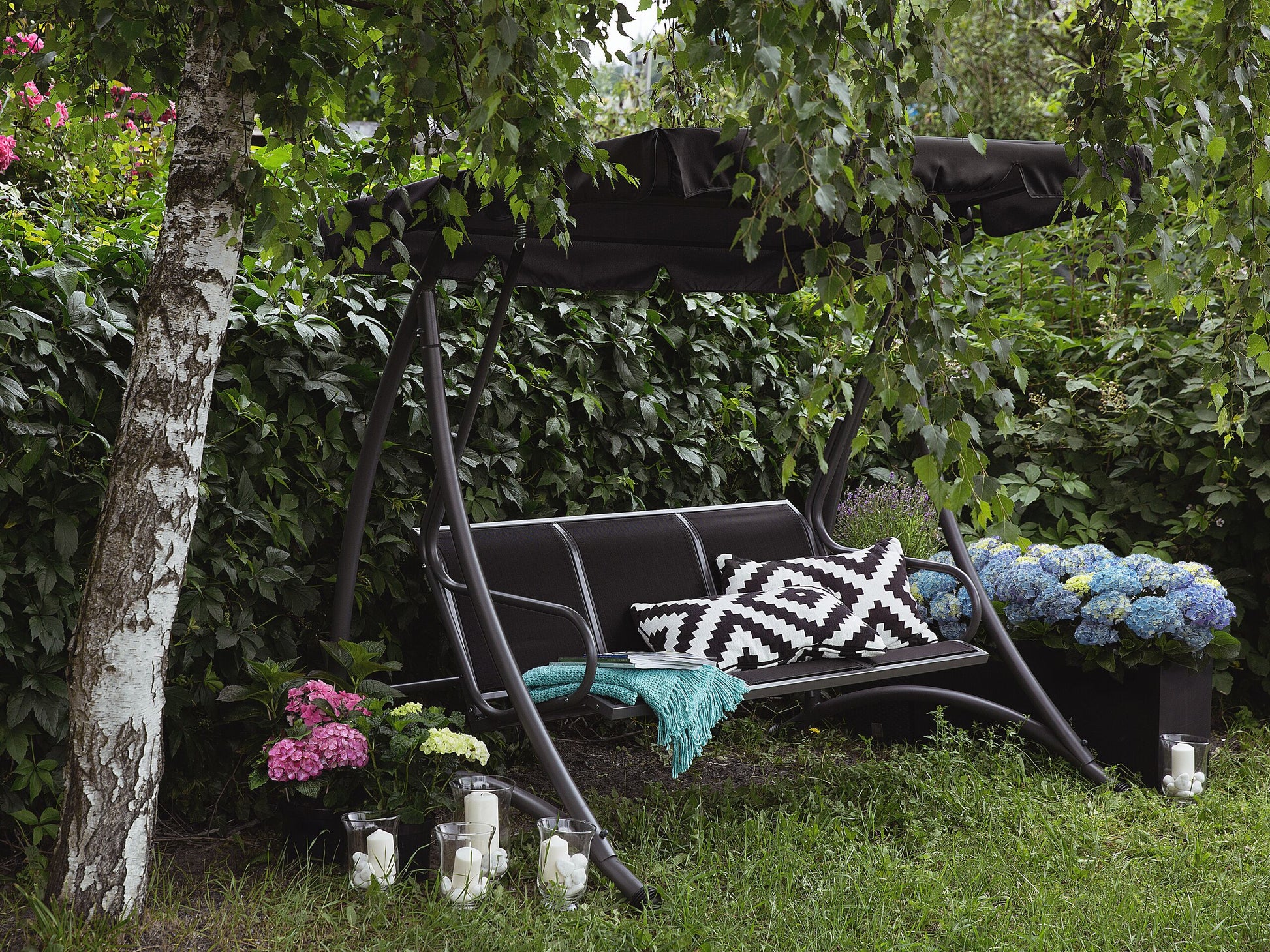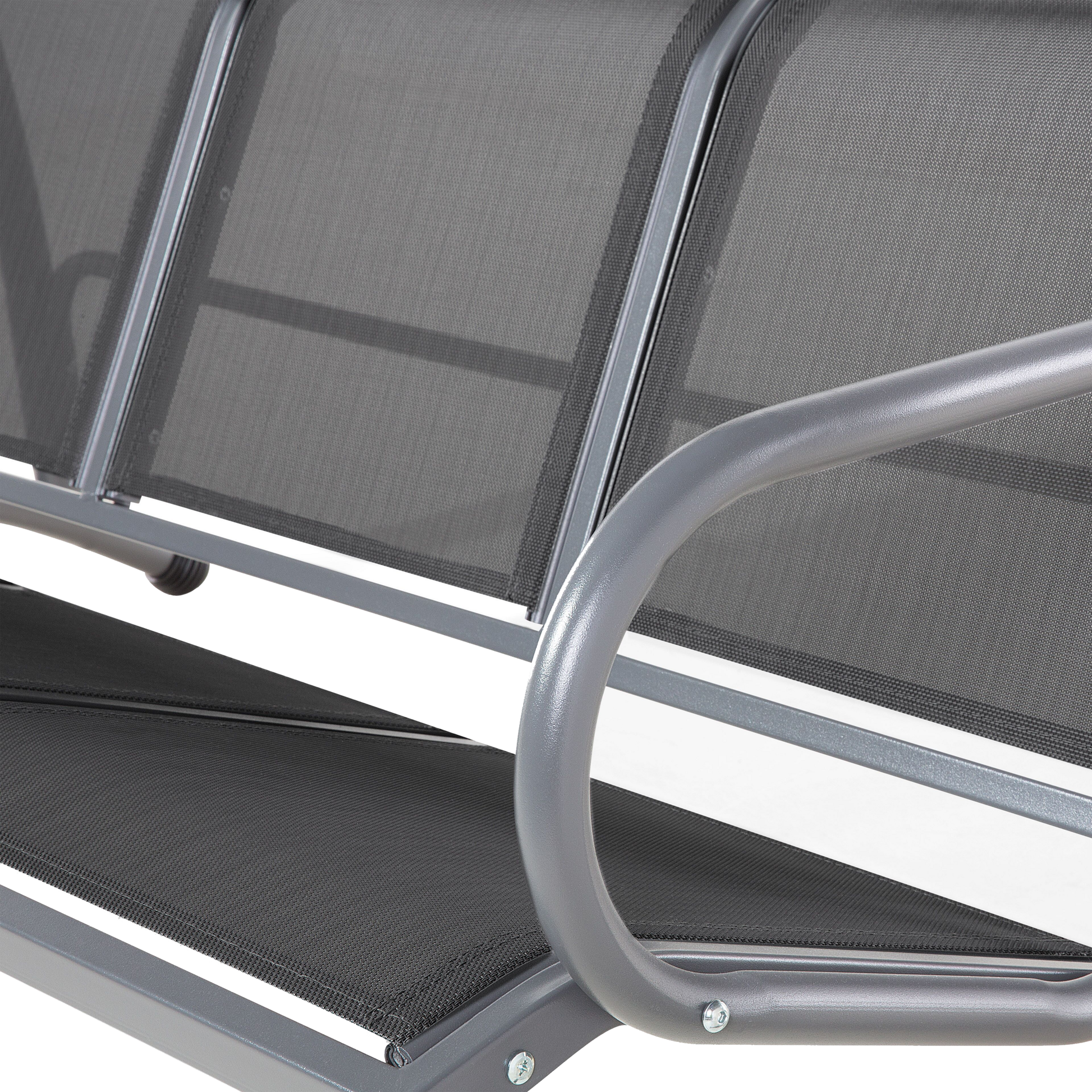 Die luxuriöse Gartenschaukel ist aus stabilem, pulverbeschichtetem Stahl gefertigt und somit äusserst witterungsbeständig. Das gilt auch für die Sitzfläche und die Rückenlehne, die mit strapazierfähigem Netzgewebe bespannt sind. Auf der bequemen Sitzfläche finden drei Personen Platz. Abgerundet wird das Design durch ein Sonnendach aus pflegeleichtem Polyester. Material: Stahl. Zusätzliches Material: Polyester. Gewicht: 40 Kapazität: 3 Personen Montage: Nicht montiert Gewichtskapazität: 280 Sitzhöhe: 46 Das Angebot beinhaltet: 1 x Hollywoodschaukel Sitzfläche: 146x49 Höhe: 169 Breite: 190 Tiefe: 120 Art: Hollywoodschaukel Stil: Klassisch Allgemeine Farbe: Schwarz Hauptmaterial: Stahl