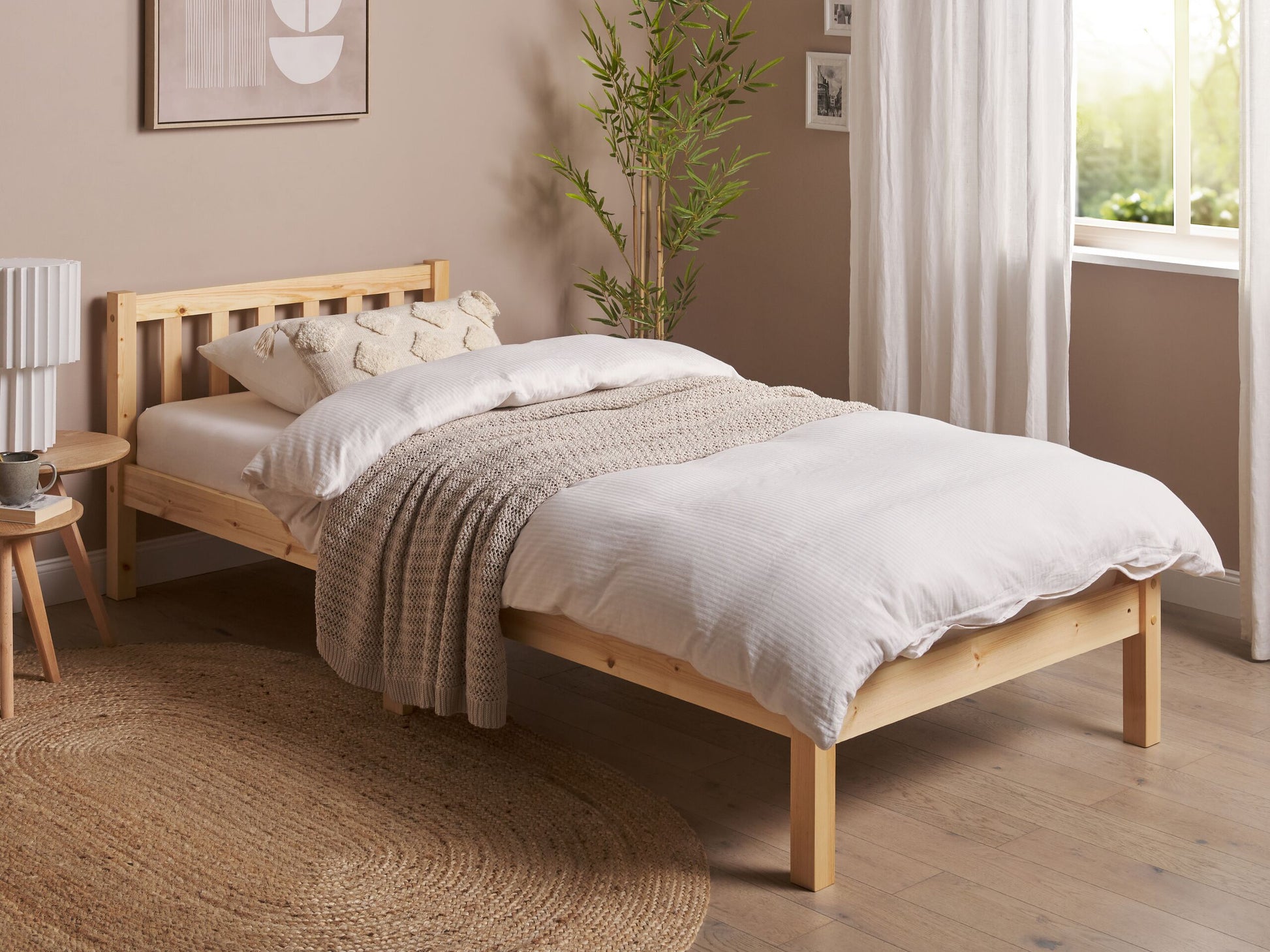 Ein wunderschönes Bett im zeitlosen Stil, das jedem Interieur ein ausgezeichnetes Ambiente verleihen wird. Dank des universellen Designs wird dieses Einzelbett perfekt sowohl zu traditionellen als auch modernen Schlafzimmern passen. Dazu kommt noch die Fertigung aus hochwertigem Holz und ein stabiler Lattenrost, der einen gesunden, ungestörten Schlaf garantiert, da er das Körpergewicht gleichmässig verteilt und die Matratze optimal stützt. Material: Kiefernholz. Zusätzliches Material: Pappelholz, Sperrholz. Gewicht: 17 Montage: Nicht montiert Holzart: Pinus massoniana, Populus Holzursprung: Russland Gewichtskapazität: 125 Beine Höhe: 35 Schlafende Oberfläche: 90x200 Das Angebot beinhaltet: 1 x Rollrost (Anzahl der Latten: 15), 1 x Bettrahmen, Nicht im Lieferumfang enthalten: Matratze, Bettwäsche und Kissen Höhe: 70 zusätzliche Information: Die auf den Fotos dargestellte Matratze ist 20 cm hoch, daher ist eine ähnlich hohe Matratze empfehlenswert., Holz ist ein natürliches Material, daher bleibt die feine, natürliche Struktur und die ganz besondere Optik der Holzoberfläche trotz der Farbschicht erhalten., Holz ist ein Naturprodukt. Farb- und Strukturunterschiede, Narben, Falten und sonstige Naturmerkmale sind Echtheitsbeweise und keine zur Reklamation berechtigende Fehler. Breite: 97 Länge: 208 Art: Bett mit Lattenrost Stil: Skandinavisch Allgemeine Farbe: Heller Holzfarbton Hauptmaterial: Kiefernholz Stoff gepolstert zurück: Ja