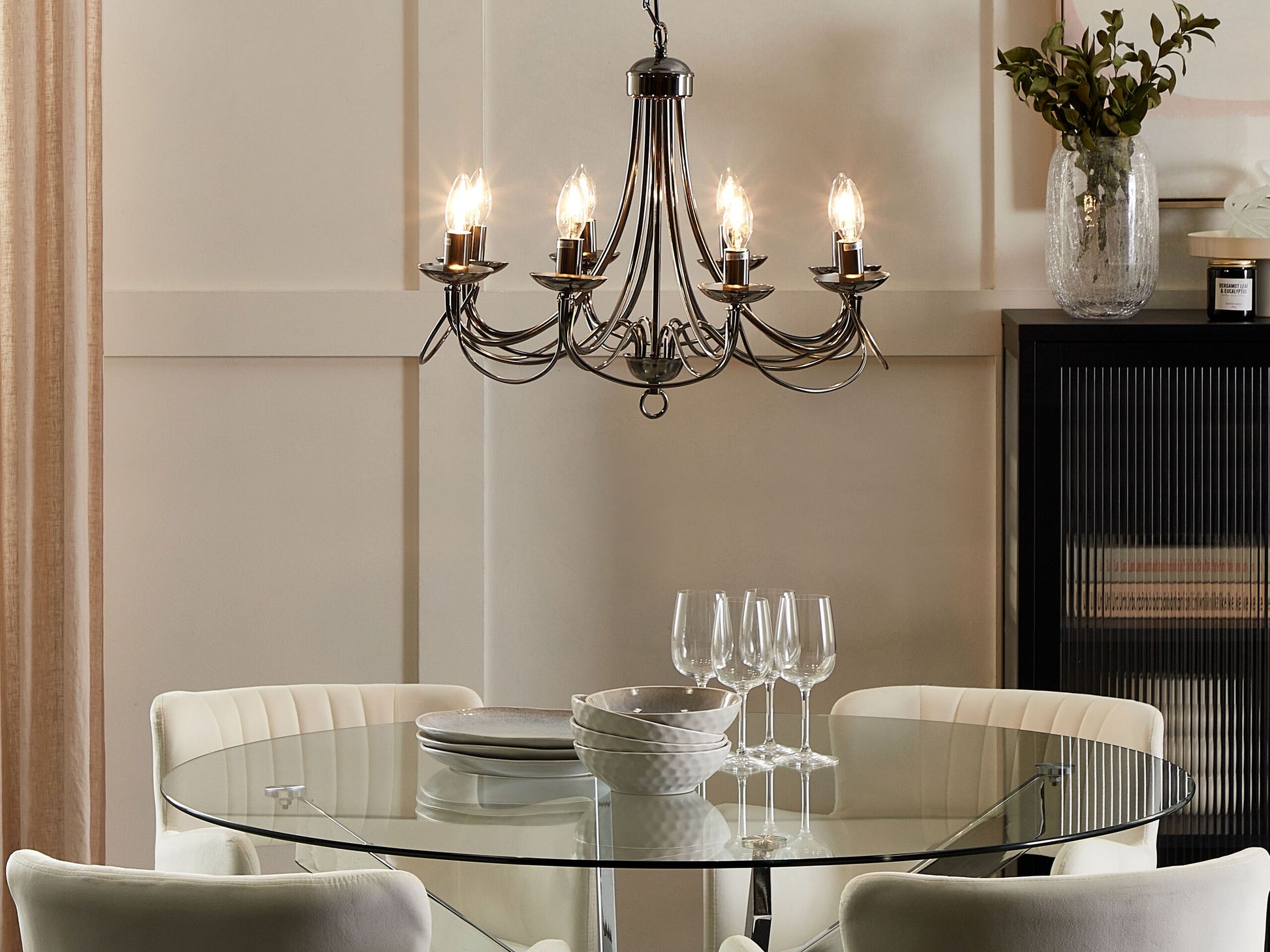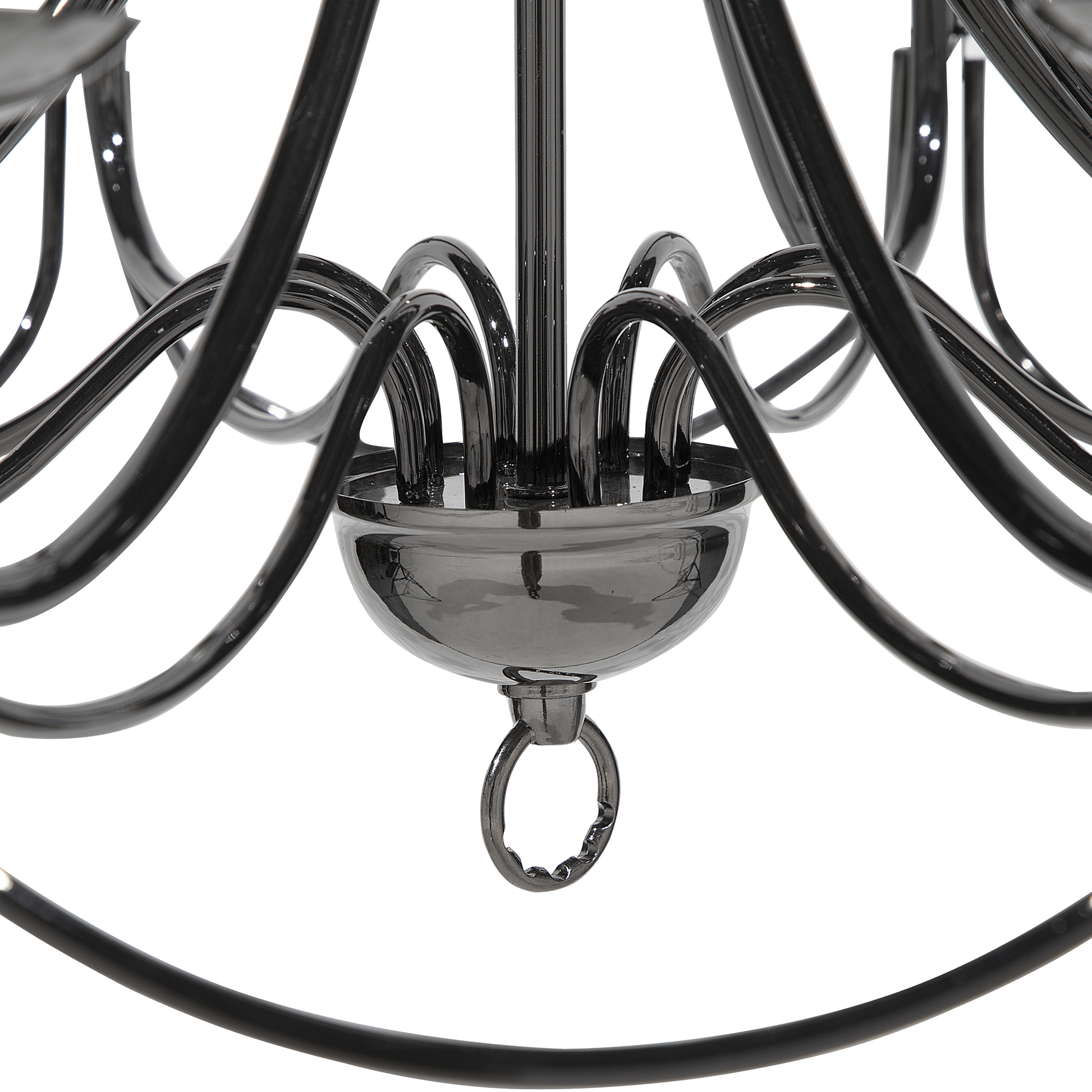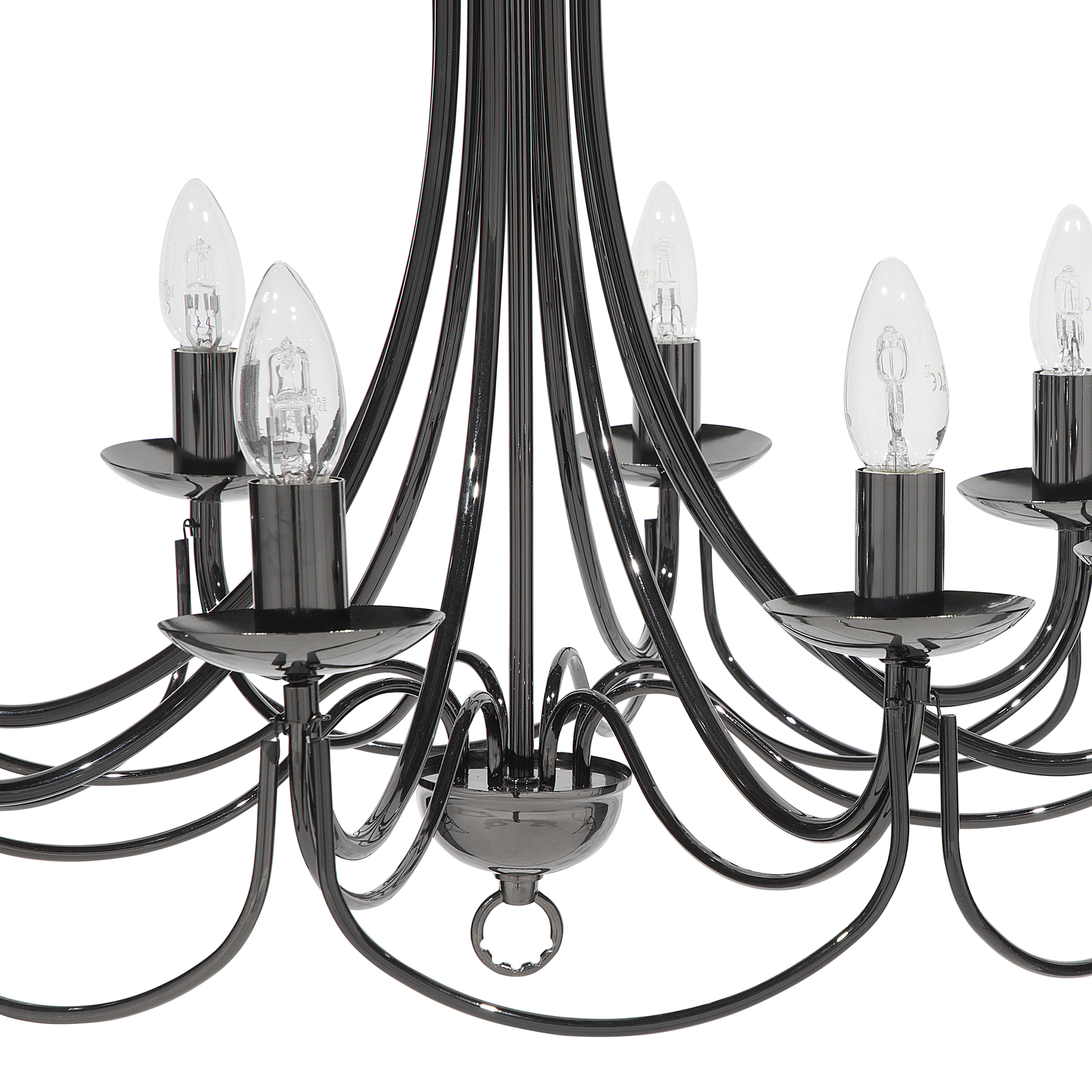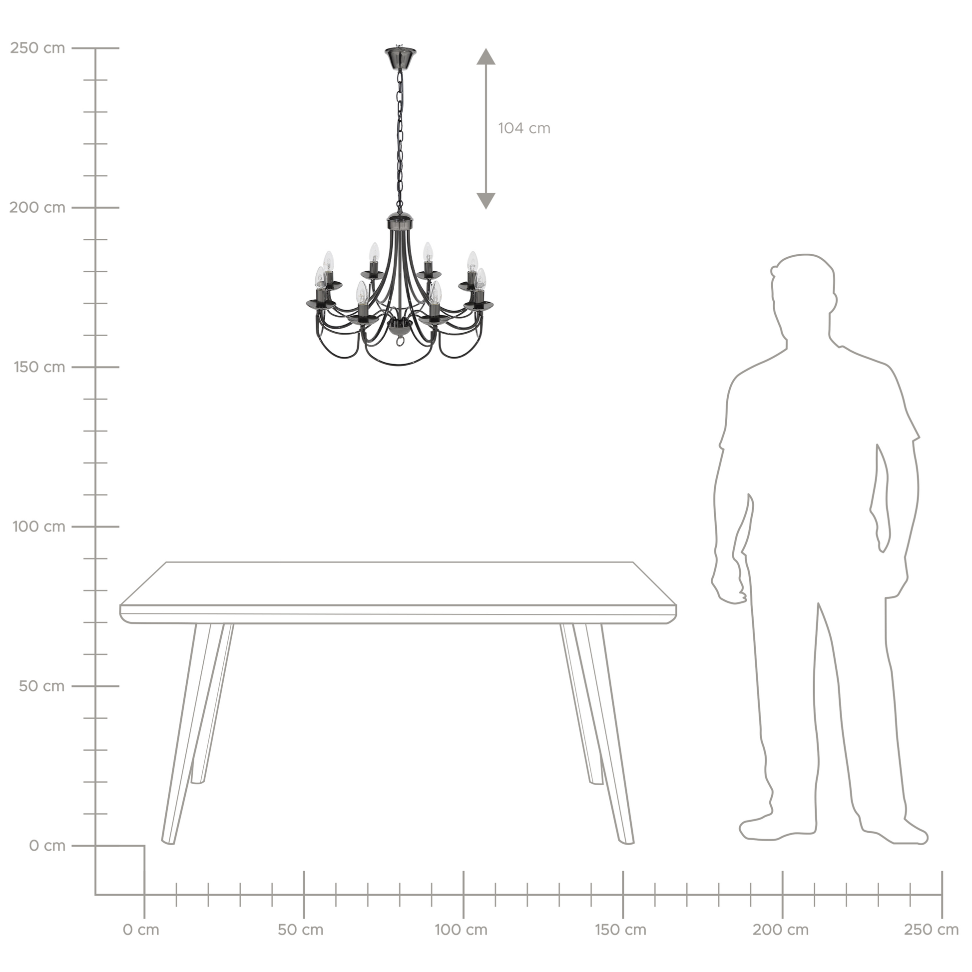 Der klassische Kronleuchter in ganz moderner Form. Schön geschwungene Leuchtenarme und kerzenförmige Leuchtmittel sorgen für eine romantische Ausstrahlung. Das perlschwarze Metall und die robuste Kettenaufhängung vermitteln rustikales Flair. Der elegante Stil der 8-flammigen Lampe lässt sich besonders gut mit einem klassischen Interieur kombinieren. Material: Eisen. Zusätzliches Material: Kunststoff. Gewicht: 5 Montage: Erfordert Installation und Montage Das Angebot beinhaltet: 1 x Hängeleuchte, Nicht im Lieferumfang enthalten: Leuchtmittel Höhe: 143 zusätzliche Information: Diese Leuchte ist geeignet für Leuchtmittel der Energieklassen A bis G auf einer Skala von A (sehr effizient) bis G (weniger effizient). Geeignet für: LED Leuchtmittel, Eco-Halogen Leuchtmittel, Energiesparleuchtmittel., Die Stromkabel dürfen nur von einem qualifizierten Elektriker angepasst werden. Breite: 59 Tiefe: 59 Art: Kronleuchter Stil: Klassisch Allgemeine Farbe: Schwarz Hauptmaterial: Eisen Fassung: Max. 40 W IP Protection Code: IP 20