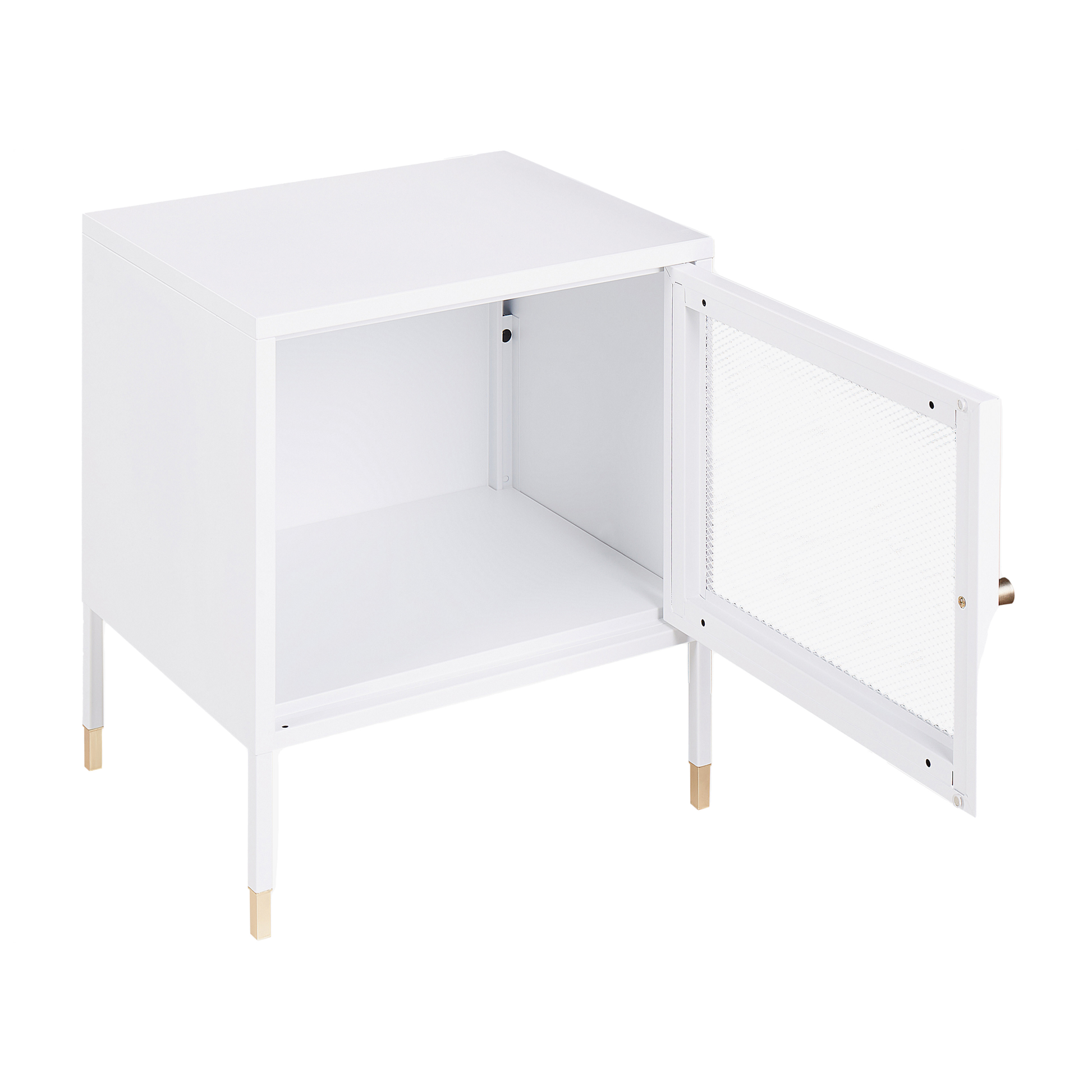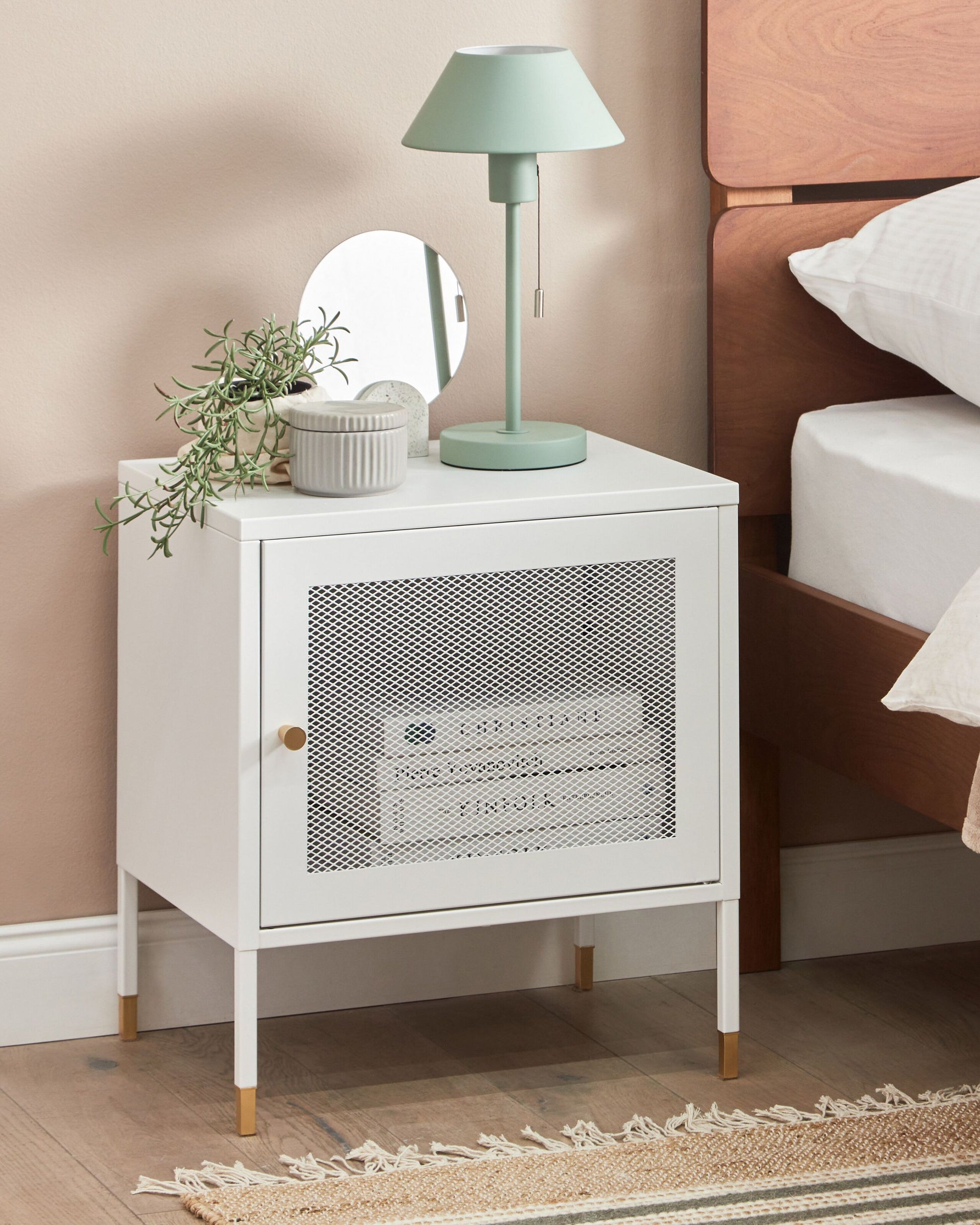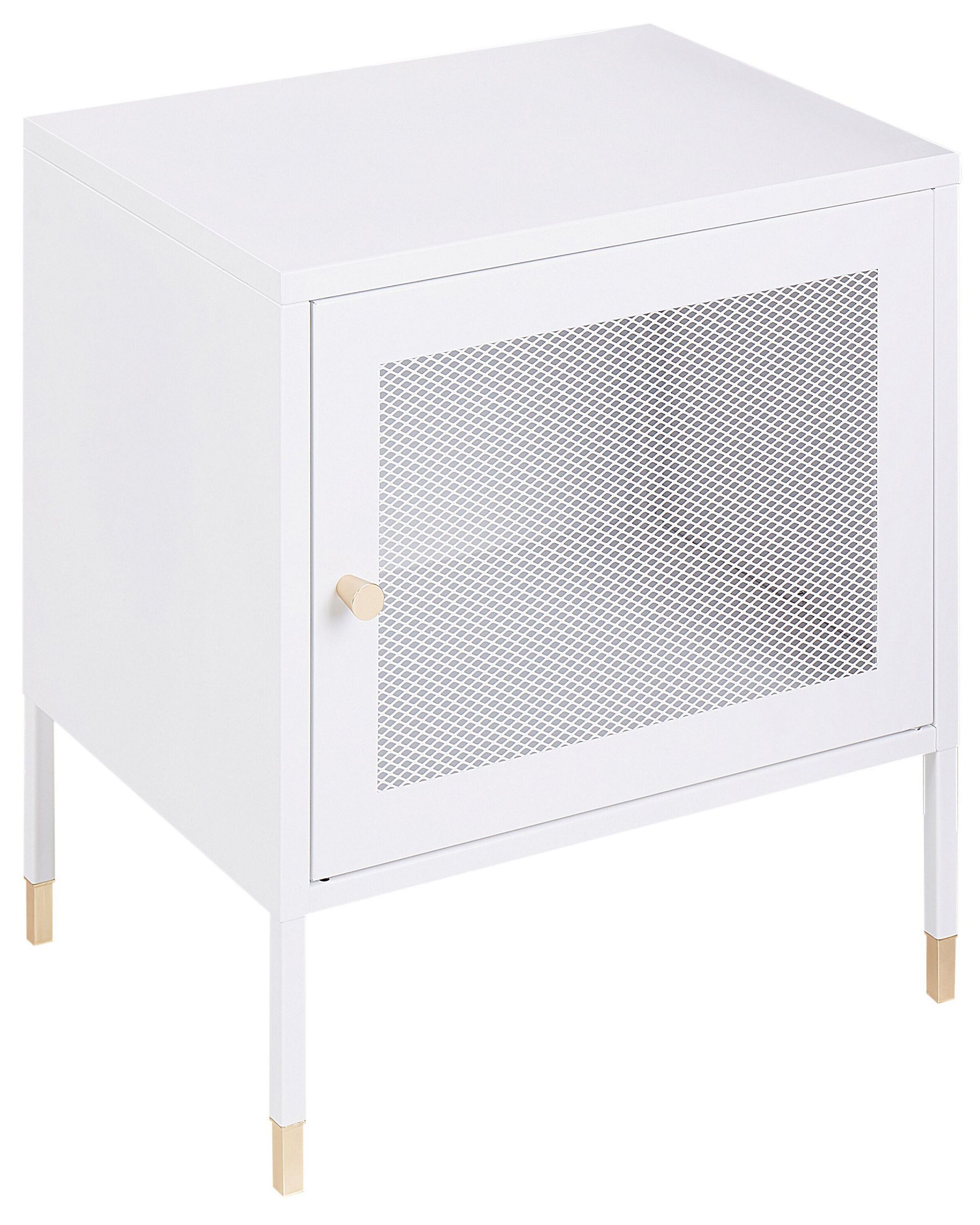 Dieser geräumige Schrank im trendigen, weissen Farbton mit einem modernen Design ist die perfekte Ergänzung für jedes Schlaf-, Wohn- und Esszimmer sowie jeden Flur oder jede Diele. Der rechteckige Nachtschank ist aus pulverbeschichtetem, kaltgewalztem Stahl gefertigt, so ist er besonders langlebig und pflegeleicht. Seine Metallgittertür sorgt für einen raffinierten, industriellen Look und lässt das Sideboard leicht, offenherzig als auch persönlich wirken. Für einen edlen Touch sorgen die verzinkten Details an den Metallbeinen sowie an dem runden Metallgriff. Der Stahlschrank bietet sowohl Ablagefläche für Dekoartikel oder Lampen als auch zusätzlichen Stauraum für Dokumente oder Bücher. Da der Türschrank mit Untersetzern versehen ist, kann er in jedem Wohnraum platziert werden. Material: Stahl. Gewicht: 6 Montage: Nicht montiert Beine Höhe: 16 Das Angebot beinhaltet: 1 x Nachttisch Höhe: 51 Breite: 45 Tiefe: 35 Art: Nachttisch Stil: Industriell Allgemeine Farbe: Weiss Hauptmaterial: Stahl