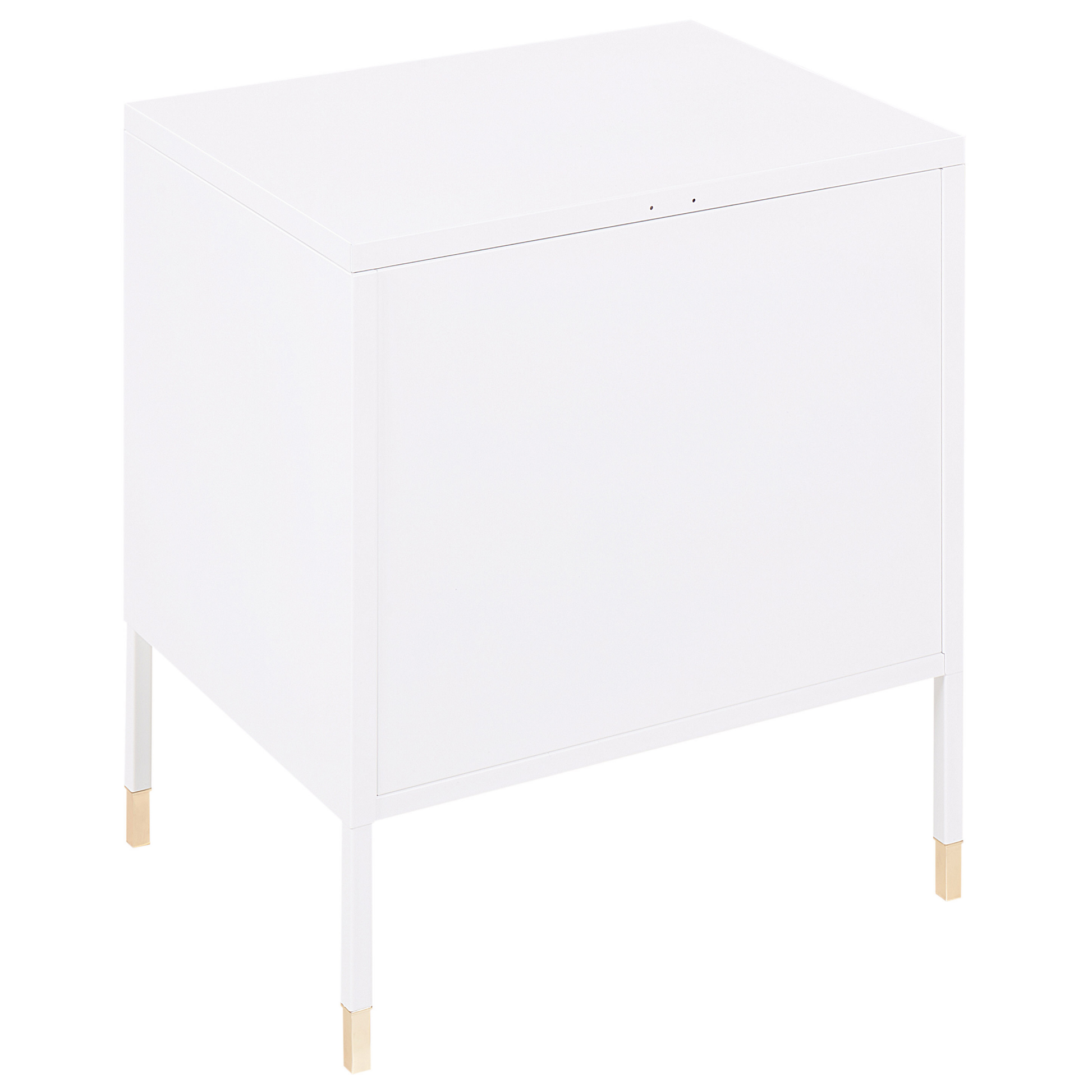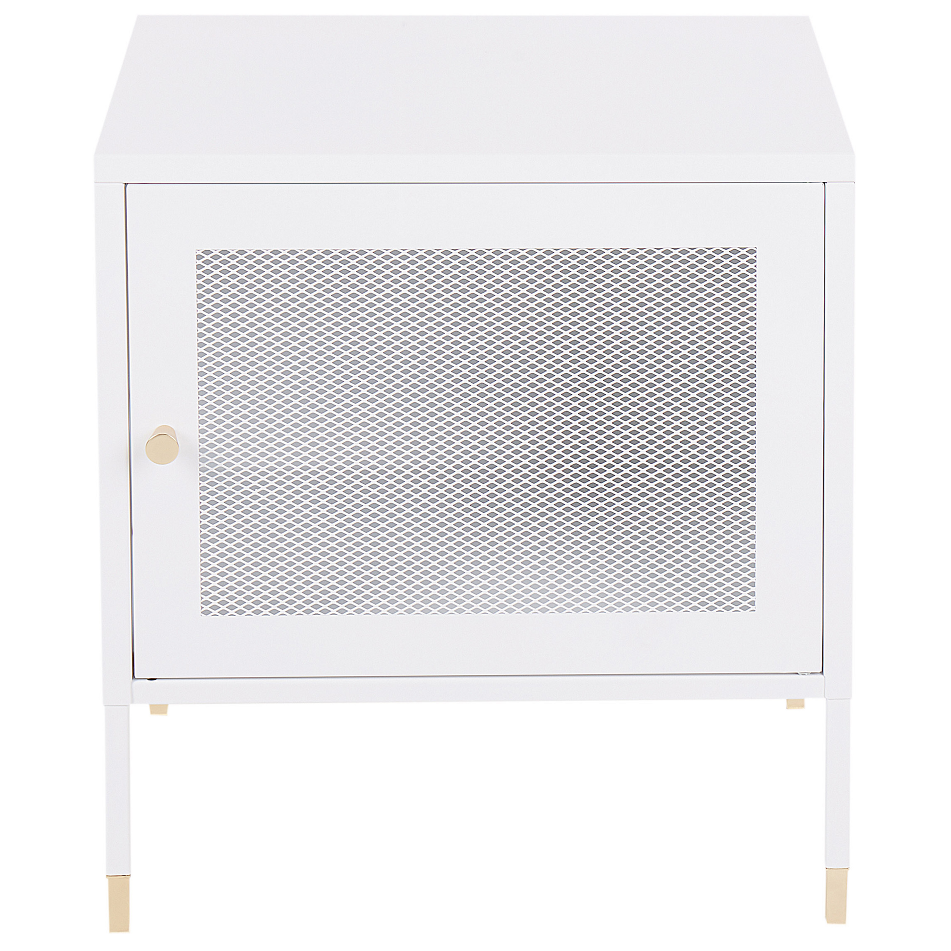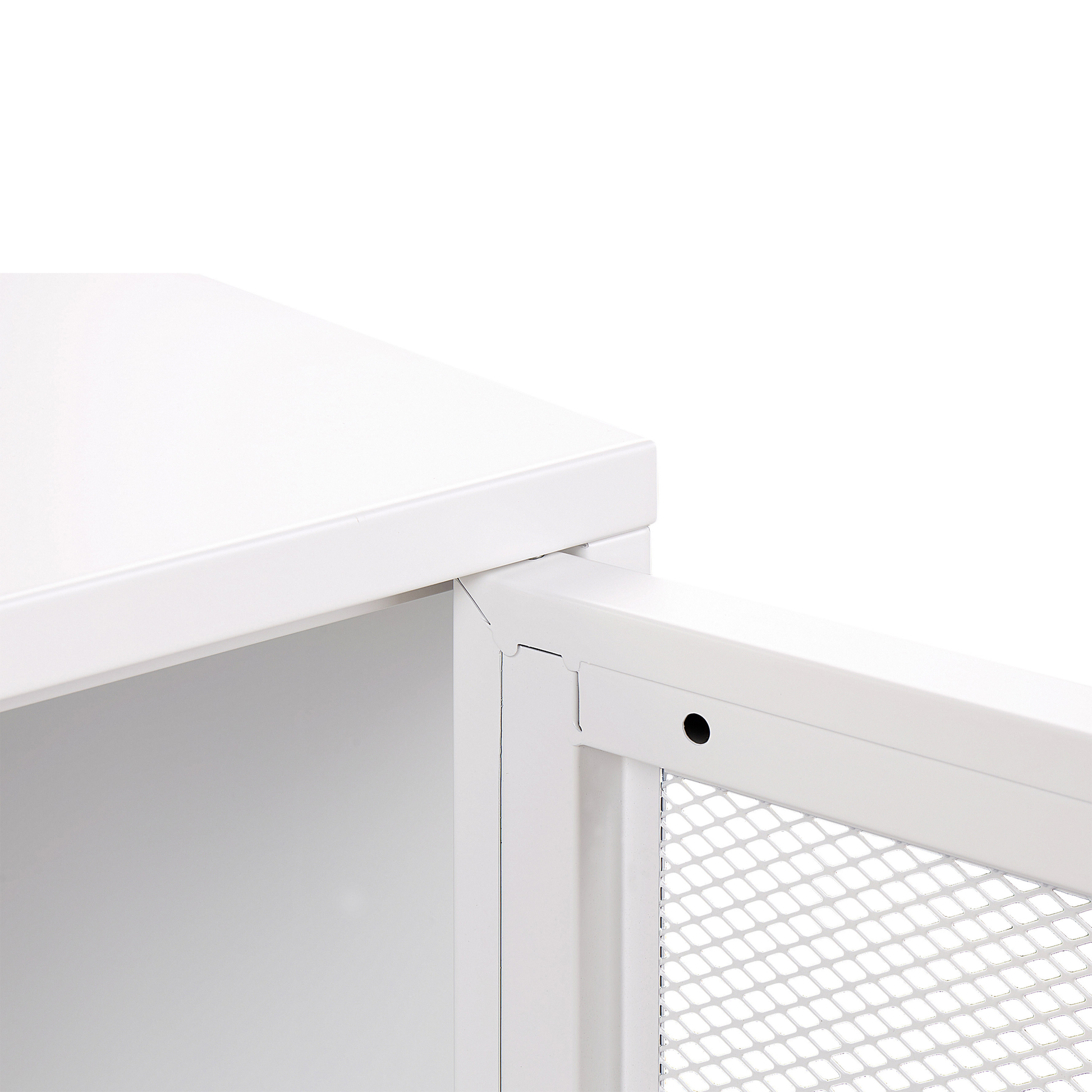 Dieser geräumige Schrank im trendigen, weissen Farbton mit einem modernen Design ist die perfekte Ergänzung für jedes Schlaf-, Wohn- und Esszimmer sowie jeden Flur oder jede Diele. Der rechteckige Nachtschank ist aus pulverbeschichtetem, kaltgewalztem Stahl gefertigt, so ist er besonders langlebig und pflegeleicht. Seine Metallgittertür sorgt für einen raffinierten, industriellen Look und lässt das Sideboard leicht, offenherzig als auch persönlich wirken. Für einen edlen Touch sorgen die verzinkten Details an den Metallbeinen sowie an dem runden Metallgriff. Der Stahlschrank bietet sowohl Ablagefläche für Dekoartikel oder Lampen als auch zusätzlichen Stauraum für Dokumente oder Bücher. Da der Türschrank mit Untersetzern versehen ist, kann er in jedem Wohnraum platziert werden. Material: Stahl. Gewicht: 6 Montage: Nicht montiert Beine Höhe: 16 Das Angebot beinhaltet: 1 x Nachttisch Höhe: 51 Breite: 45 Tiefe: 35 Art: Nachttisch Stil: Industriell Allgemeine Farbe: Weiss Hauptmaterial: Stahl