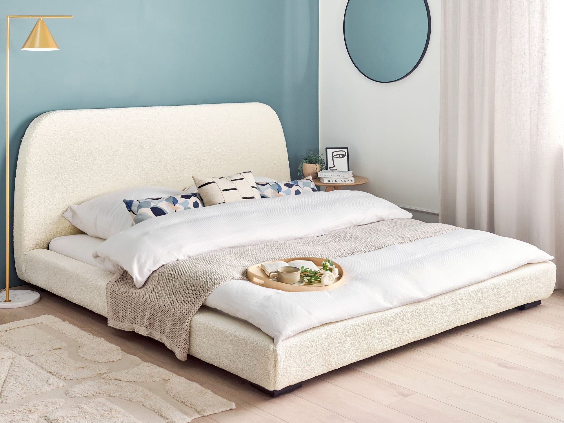 Dieses Stoffbett kommt mit einem passenden Rollrost geliefert, so brauchen Sie es lediglich mit einer Matratze zu bereichern, um sich gleich auf dem Bett entspannen zu können. Zudem zeichnet es sich mit einem robusten Bettrahmen, stabilen Metallbeinen und einem angenehm weichen Bouclé-Rundumbezug aus. Vollendet wird das Bettgestell mit einem hohen Kopfteil, das perfekt zum abendlichen Zurücklehnen ist. Dank seines niedrigen Profils können Sie sich mit dem Bett viel Klasse gönnen, ohne zusätzlichen Platz einzubüssen, und dank des zeitlosen Farbtons fügt es sich filigraner in jede Zimmereinrichtung ein. Material: Bouclé. Zusätzliches Material: Sperrholz, Eukalyptus, Pappelholz, Metall. Material Zusammensetzung: 100% Polyester Gewicht: 60 Montage: Nicht montiert Holzart: Eucalyptus grandis Holzursprung: China Gewichtskapazität: 450 Beine Höhe: 5 Schlafende Oberfläche: 180x200 Das Angebot beinhaltet: 1 x Bettrahmen, 1 x Lattenrost (Anzahl der Latten: 16), Nicht im Lieferumfang enthalten: Matratze, Bettwäsche und Kissen Höhe: 101 zusätzliche Information: Die auf den Fotos dargestellte Matratze ist 20 cm hoch, daher ist eine ähnlich hohe Matratze empfehlenswert. Breite: 201 Länge: 226 Art: Bett mit Lattenrost Stil: Klassisch Allgemeine Farbe: Beige Schatten: Creme Hauptmaterial: Bouclé Stoff gepolstert zurück: Ja
