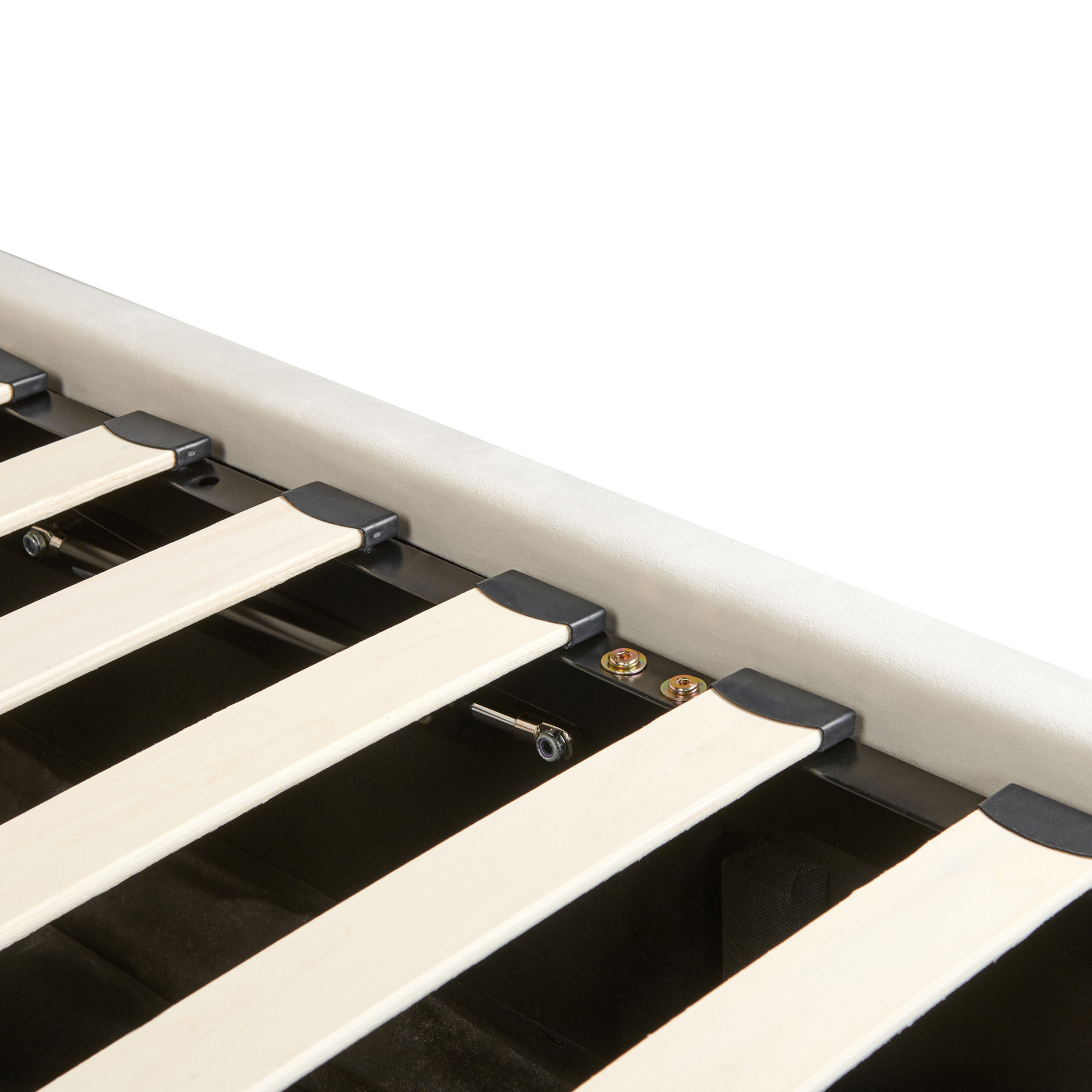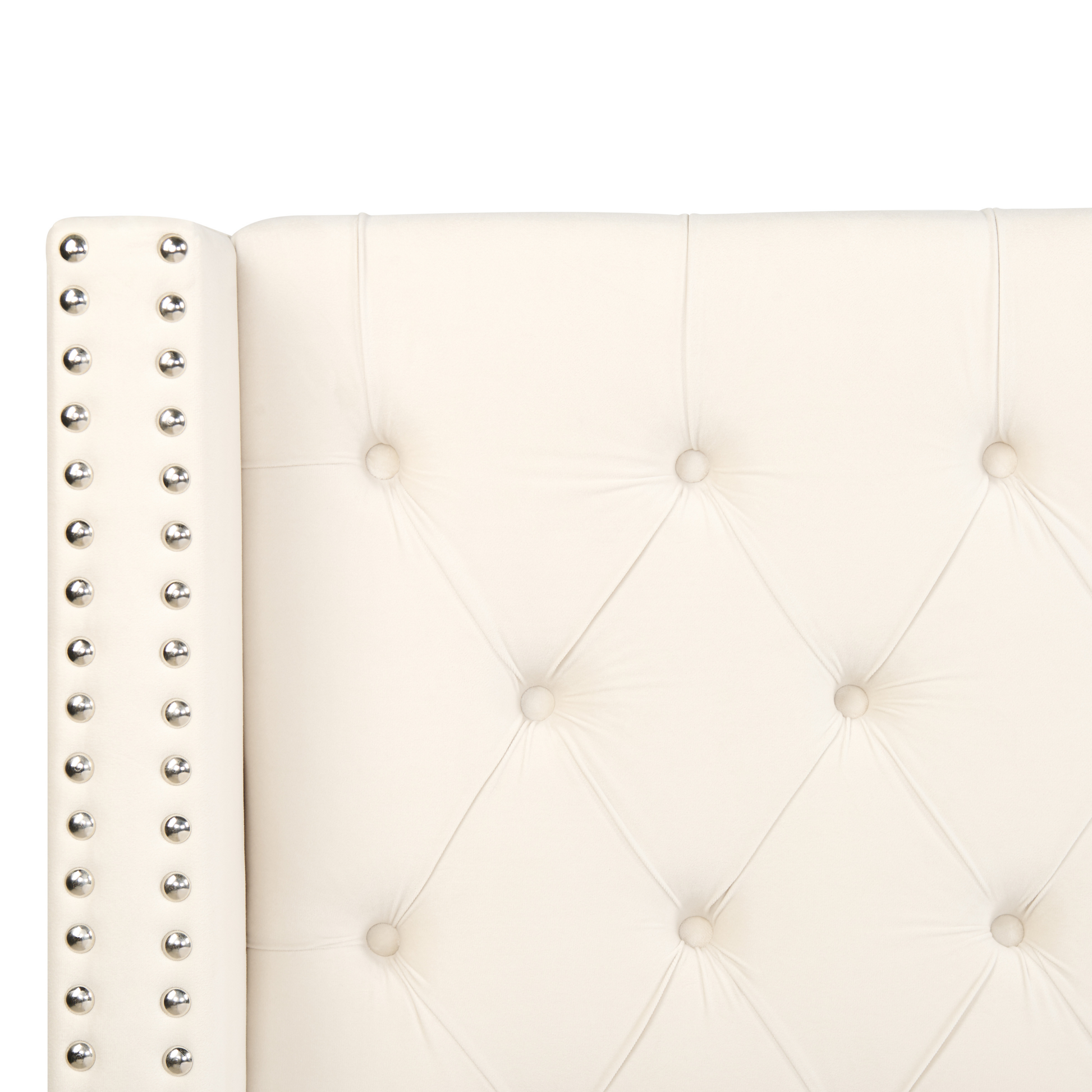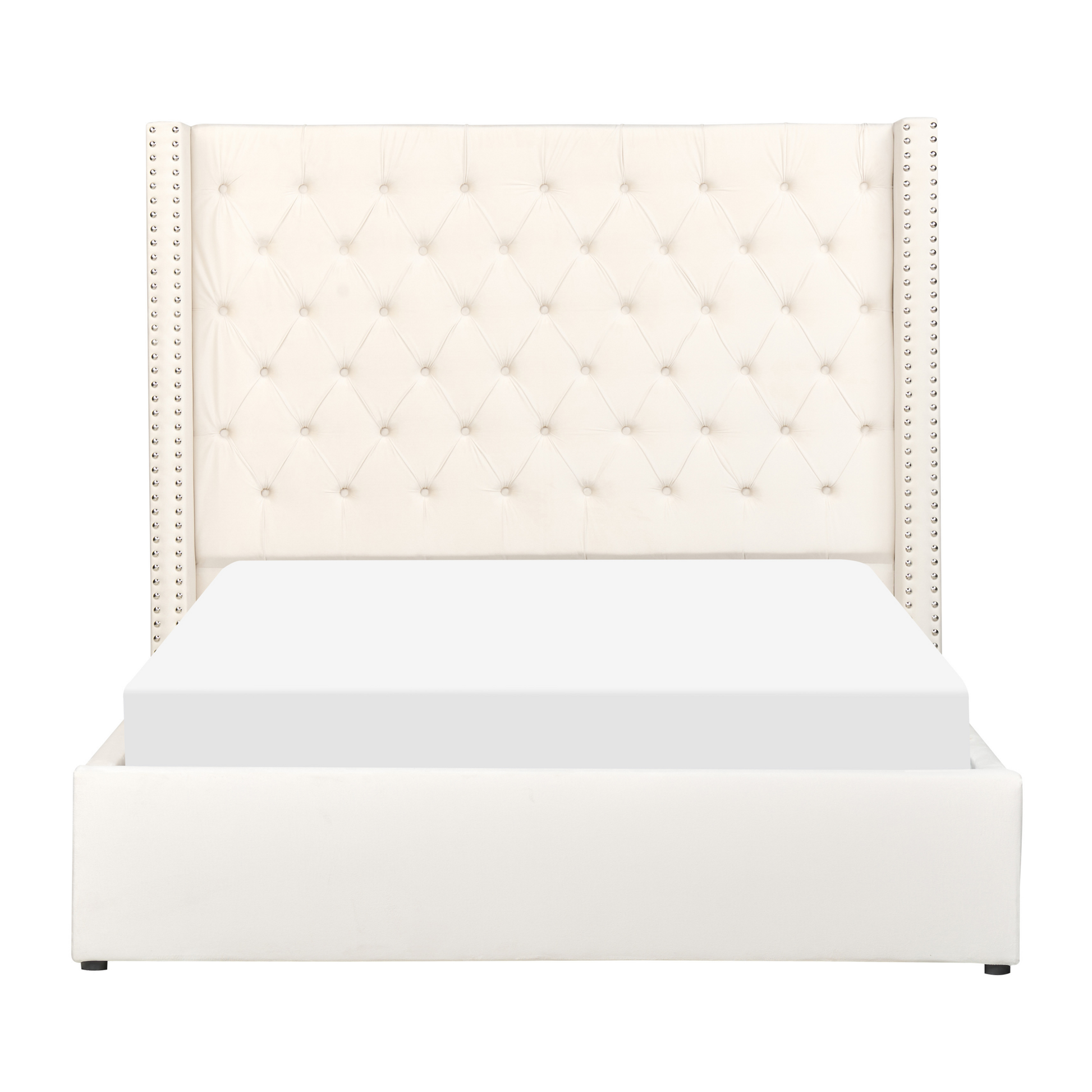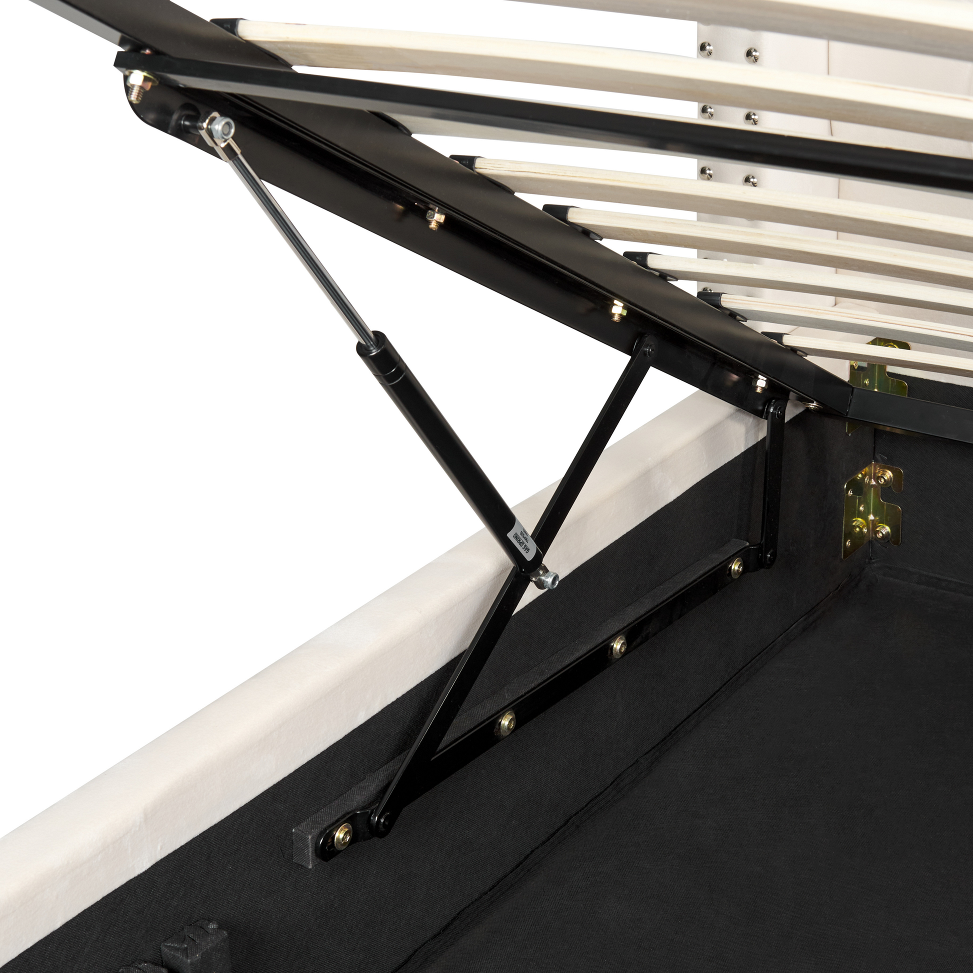 Beschreibung: Dieses schicke Bett setzt den raffinierten Chesterfield-Stil gekonnt um und bringt sowohl Eleganz als auch einen fabelhaften Komfort in Ihr Schlafzimmer. Der robuste Bettrahmen und das hohe Kopfteil sind mit einem geschmeidigen, hochqualitativen Samtbezug ummantelt. Zudem ist das Bett-Kopfteil mit einer edlen Diamant-Steppung, passenden Knöpfen, silberfarbenen Nieten und Seitenflügeln ergänzt. Die soliden Kunststoffbeine garantieren nicht nur einen stabilen Stand, sie unterstreichen auch den vorteilhaften Look des Samtbettes. Der mitgelieferte Lattenrost sorgt für eine gute Nachtruhe und lässt sich einfach hochklappen, um den gerämigen Bettkasten zu enthüllen, der Ihnen mehr Platz für Ihre Bettwäsche oder andere Kleinigkeiten bietet. Material: Samtstoff. Zusätzliches Material: Kiefernholz, Eukalyptus, Sperrholz, Kunststoff, Metall. Material Zusammensetzung: 100% Polyester Gewicht: 59 Montage: Nicht montiert Holzart: Pinus massoniana, Eucalyptus grandis Holzursprung: China Gewichtskapazität: 150 Beine Höhe: 3 Schlafende Oberfläche: 140x200 Das Angebot beinhaltet: 1 x Federholzlattenrost (Anzahl der Latten: 28), 1 x Bettrahmen mit Stauraum, Nicht im Lieferumfang enthalten: Matratze, Bettwäsche und Kissen Höhe: 144 zusätzliche Information: Die auf den Fotos dargestellte Matratze ist 20 cm hoch., Bitte beachten Sie, dass Samtstoff unter verschiedenen Lichtverhältnissen eine andere Optik haben kann – das Material schimmert bei Tageslicht stärker und wirkt bei künstlicher Beleuchtung in Innenräumen eher gedämpft. Aufgrund der glatten, hochdichten Struktur des Gewebes kann sein Farbton auch variieren, wenn man mit der Hand in verschiedene Richtungen und Winkel über den Stoff fährt. Um den Farbton auszugleichen und Druckstellen zu vermeiden, sollte der Webstoff sanft mit einer offenen Handfläche in eine Richtung gestrichen, mit einem feuchten Tuch abgewischt oder einem Dampfbügeleisen gebügelt werden. Breite: 170 Länge: 217 Art: Bett mit Bettkasten Stil: Retro Allgemeine Farbe: Weiss Schatten: Cremeweiss Hauptmaterial: Samtstoff Stoff gepolstert zurück: Nein