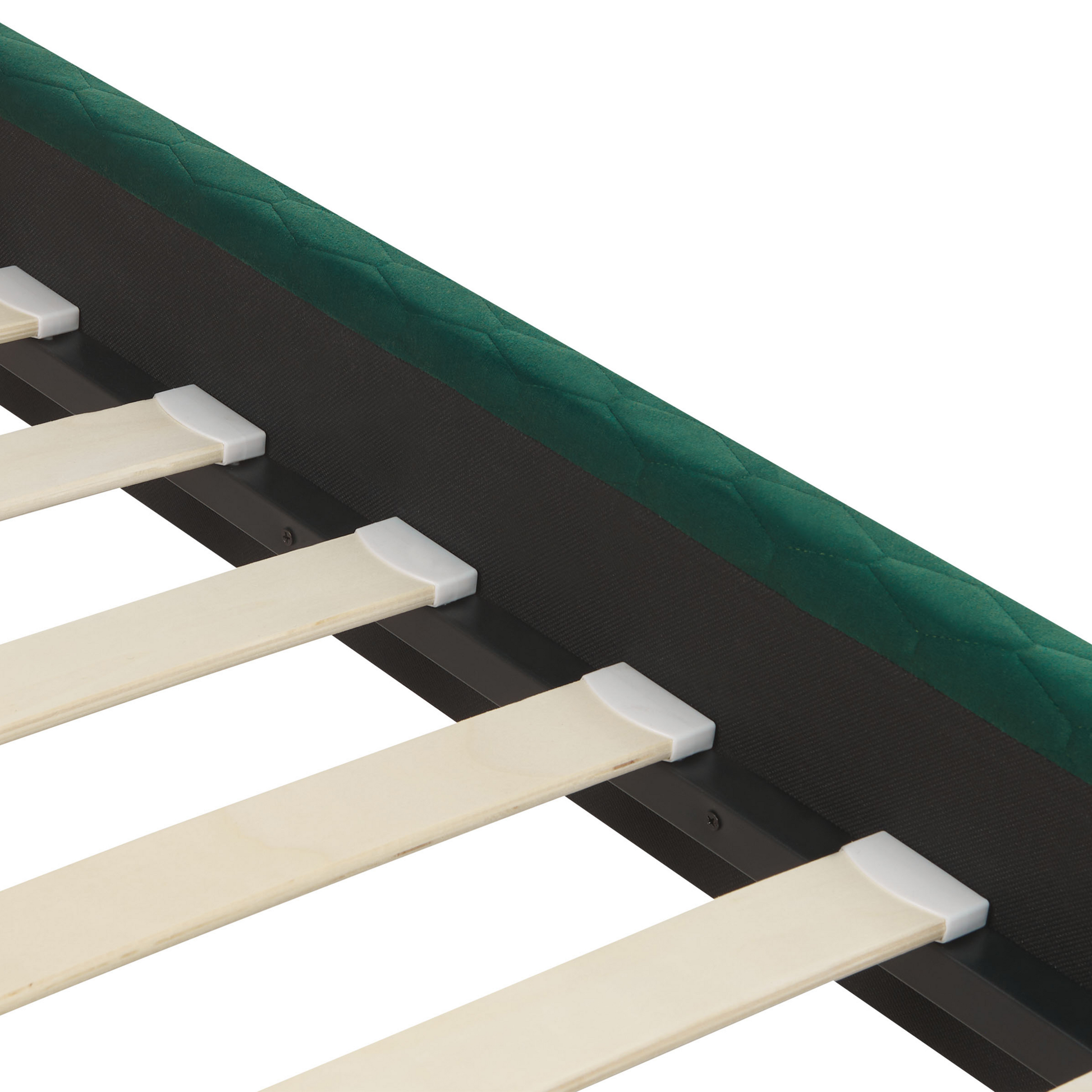 Dieses moderne Bett ist ideal für jedes Schlafzimmer – es schafft eine perfekte Balance zwischen Eleganz und Schlichtheit. Das gesteppte Kopfteil in rechteckiger Form sowie die Seiten des Betts sind mit einem weichen, pflegeleichten Samtstoff versehen. Die Holzkonstruktion sorgt für Stabilität, während die stilvollen Beine aus dunklem Holz das Gesamtkonzept wunderbar ausgleichen. Material: Samtstoff. Zusätzliches Material: Gummibaumholz, Kiefernholz. Material Zusammensetzung: 100% Polyester Gewicht: 25 Montage: Nicht montiert Holzart: Pinus massoniana, Havea brasiliensis Holzursprung: China Gewichtskapazität: 200 Beine Höhe: 18 Schlafende Oberfläche: 90x200 Das Angebot beinhaltet: 1 x Bettrahmen, 1 x Federholzlattenrost (Anzahl der Latten: 14), Nicht im Lieferumfang enthalten: Matratze, Bettwäsche und Kissen Höhe: 121 zusätzliche Information: Die auf den Fotos dargestellte Matratze ist 20 cm hoch, daher ist eine ähnlich hohe Matratze empfehlenswert., Bitte beachten Sie, dass Samtstoff unter verschiedenen Lichtverhältnissen eine andere Optik haben kann – das Material schimmert bei Tageslicht stärker und wirkt bei künstlicher Beleuchtung in Innenräumen eher gedämpft. Aufgrund der glatten, hochdichten Struktur des Gewebes kann sein Farbton auch variieren, wenn man mit der Hand in verschiedene Richtungen und Winkel über den Stoff fährt. Um den Farbton auszugleichen und Druckstellen zu vermeiden, sollte der Webstoff sanft mit einer offenen Handfläche in eine Richtung gestrichen, mit einem feuchten Tuch abgewischt oder einem Dampfbügeleisen gebügelt werden. Breite: 101 Länge: 212 Art: Bett mit Lattenrost Stil: Retro Allgemeine Farbe: Grün Hauptmaterial: Samtstoff Stoff gepolstert zurück: Nein