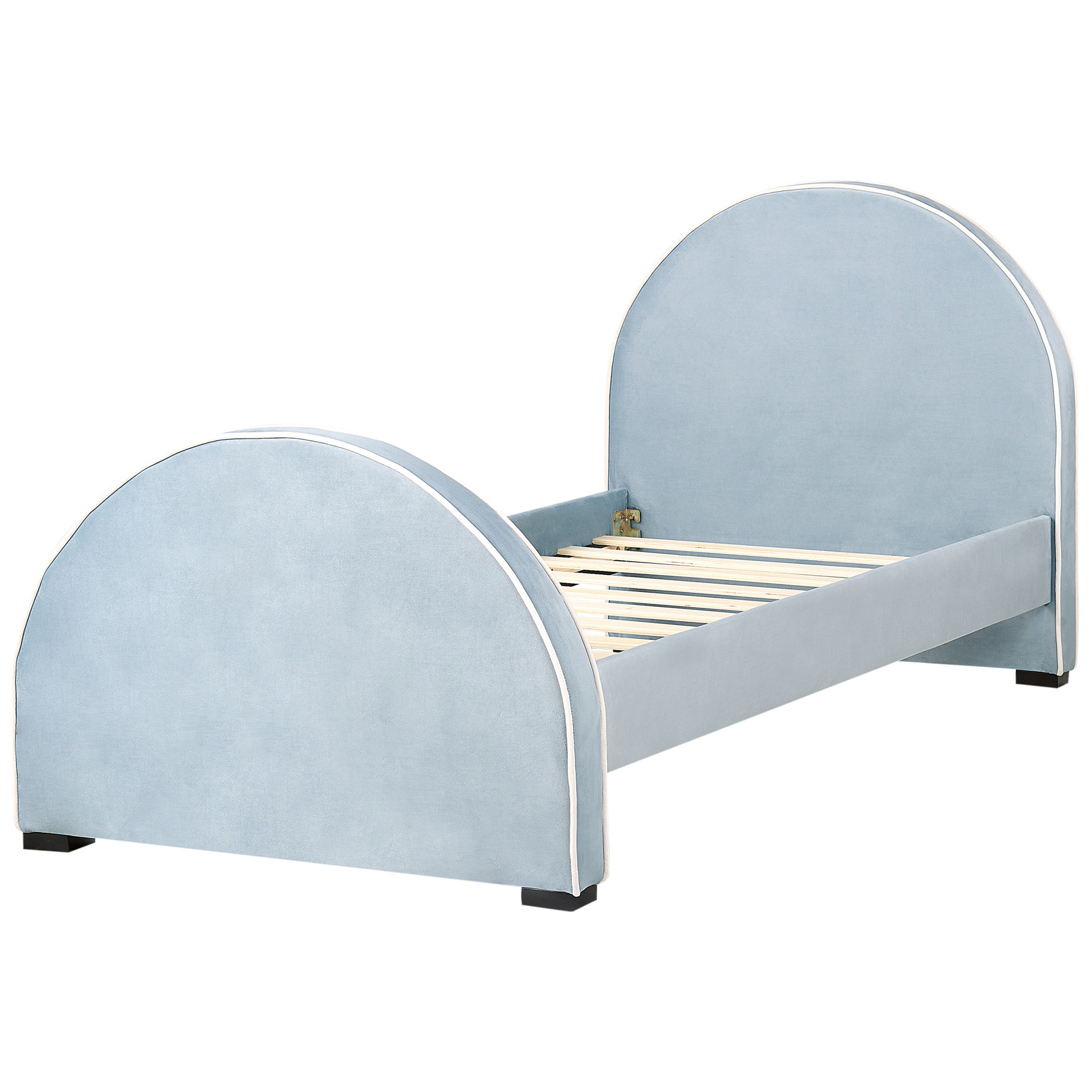 Beschreibung: Suchen Sie nach einem Bett für Ihr Kinder-, Jugend- oder Erwachsenenzimmer? Dieses ansprechende Einzelbett bringt mit seinem Pastellfarbton und seinen leicht schimmernden Oberflächen einen gemütlichen Look in jeden Schlafbereich. Seine robuste Holzkonstruktion und der mitgelieferte Lattenrost sorgen für einen hervorragenden Schlafkomfort. Sein hohes Kopfteil verspricht einen perfekten Platz zum Anlehnen, während das zusätzliche, hohe Fussteil die moderne Ausstrahlung des Samtbettes zur Geltung bringt. Damit die Vielseitigkeit des Bettes nicht beeinträchtigt wird, sind alle Bettteile mit Samt bezogen, so lässt sich das Bettgestell sowohl an der Wand als auch frei im Raum platzieren. Material: Samtstoff. Zusätzliches Material: MDF-Platte, Sperrholz, Eukalyptus, Schaumstoff, Kiefernholz. Material Zusammensetzung: 100% Polyester Gewicht: 30 Montage: Nicht montiert Holzart: Eucalyptus grandis, Pinus radiata Holzursprung: China Gewichtskapazität: 180 Beine Höhe: 3 Schlafende Oberfläche: 90x200 Das Angebot beinhaltet: 1 x Bettrahmen, 1 x einfacher Lattenrost (Anzahl der Latten: 12), Nicht im Lieferumfang enthalten: Matratze, Bettwäsche und Kissen Höhe: 100 zusätzliche Information: Die auf den Fotos dargestellte Matratze ist 20 cm hoch, daher ist eine ähnlich hohe Matratze empfehlenswert., Bitte beachten Sie, dass Samtstoff unter verschiedenen Lichtverhältnissen eine andere Optik haben kann – das Material schimmert bei Tageslicht stärker und wirkt bei künstlicher Beleuchtung in Innenräumen eher gedämpft. Aufgrund der glatten, hochdichten Struktur des Gewebes kann sein Farbton auch variieren, wenn man mit der Hand in verschiedene Richtungen und Winkel über den Stoff fährt. Um den Farbton auszugleichen und Druckstellen zu vermeiden, sollte der Webstoff sanft mit einer offenen Handfläche in eine Richtung gestrichen, mit einem feuchten Tuch abgewischt oder einem Dampfbügeleisen gebügelt werden. Breite: 102 Länge: 219 Art: Kinderbett Stil: Klassisch Allgemeine Farbe: Blau Schatten: Hellblau Hauptmaterial: Samtstoff Stoff gepolstert zurück: Ja