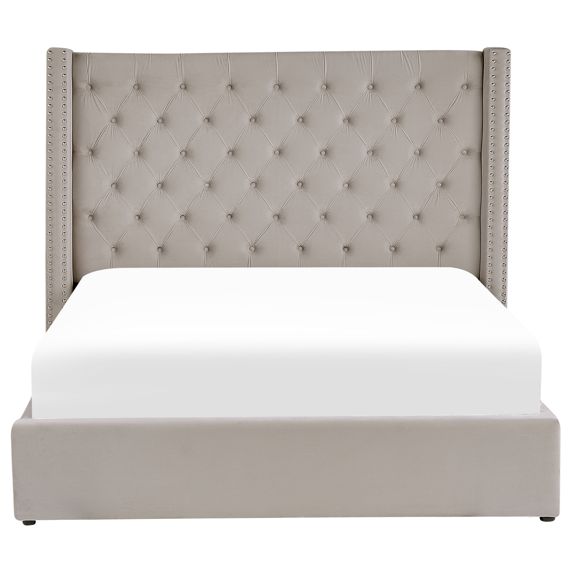 Beschreibung: Dieses schicke Bett setzt den raffinierten Chesterfield-Stil gekonnt um und bringt sowohl Eleganz als auch einen fabelhaften Komfort in Ihr Schlafzimmer. Der robuste Bettrahmen und das hohe Kopfteil sind mit einem geschmeidigen, hochqualitativen Samtbezug ummantelt. Zudem ist das Bett-Kopfteil mit einer edlen Diamant-Steppung, passenden Knöpfen, silberfarbenen Nieten und Seitenflügeln ergänzt. Die soliden Kunststoffbeine garantieren nicht nur einen stabilen Stand, sie unterstreichen auch den vorteilhaften Look des Samtbettes. Der mitgelieferte Lattenrost sorgt für eine gute Nachtruhe und lässt sich einfach hochklappen, um den gerämigen Bettkasten zu enthüllen, der Ihnen mehr Platz für Ihre Bettwäsche oder andere Kleinigkeiten bietet. Material: Samtstoff. Zusätzliches Material: Kiefernholz, Kunststoff, Sperrholz, Eukalyptus, Eisen. Material Zusammensetzung: 100% Polyester Gewicht: 75 Montage: Nicht montiert Holzart: Pinus massoniana, Eucalyptus grandis Holzursprung: China Gewichtskapazität: 200 Beine Höhe: 3 Schlafende Oberfläche: 180x200 Das Angebot beinhaltet: 1 x Federholzlattenrost (Anzahl der Latten: 42), 1 x Bettrahmen mit Stauraum, Nicht im Lieferumfang enthalten: Matratze, Bettwäsche und Kissen Höhe: 144 zusätzliche Information: Die auf den Fotos dargestellte Matratze ist 20 cm hoch, daher ist eine ähnlich hohe Matratze empfehlenswert., Bitte beachten Sie, dass Samtstoff unter verschiedenen Lichtverhältnissen eine andere Optik haben kann – das Material schimmert bei Tageslicht stärker und wirkt bei künstlicher Beleuchtung in Innenräumen eher gedämpft. Aufgrund der glatten, hochdichten Struktur des Gewebes kann sein Farbton auch variieren, wenn man mit der Hand in verschiedene Richtungen und Winkel über den Stoff fährt. Um den Farbton auszugleichen und Druckstellen zu vermeiden, sollte der Webstoff sanft mit einer offenen Handfläche in eine Richtung gestrichen, mit einem feuchten Tuch abgewischt oder einem Dampfbügeleisen gebügelt werden. Breite: 210 Länge: 217 Art: Bett mit Stauraum Stil: Retro Allgemeine Farbe: Silber Schatten: Hellgrau Hauptmaterial: Samtstoff Stoff gepolstert zurück: Nein