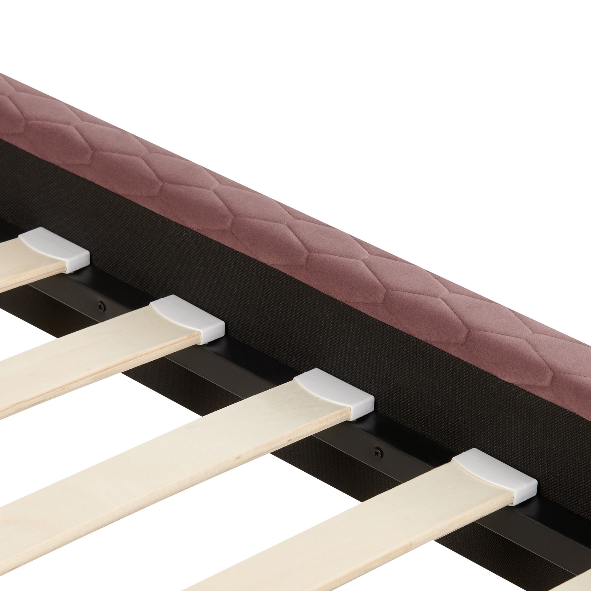 Beschreibung: Dieses moderne Bett ist ideal für jedes Schlafzimmer – es schafft eine perfekte Balance zwischen Eleganz und Schlichtheit. Das gesteppte Kopfteil in rechteckiger Form sowie die Seiten des Betts sind mit einem weichen, pflegeleichten Samtstoff versehen. Die Holzkonstruktion sorgt für Stabilität, während die stilvollen Beine aus dunklem Holz das Gesamtkonzept wunderbar ausgleichen. Material: Samtstoff. Zusätzliches Material: Kiefernholz, Gummibaumholz. Material Zusammensetzung: 100% Polyester Gewicht: 25 Montage: Nicht montiert Holzart: Pinus massoniana, Havea brasiliensis Holzursprung: China Gewichtskapazität: 200 Beine Höhe: 18 Schlafende Oberfläche: 90x200 Das Angebot beinhaltet: 1 x Bettrahmen, 1 x Federholzlattenrost (Anzahl der Latten: 14), Nicht im Lieferumfang enthalten: Matratze, Bettwäsche und Kissen Höhe: 121 zusätzliche Information: Die auf den Fotos dargestellte Matratze ist 20 cm hoch, daher ist eine ähnlich hohe Matratze empfehlenswert., Bitte beachten Sie, dass Samtstoff unter verschiedenen Lichtverhältnissen eine andere Optik haben kann – das Material schimmert bei Tageslicht stärker und wirkt bei künstlicher Beleuchtung in Innenräumen eher gedämpft. Aufgrund der glatten, hochdichten Struktur des Gewebes kann sein Farbton auch variieren, wenn man mit der Hand in verschiedene Richtungen und Winkel über den Stoff fährt. Um den Farbton auszugleichen und Druckstellen zu vermeiden, sollte der Webstoff sanft mit einer offenen Handfläche in eine Richtung gestrichen, mit einem feuchten Tuch abgewischt oder einem Dampfbügeleisen gebügelt werden. Breite: 101 Länge: 212 Art: Bett mit Lattenrost Stil: Retro Allgemeine Farbe: Rosa Hauptmaterial: Samtstoff Stoff gepolstert zurück: Nein