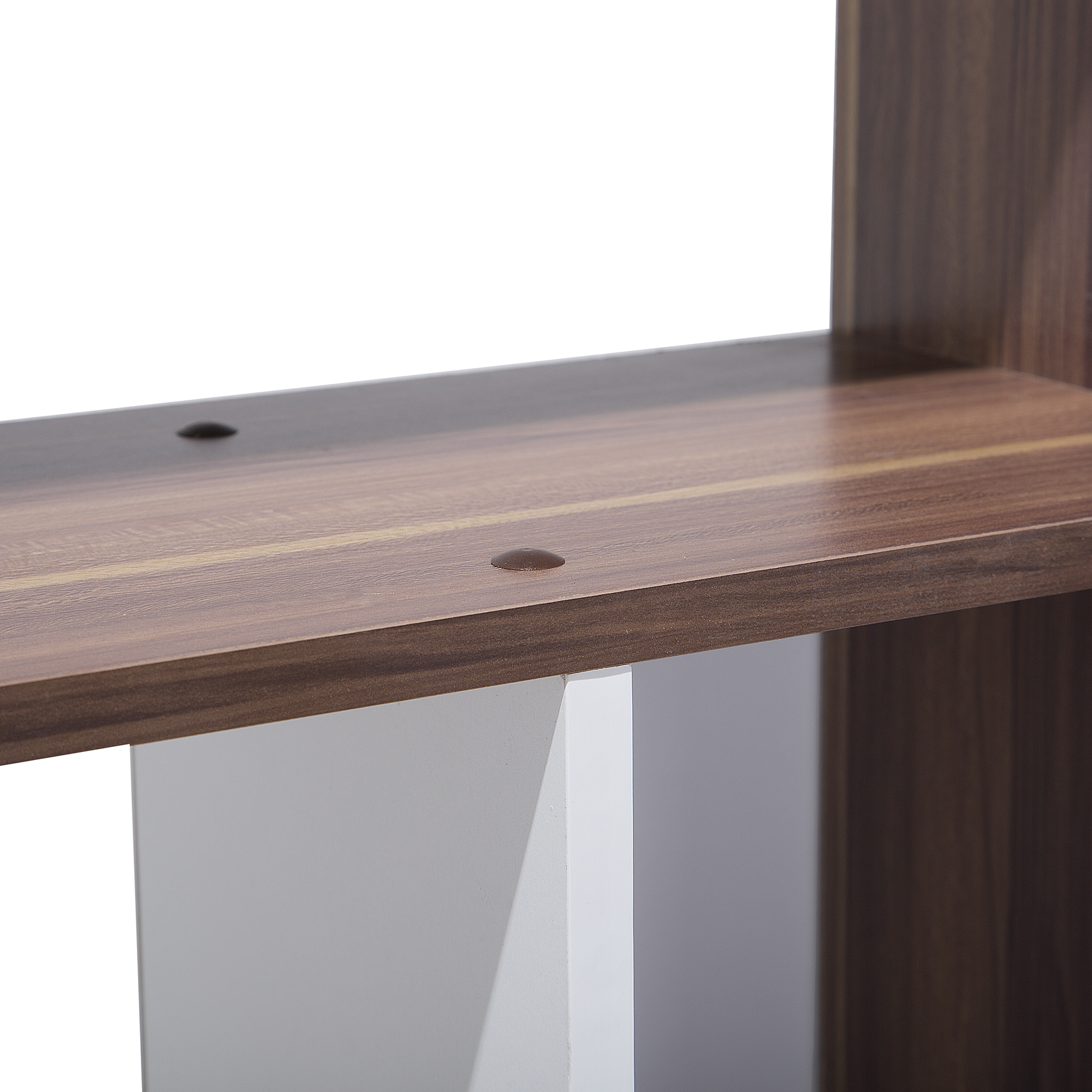 Das ausgefallene Bücherregal in dunklem Holzfarbton und Weiss eignet sich als praktischer Stauraum für Ihre Bücher sowie als Ausstellungsfläche für schöne Deko-Elemente, und es ist dank seiner offenen Struktur auch hervorragend als Raumteiler zu nutzen. Die versetzte Anordnung der grösseren, offenen und kleineren, geschlossenen Fächer verleihen dem robusten Regal einen spielerischen Effekt und eine dynamische Ausstrahlung. Material: MDF-Platte. Zusätzliches Material: Spanplatte. Gewicht: 27 Montage: Nicht montiert Das Angebot beinhaltet: 1 x Regal Höhe: 174 zusätzliche Information: Bitte beachten: Aus Sicherheitsgründen muss das Produkt an der Wand montiert werden. Breite: 83 Tiefe: 23 Art: Bücherregal mit 5 Fächern Stil: Skandinavisch Allgemeine Farbe: Dunkler Holzfarbton Hauptmaterial: MDF-Platte