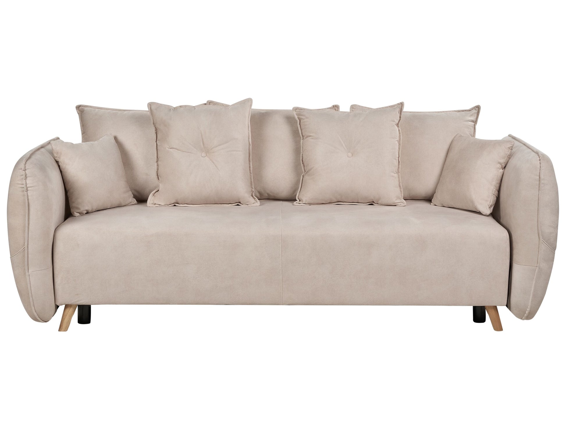 Dieses Polstersofa liefert mehr als nur einen königlichen Sitzkomfort, denn es verfügt sowohl über eine integrierte Schlaffunktion als auch über einen versteckten Stauraum. Die hohen Armlehnen unterstreichen nicht nur den Komfort, sie verzaubern auch mit ihren dicken Nähten. Zudem verfügt das Sofa über zusätzliche Seitentaschen, in denen Sie Ihre Fernbedienungen oder andere Kleinigkeiten griffbereit verstauen können. Geniessen Sie dabei auch die Vielseitigkeit der unterschiedlich grossen Kissen, die alle mit leicht abnehmbaren und pflegeleichten Bezügen ausgestattet sind. Material: Samtstoff. Zusätzliches Material: Gummibaumholz, Sperrholz, Kunststoff. Material Zusammensetzung: 100% Polyester Gewicht: 86 Kapazität: 2 Personen Montage: Nicht montiert Holzart: Havea brasiliensis Holzursprung: China Kissen Abmessungen: 55x46x20 Beine Höhe: 12 Polsterstärke: 36 Sitzhöhe: 48 Schlafende Oberfläche: 147x194 Das Angebot beinhaltet: 1 x Sofa, 4 x Zierkissen Sitzfläche: 194x78 Höhe: 77 zusätzliche Information: Bitte beachten Sie, dass Samtstoff unter verschiedenen Lichtverhältnissen eine andere Optik haben kann – das Material schimmert bei Tageslicht stärker und wirkt bei künstlicher Beleuchtung in Innenräumen eher gedämpft. Aufgrund der glatten, hochdichten Struktur des Gewebes kann sein Farbton auch variieren, wenn man mit der Hand in verschiedene Richtungen und Winkel über den Stoff fährt. Um den Farbton auszugleichen und Druckstellen zu vermeiden, sollte der Webstoff sanft mit einer offenen Handfläche in eine Richtung gestrichen, mit einem feuchten Tuch abgewischt oder einem Dampfbügeleisen gebügelt werden. Breite: 234 Tiefe: 104 Art: Schlafsofa Stil: Modern Allgemeine Farbe: Beige Schatten: Creme Hauptmaterial: Samtstoff Füllmaterial: Schaumstoff Arm Stil: Gerade