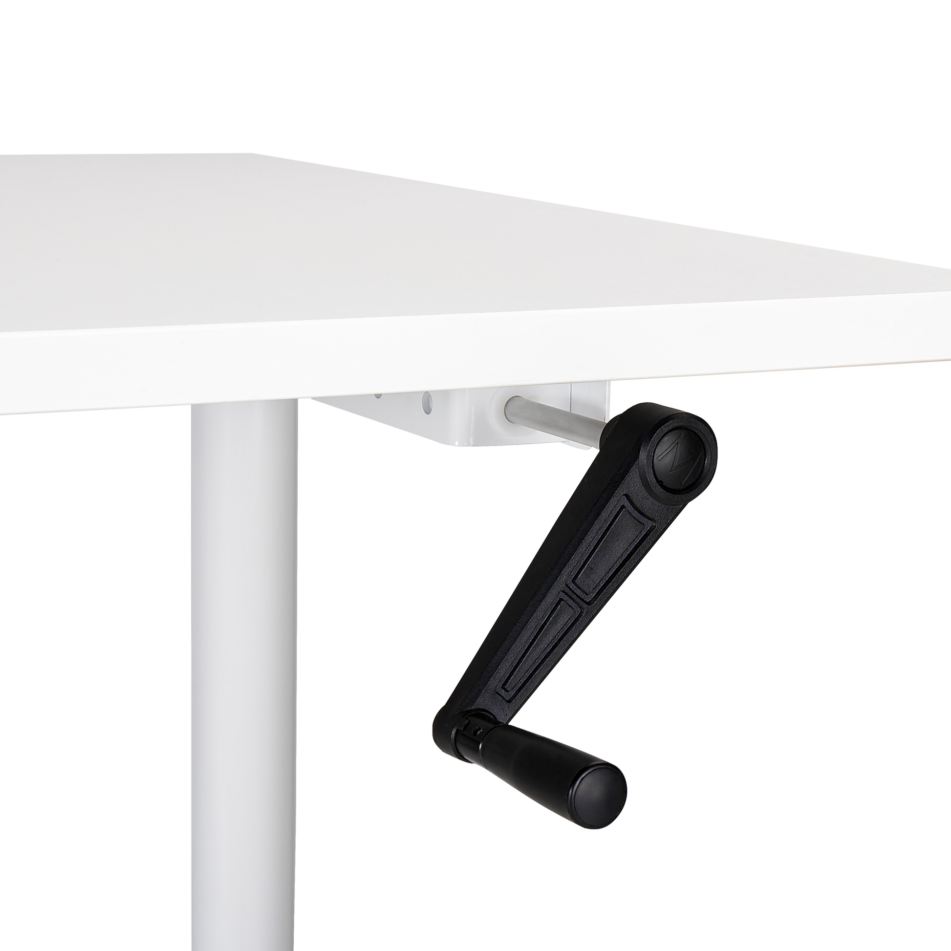 Passen Sie Ihren eigenen Arbeitsplatz ganz nach Ihren individuellen Bedürfnissen an. Mit einem manuell höhenverstellbaren Tischgestell mit teleskopischen, runden Tischbeinen aus weissem, pulverbeschichtetem Stahl können Sie Ihren Arbeitsplatz im Handumdrehen ergonomisch gestalten. Dadurch haben Sie die Möglichkeit, sitzende und stehende Tätigkeiten angenehm ab zu wechseln. Mit einem Kurbelmechanismus verwandeln Sie in nur wenigen Sekunden Ihren Bürotisch in einen praktischen Stehtisch. Die robuste, weisse Tischplatte verfügt über eine strapazierfähige, nahezu kratzfeste Melaminbeschichtung. Material: Faserplatte. Zusätzliches Material: Stahl. Gewicht: 30 Montage: Nicht montiert Gewichtskapazität: 70 Beine Höhe: 71-116 Das Angebot beinhaltet: 1 x Schreibtisch Höhe: 74-119 zusätzliche Information: Um die Haltbarkeit und die Ästhetik der Arbeitsplatte zu erhalten, sollte man Platzsets und Untersetzer verwenden und feuchte Stellen schnellstmöglich trocken wischen, um Produktschäden zu vermeiden. Gestalten: Rechteckig Breite: 120 Tiefe: 72 Art: Verstellbarer Schreibtisch Stil: Modern Allgemeine Farbe: Weiss Hauptmaterial: Faserplatte