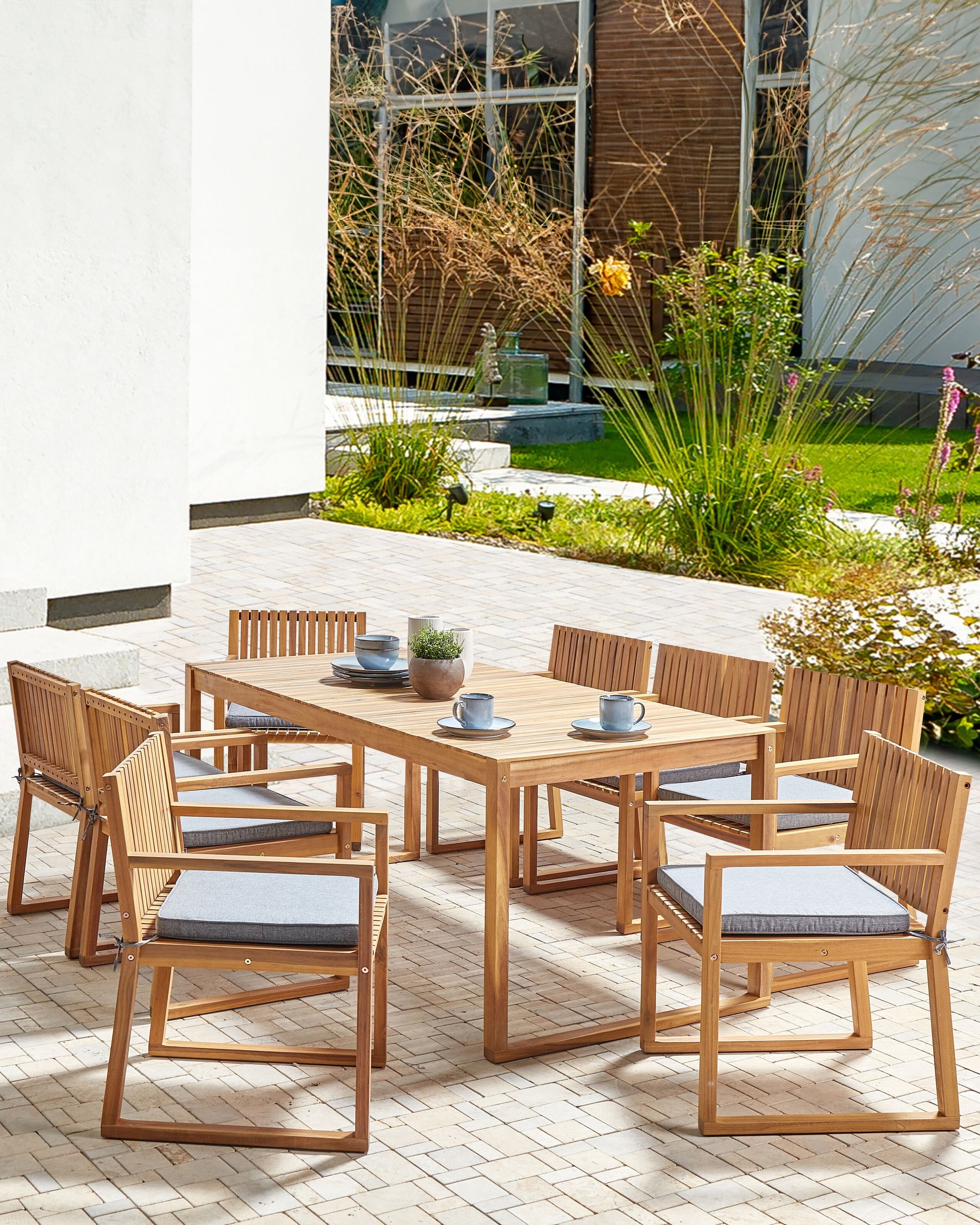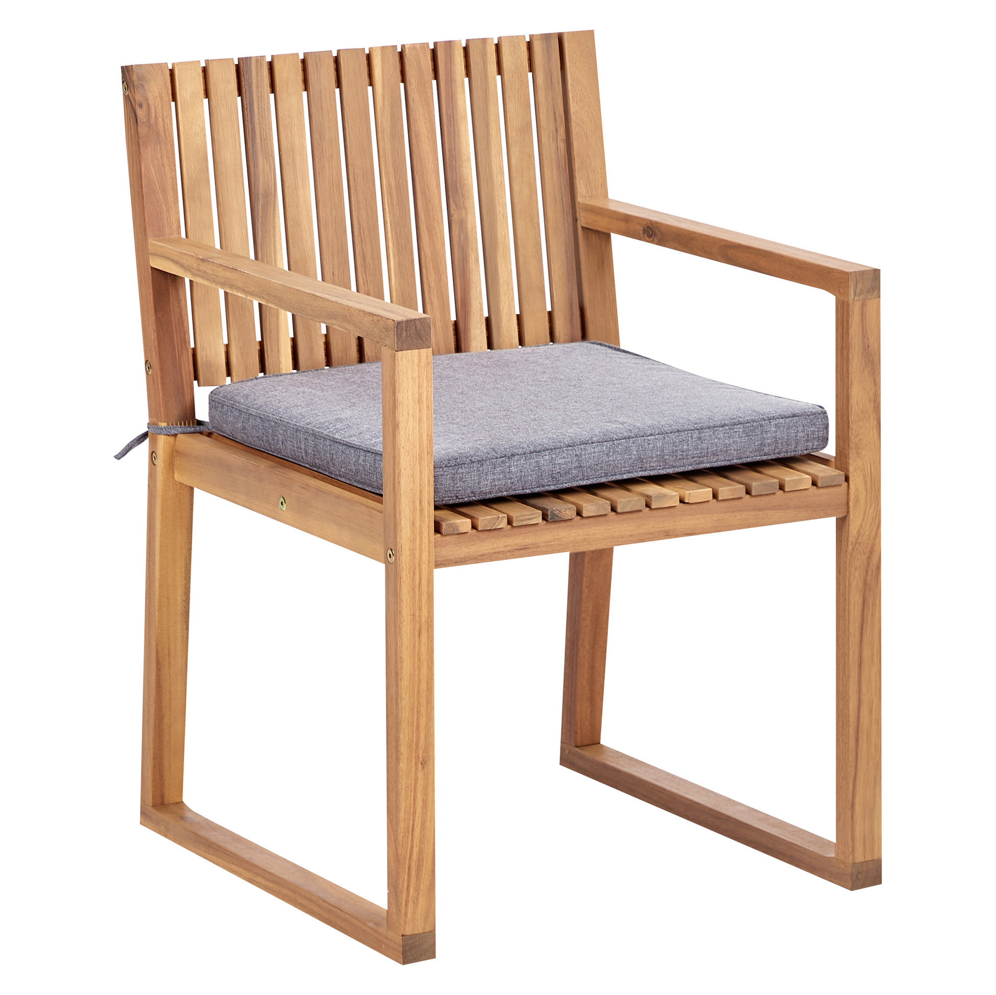Dieses komfortable und besonders attraktive Gartenstuhl Set aus robustem, pflegeleichtem und beständigem zertifiziertem Akazienholz lädt zum entspannten Verweilen im Garten, auf dem Balkon oder auf der Terrasse ein. Die gradlinige und zugleich ausgefallene Formgebung der schrägen Rückenlehnen, die Gestaltung aus schlanken Latten, praktische Armlehnen und Stuhlbeine in Kufenform unterstreichen das trendy Design. Zudem sorgen die bequemen, weichen Sitzkissen für extra Komfort und überzeugen mit ihrer angesagten Farbe.  Material: FSC® zertifiziertes Akazienholz. Zusätzliches Material: Polyester.  Material Zusammensetzung: 100% Polyester Gewicht: 9 Montage: Nicht montiert Holzart: Acacia mangium Holzursprung: Vietnam Gewichtskapazität: 110 Kissen Abmessungen: 46x46x5 Polsterstärke: 5 Sitzhöhe: 43 Das Angebot beinhaltet: 8 x Stühle, 8 x Sitzkissen Sitzfläche: 46x46 Höhe: 80 zusätzliche Information: Um sicherzustellen, dass die Konstruktion stabil und die Nutzungssicherheit gewährleistet ist, sollte man 2 Wochen nach dem Zusammenbau überprüfen, ob die Ware auch korrekt montiert wurde. Ausserdem ist alle 3 Monate zu prüfen, ob die Schrauben richtig festgezogen sind., Damit das folgende Produkt jahrelang seine Schönheit beibehält, stellen wir Ihnen ein ausführliches Pflegehandbuch zur Verfügung. Die Pflegeanleitung und Tipps zur richtigen Wartung Ihres neuen Produkts finden Sie finden Sie unten im Abschnitt „Verpackung und Montage“. Breite: 54 Tiefe: 59 Art: Gartenstuhl Stil: Rustikal Allgemeine Farbe: Heller Holzfarbton Hauptmaterial: FSC® zertifiziertes Akazienholz