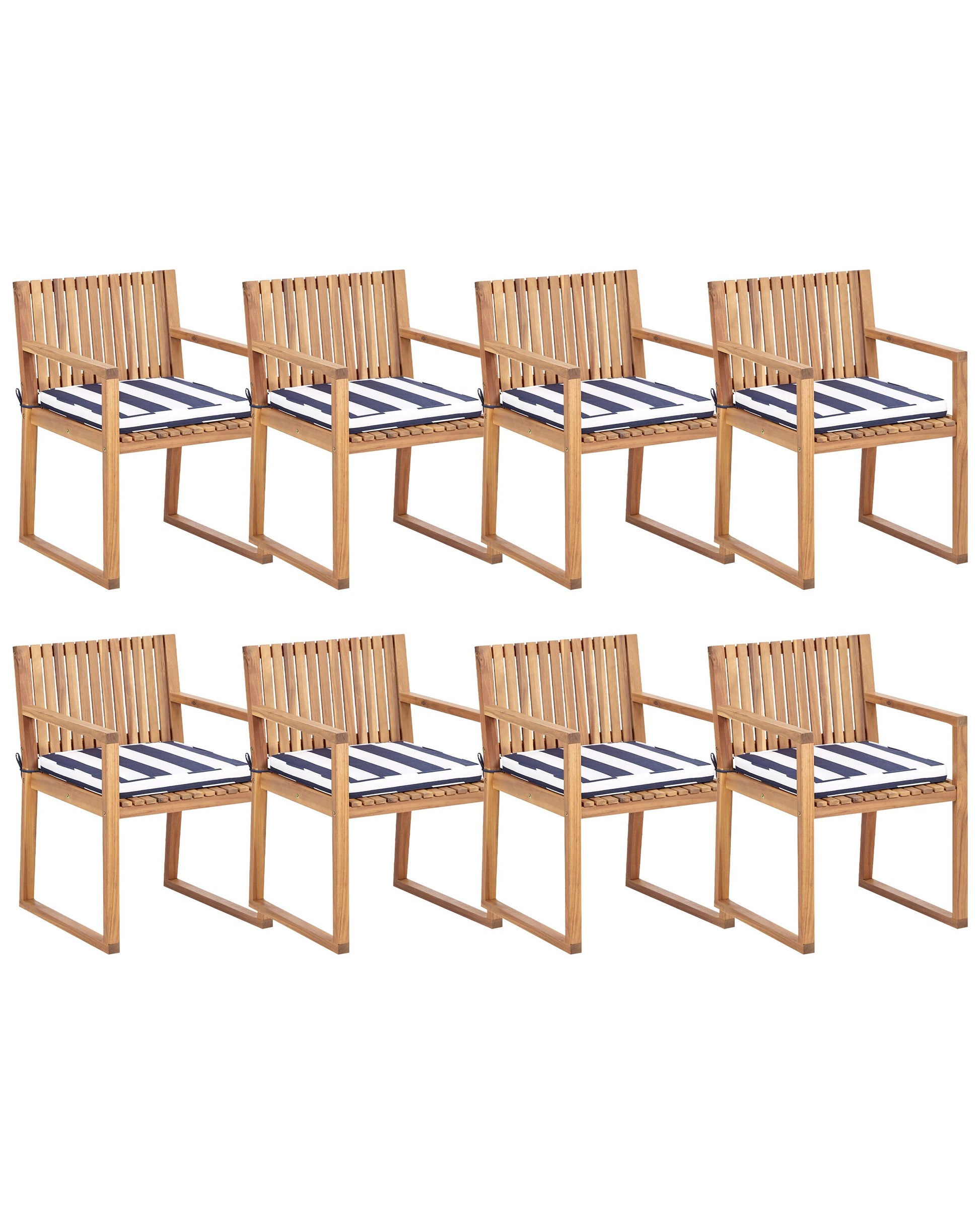 Beschreibung: Dieses komfortable und besonders attraktive Gartenstuhl Set aus robustem, pflegeleichtem und beständigem zertifiziertem Akazienholz lädt zum entspannten Verweilen im Garten, auf dem Balkon oder auf der Terrasse ein. Die gradlinige und zugleich ausgefallene Formgebung der schrägen Rückenlehnen, die Gestaltung aus schlanken Latten, praktische Armlehnen und Stuhlbeine in Kufenform unterstreichen das trendy Design. Zudem sorgen die bequemen, weichen Sitzkissen für extra Komfort und überzeugen mit ihrer angesagten Farbe. Material: FSC® zertifiziertes Akazienholz. Zusätzliches Material: Polyester. Material Zusammensetzung: 100% Polyester Gewicht: 9 Montage: Nicht montiert Holzart: Acacia mangium Holzursprung: Vietnam Gewichtskapazität: 110 Kissen Abmessungen: 46x46x5 Polsterstärke: 5 Sitzhöhe: 43 Das Angebot beinhaltet: 8 x Stühle, 8 x Sitzkissen Sitzfläche: 46x46 Höhe: 80 zusätzliche Information: Um sicherzustellen, dass die Konstruktion stabil und die Nutzungssicherheit gewährleistet ist, sollte man 2 Wochen nach dem Zusammenbau überprüfen, ob die Ware auch korrekt montiert wurde. Ausserdem ist alle 3 Monate zu prüfen, ob die Schrauben richtig festgezogen sind., Damit das folgende Produkt jahrelang seine Schönheit beibehält, stellen wir Ihnen ein ausführliches Pflegehandbuch zur Verfügung. Die Pflegeanleitung und Tipps zur richtigen Wartung Ihres neuen Produkts finden Sie finden Sie unten im Abschnitt „Verpackung und Montage“. Breite: 54 Tiefe: 59 Art: Gartenstuhl Stil: Rustikal Allgemeine Farbe: Heller Holzfarbton Schatten: Marineblau Hauptmaterial: FSC® zertifiziertes Akazienholz