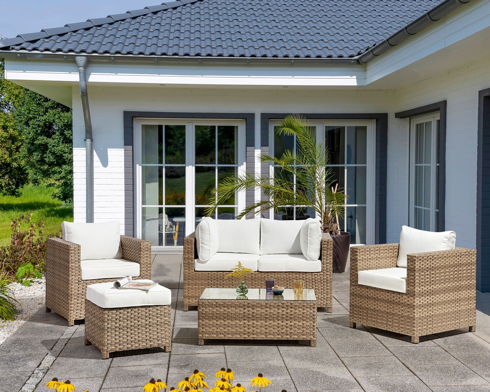 Beigefarbenes, witterungsbeständiges Polyrattan kombiniert mit hellen, freundlichen und bequemen Polstern und Kissen. Qualitativ hochwertiges und robustes Material schafft ein elegantes und geschmackvolles Design. Die Gartenbank und die beiden Gartensessel mit komfortablen, breiten Armlehnen laden zum entspannten Geniessen und Faulenzen in der Sonne ein und der multifunktionale Hocker dient als bequeme Fussstütze, praktische Ablage oder zusätzliche Sitzgelegenheit. Material: PE Rattan. Zusätzliches Material: Sicherheitsglas, Polyester, Aluminium. Material Zusammensetzung: 100% Polyester Gewicht: 59.5 Kapazität: 4 Personen Montage: Benötigt keine Montage Gesamtabmessungen: 140x75x69 Polsterstärke: 10 Osmanische Dimensionen: 51x51x35 2 Sitzer Sofa Abmessungen: 140x75x69 Couchtisch Abmessungen: 90x50x35 Sitzhöhe: 38 Sessel Abmessungen: 74x75x69 Das Angebot beinhaltet: 1 x Tisch, 1 x Zweisitzer, 2 x Sessel, Kissen sind im Lieferumfang enthalten, 1 x Ottomane zusätzliche Information: Damit das folgende Produkt jahrelang seine Schönheit beibehält, stellen wir Ihnen ein ausführliches Pflegehandbuch zur Verfügung. Die Pflegeanleitung und Tipps zur richtigen Wartung Ihres neuen Produkts finden Sie finden Sie unten im Abschnitt „Verpackung und Montage“. Art: Lounge Set mit Tisch Stil: Skandinavisch Allgemeine Farbe: Beige Schatten: Cremeweiss Hauptmaterial: PE Rattan