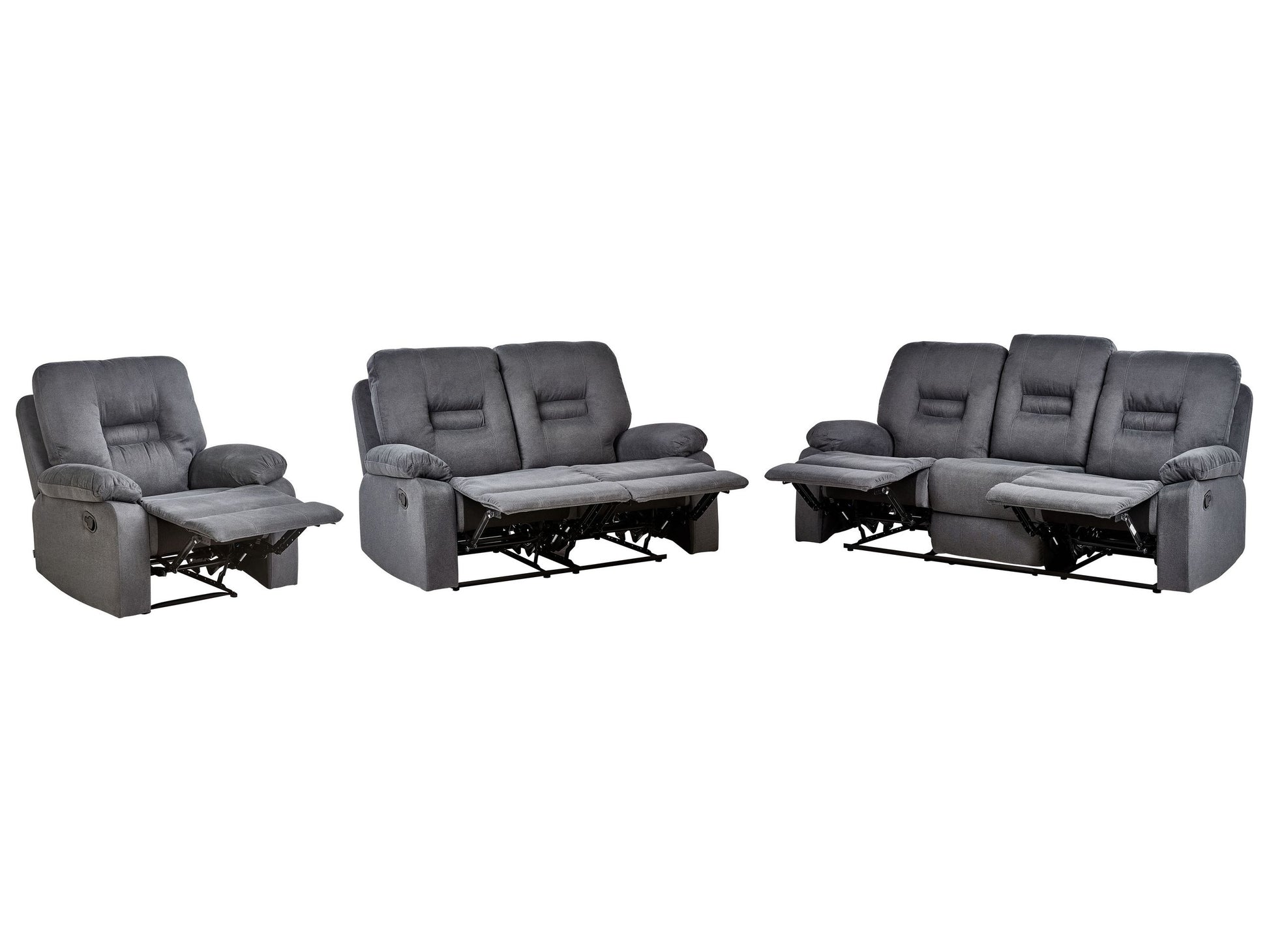 Diese Sitzgarnitur aus hochwertigem, dunkelgrauem Material im klassischen Design besteht aus einem Sessel, einem Zweisitzer und einem Dreisitzer. Jeder Sitzplatz, mit Ausnahme des mittleren Sitzes des Dreisitzers, ist individuell verstellbar und lässt sich somit ganz an Ihre Wünsche anpassen. Mit den seitlich angebrachten Handgriffen lassen sich die Fussstützen hochklappen und mittels Gewichtsverlagerung können die Rückenlehnen nach hinten verstellt werden. Material: Polyester. Zusätzliches Material: Stahl, Sperrholz. Material Zusammensetzung: 100% Polyester Gewicht: 157 Kapazität: 6 Personen Montage: Teilweise montiert Holzart: Populus Holzursprung: China Gesamtabmessungen: 204x73x101 Polsterstärke: 24 3 Sitzer Sofa Abmessungen: 204x73x101 2 Sitzer Sofa Abmessungen: 146x73x101 Sitzhöhe: 49 Sessel Abmessungen: 85x74x101 Das Angebot beinhaltet: 1 x Zweisitzer, 1 x Dreisitzer, 1 x Sessel zusätzliche Information: Damit die beste Benutzerfreundlichkeit gewährleistet wird, sollte der Abstand zwischen der Rückenlehne und der Wand ca. 15 cm betragen. Art: Wohnzimmer Set Stil: Modern Allgemeine Farbe: Grau Schatten: Dunkelgrau Hauptmaterial: Polyester Füllmaterial: Schaumstoff Arm Stil: Mit Kissen