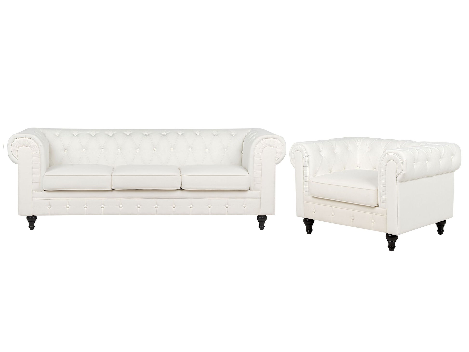 Beschreibung: Dieses Sofa Set zeichnet sich durch seine klassische Form mit breiten, abgerundeten Armlehnen aus und versprüht dank des typisch eleganten Chesterfield-Stils einen ganz besonderen Charme im Raum. Die niedrigen Rückenlehnen sowie die weichen, dick gepolsterten Sitzkissen bieten ein angenehmes Sitzgefühl. Der englische Klassiker passt vor allem zu traditionellen und modernen Einrichtungen. Material: Polyester. Zusätzliches Material: Eukalyptus. Material Zusammensetzung: 100% Polyester Gewicht: 86 Kapazität: 4 Personen Montage: Beine / Füsse nicht montiert Holzart: Eucalypteae Holzursprung: China Gesamtabmessungen: 222x85x78 Beine Höhe: 12 Polsterstärke: 16 3 Sitzer Sofa Abmessungen: 222x85x79 Sitzhöhe: 48 Sessel Abmessungen: 112x85x79 Das Angebot beinhaltet: 1 x Dreisitzer, 1 x Sessel Art: Wohnzimmer Set Stil: Klassisch Allgemeine Farbe: Weiss Schatten: Cremeweiss Hauptmaterial: Polyester Füllmaterial: Schaumstoff Arm Stil: Abgerundet