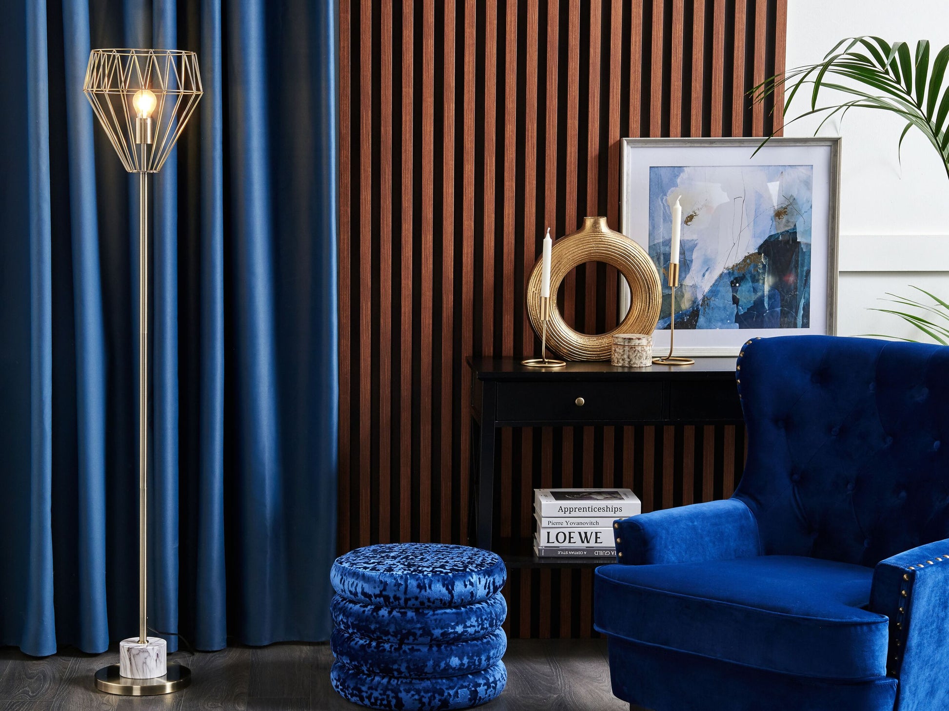 Modernes Design auf höchstem Niveau. Schlanke Formen in messingfarbenem Metall betonen die elegante Ausstrahlung dieser Stehlampe. Der diamantförmige Lampenschirm besteht aus einem Gitter aus filigranen Metallstreben und lenkt den Blick dank seiner offenen Gestaltung ganz gezielt auf das Leuchtmittel. Die offene Struktur zaubert spannende Licht- und Schatteneffekte auf Ihre Wände. Ein runder Lampenfuss aus Marmor und Metall sorgt für Stabilität.  Material: Metall. Zusätzliches Material: PVC.  Gewicht: 5 Montage: Teilweise montiert Das Angebot beinhaltet: 1 x Stehleuchte, Nicht im Lieferumfang enthalten: Leuchtmittel Höhe: 160 zusätzliche Information: Diese Leuchte ist geeignet für Leuchtmittel der Energieklassen A bis G auf einer Skala von A (sehr effizient) bis G (weniger effizient). Geeignet für: LED Leuchtmittel, Eco-Halogen Leuchtmittel, Energiesparleuchtmittel., Die Stromkabel dürfen nur von einem qualifizierten Elektriker angepasst werden. Breite: 30 Tiefe: 30 Art: Stehlampe Stil: Industriell Allgemeine Farbe: Messing Hauptmaterial: Metall Fassung: Max. 60 W IP Protection Code: IP 20
