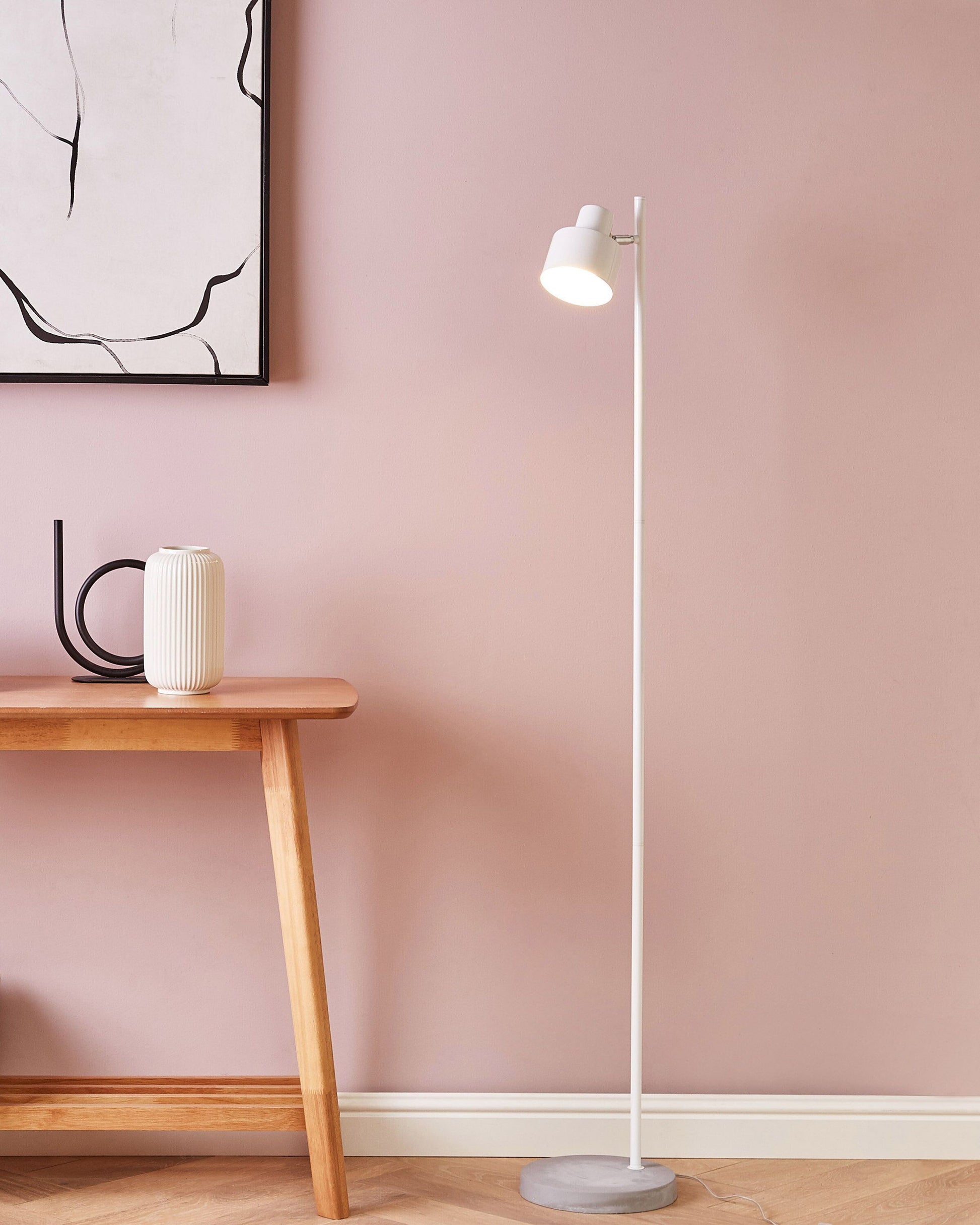 Die moderne Stehleuchte begeistert mit schlichter, klassischer Formgebung und hochwertiger Verarbeitung. Der Materialmix aus weissem Metall und einem stabilen, runden Fuss aus hellgrauem Beton verleiht der Leuchte industriellen Charme. Der praktische Lampenkopf ist ganz nach Bedarf verstellbar und sorgt für eine effektive Ausleuchtung. Die Leuchte ist mit einem transparenten Kabel mit Schalter ausgestattet.  Material: Metall. Zusätzliches Material: Kunststoff, Beton.  Gewicht: 3 Montage: Teilweise montiert Das Angebot beinhaltet: 1 x Stehleuchte, Nicht im Lieferumfang enthalten: Leuchtmittel Höhe: 149 zusätzliche Information: Diese Leuchte ist geeignet für Leuchtmittel der Energieklassen A bis G auf einer Skala von A (sehr effizient) bis G (weniger effizient). Geeignet für: LED Leuchtmittel, Eco-Halogen Leuchtmittel, Energiesparleuchtmittel., Die Stromkabel dürfen nur von einem qualifizierten Elektriker angepasst werden. Breite: 23 Tiefe: 23 Art: Stehleuchte Stil: Modern Allgemeine Farbe: Weiss Hauptmaterial: Metall Fassung: Max. 40 W IP Protection Code: IP 20