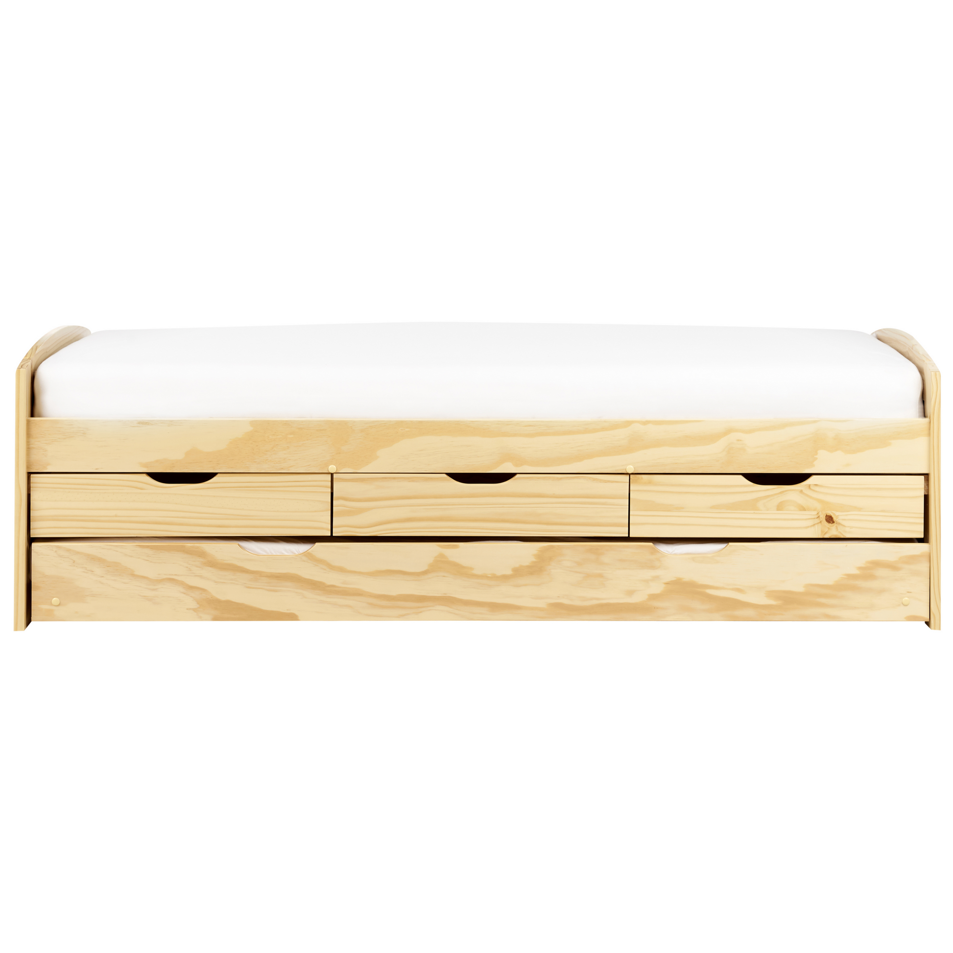 Beschreibung: Dieses Einzelbett punktet mit einem cleveren Design, das Funktionalität, eine angenehme Nachtruhe und mehr Charme ins Schlafzimmer bringt. Der Bettrahmen verfügt über geräumige Schubladen und ein integriertes Unterbett, das nach dem Schlafen wieder einfach unter das Bett geschoben werden kann. So ist mit dem Tagesbett nicht nur ein zusätzlicher Schlafplatz, sondern auch ein praktischer Stauraum für Spielzeug, Bettzeug oder Kleidung gegeben. Die schlichte Linienführung des Bettgestells und die natürliche Maserung des Kiefernholzes machen das Bett zu einer wundervollen Wahl für Wohn- oder Schlafbereiche, insbesondere für Kinder- oder Gästezimmer. Material: Kiefernholz. Gewicht: 50 Montage: Nicht montiert Holzart: Pinus taeda Holzursprung: Brasilien Gewichtskapazität: 120 Schlafende Oberfläche: 90x200 Das Angebot beinhaltet: 1 x Bettrahmen, 1 x Rollrost (Anzahl der Latten: 14), 1 x Rollrost (Anzahl der Latten: 11), Nicht im Lieferumfang enthalten: Matratze, Bettwäsche und Kissen Höhe: 63 zusätzliche Information: Um die Schublade problemlos zu schliessen, sollte die Höhe der unteren Matratze nicht mehr als 10 cm betragen., Dieses Produkt entspricht der Norm EN 71-3 und wurde gründlich getestet, um zu bestätigen, dass es keine schädlichen Mengen toxischer Substanzen enthält. Somit ist es sicher für den täglichen Gebrauch, insbesondere in Umgebungen, in denen Sicherheit eine Priorität ist., Das ausziehbare Bett ist so hergestellt, dass es auf einer niedrigeren Höhe bleibt und nicht bis zur oberen Matratze angehoben werden kann., Holz ist ein natürliches Material, daher bleibt die feine, natürliche Struktur und die ganz besondere Optik der Holzoberfläche trotz der Farbschicht erhalten. Breite: 99/190 Länge: 206 Art: Ausziehbett Stil: Skandinavisch Allgemeine Farbe: Heller Holzfarbton Hauptmaterial: Kiefernholz Stoff gepolstert zurück: Nein