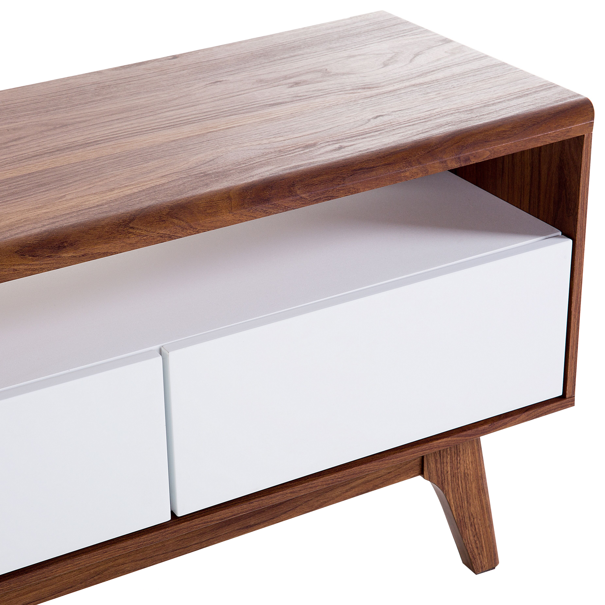 Der warme Walnussholzton des TV-Schranks harmoniert ausgezeichnet mit dem klassischen Weisston der Schubladenfronten. Er verfügt über 3 geräumige Schubladen mit griffloser Tip-on Technik. Oberhalb der Schubladen befindet sich ein dekoratives offenes Fach mit einer breiten Öffnung auf der Rückseite für all Ihre Kabel. Dieser fantastische Schrank bietet Ihnen ungeahnte Stauraummöglichkeiten sowohl für Ihren Fernseher als auch für alle Ihre Kleinigkeiten. Zudem kann das Lowboard sowohl als Fernsehschrank, Beistellschrank oder als Flurschrank genutzt werden. Material: MDF-Platte. Gewicht: 33 Montage: Nicht montiert Das Angebot beinhaltet: 1 x TV-Möbel Höhe: 53 zusätzliche Information: Um die Haltbarkeit und die Ästhetik der Arbeitsplatte zu erhalten, sollte man Platzsets und Untersetzer verwenden und feuchte Stellen schnellstmöglich trocken wischen, um Produktschäden zu vermeiden. Breite: 140 Tiefe: 39 Art: TV-Möbel Stil: Skandinavisch Allgemeine Farbe: Weiss Hauptmaterial: MDF-Platte