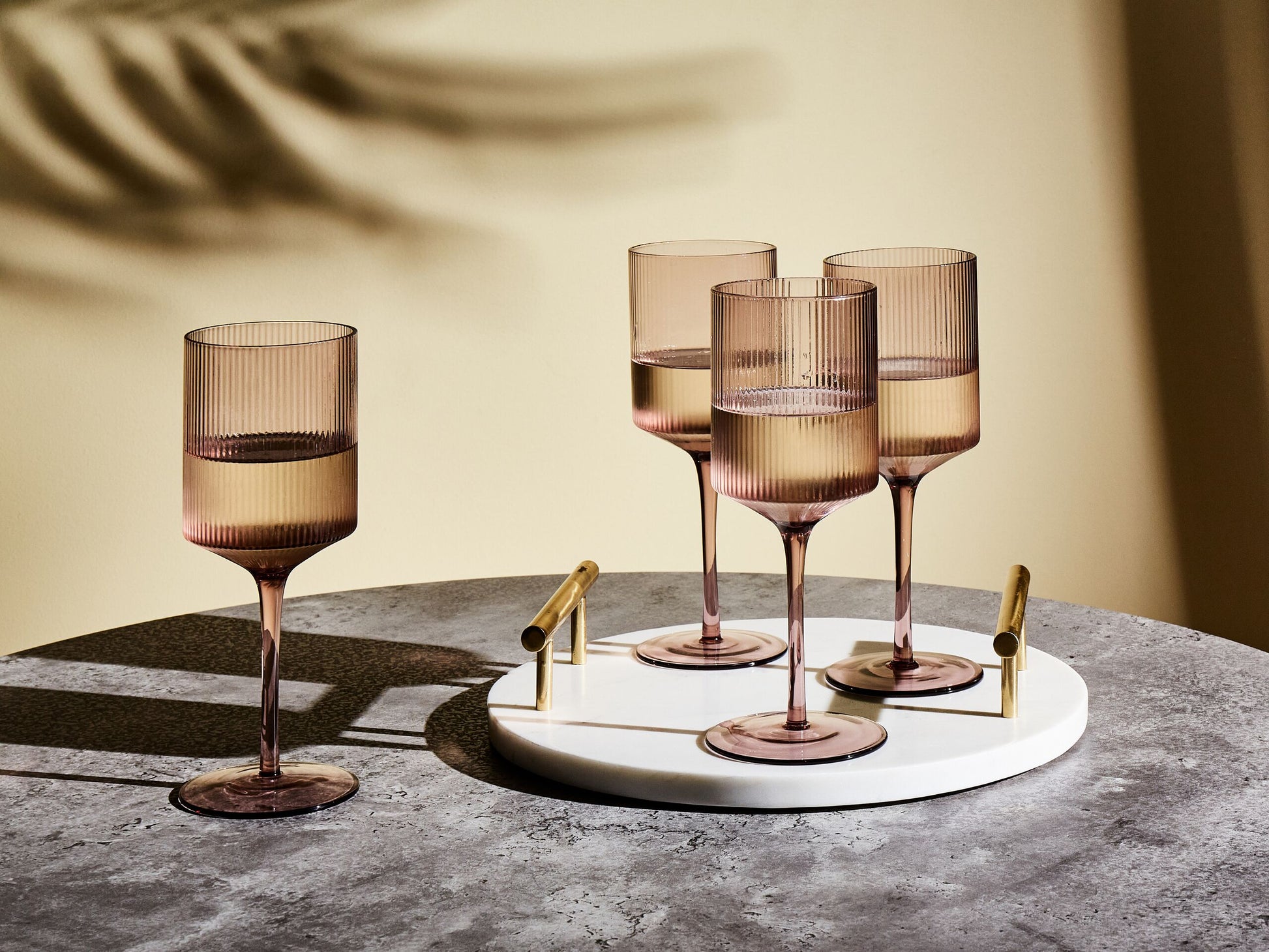 Verleihen Sie jedem Anlass ein luxuriöses Flair mit diesen eleganten Weingläsern. Die in hochwertiger Handarbeit gefertigten Gläser haben einen hohen Stiel und eine dezente, gerippte Oberfläche, welches Licht schön einfängt und reflektiert. Der zarte rosa Farbton verleiht den Weingläsern einen zeitlosen Vintage-Charme. Ausserdem sind die Gläser spülmaschinenfest, so dass sie sich nach einer Party mühelos reinigen lassen. Material: Glas. Gewicht: 0.8 Das Angebot beinhaltet: 1 x Trinkgläser-Set (4 Stück) Höhe: 21 zusätzliche Information: Hinweis! Beschädigungsgefahr! Bitte verwenden Sie keine Messer oder andere spitze oder scharfe Gegenstände, um die Verpackung zu öffnen, da das Produkt sonst beschädigt werden könnte., Bitte beachten Sie, dass jedes Produkt handgefertigt ist. Deshalb kann der Farbton und die Grösse leicht von dem Bild abweichen. Breite: 8 Tiefe: 8 Art: Weingläser im 4er Set Stil: Retro Allgemeine Farbe: Transparent Schatten: Pastellrosa Hauptmaterial: Glas