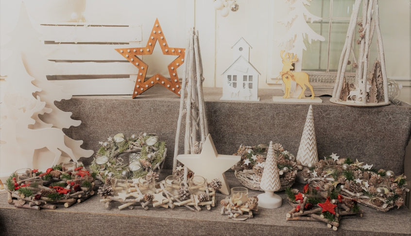 Mit Zweigen, Tannenzapfen und Sternen u. Kugeln in Rot