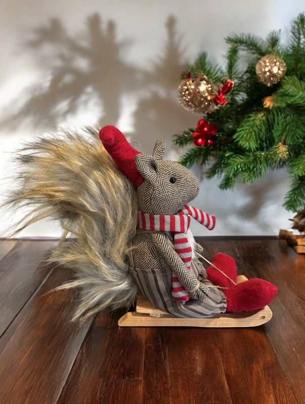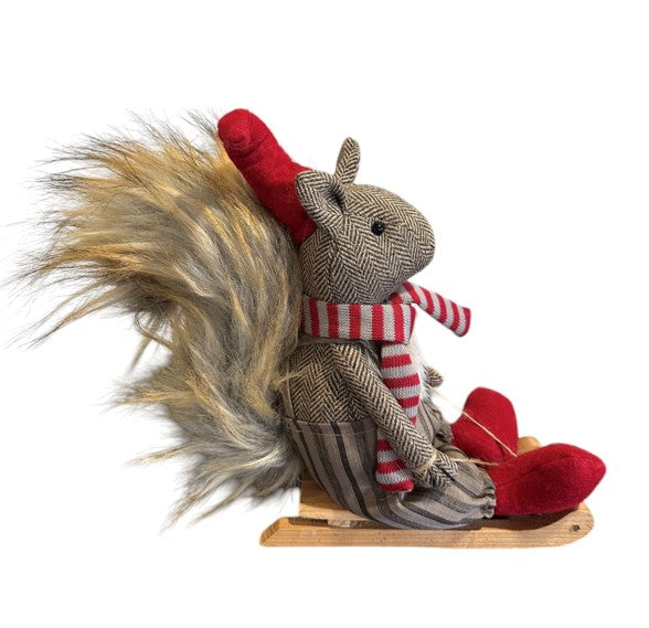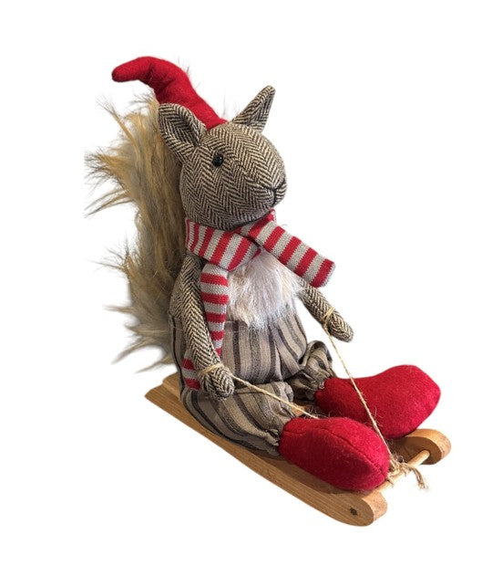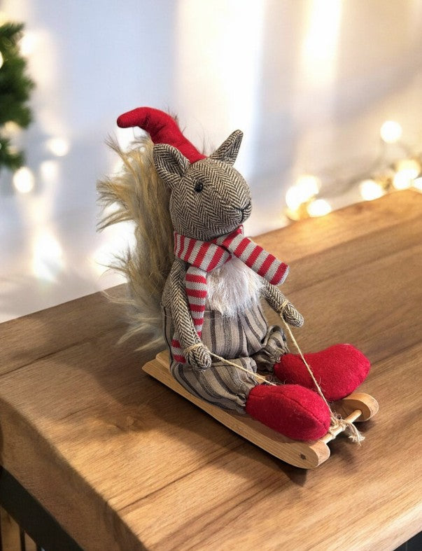 Deko Eichhörnchen auf Schlitten braun weiss mit roter Mütze