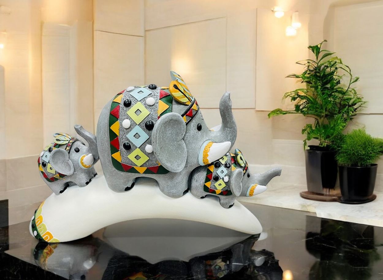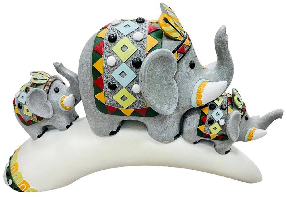 Deko Elefantengruppe grau mit buntem Sattel und Kopfschmuck 8.5 x 26.5 x 16.5cm