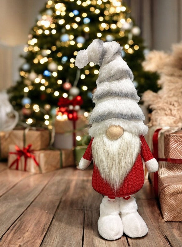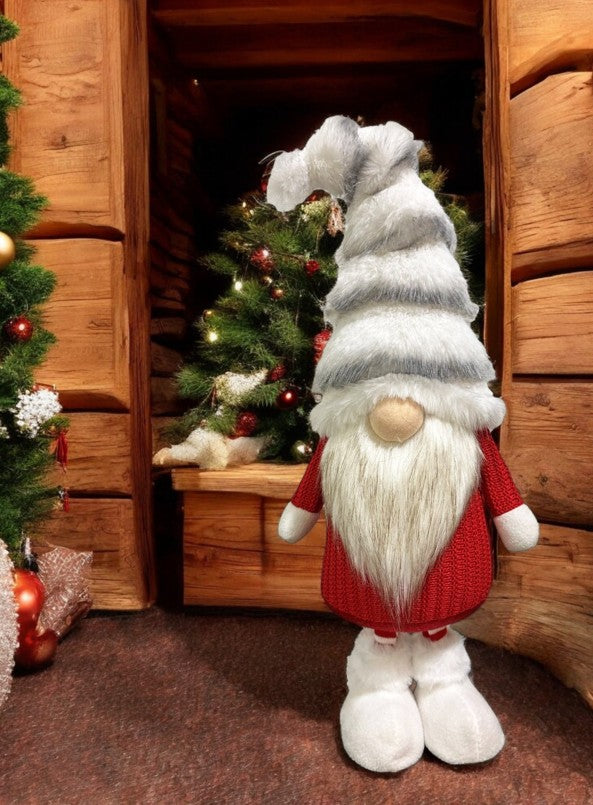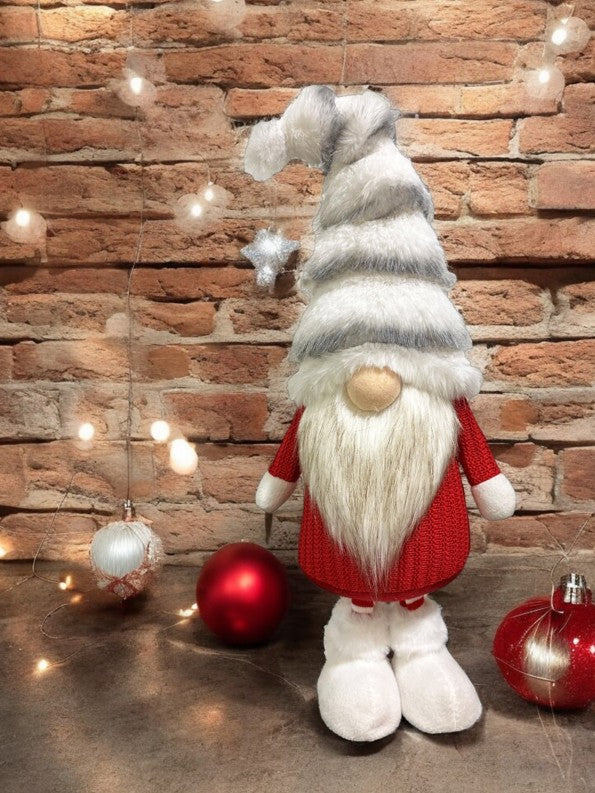 Deko Wichtel stehend rot weiss mit flauschiger Mütze grau weiss