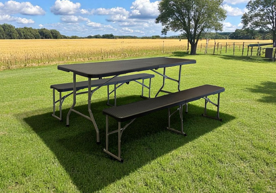 1 Tisch: 180x74cm 2 Bänke: 183x30cm Gestell: schwarz lackiert ein komplettes Set besteht aus 2 Karton (1xTisch) (2xBank) Online Versand möglich Material: HDPE 3.5 / 4.5cm, Stahlrohr 22 / 25mm (1mm dick)