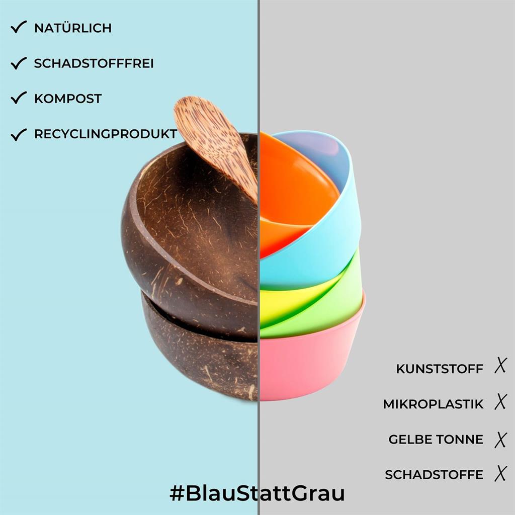 Durchmesser Schale: ca.13cm Länge Löffel: ca. 16cm aus recycelten Kokosnüssen Plastikfrei nachhaltig umweltfreundlich und biologisch abbaubar Jede Schüssel ein Unikat Handwäsche aber nicht zu lange einweichen In schönem Recyclingkarton verpackt