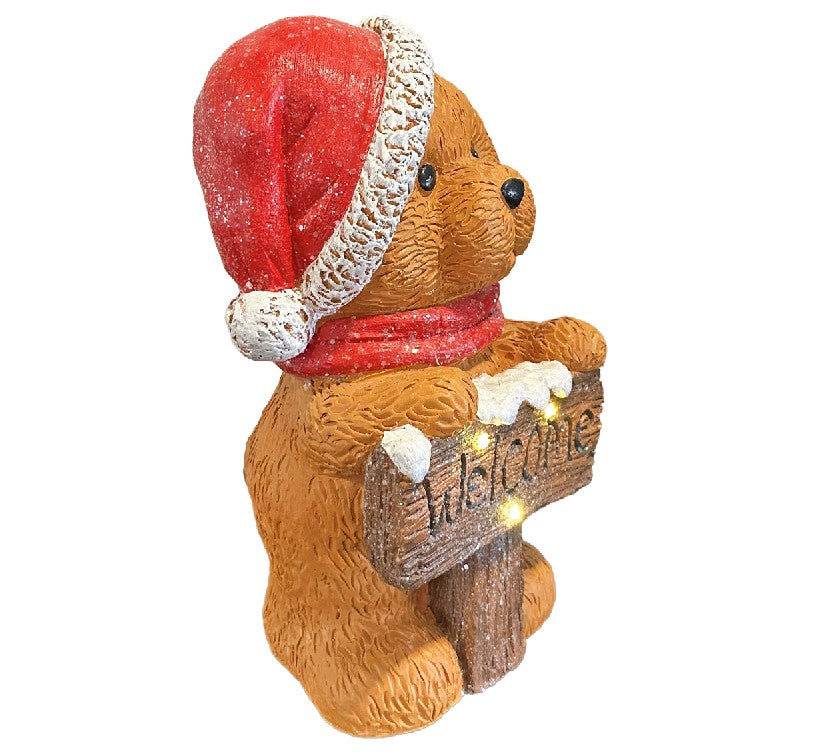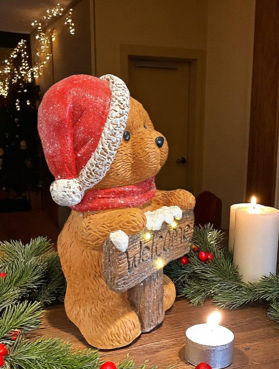 LED Deko Bär mit Schild Welcome und roter Mütze
